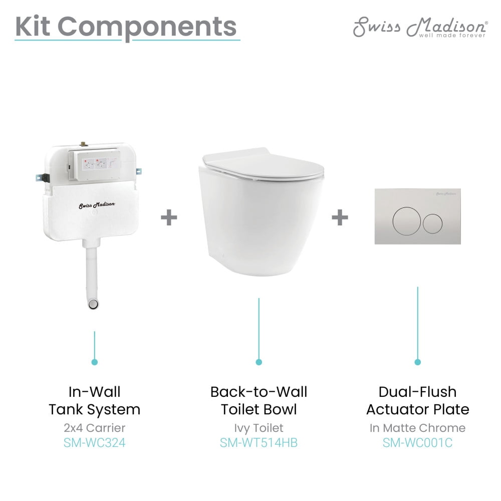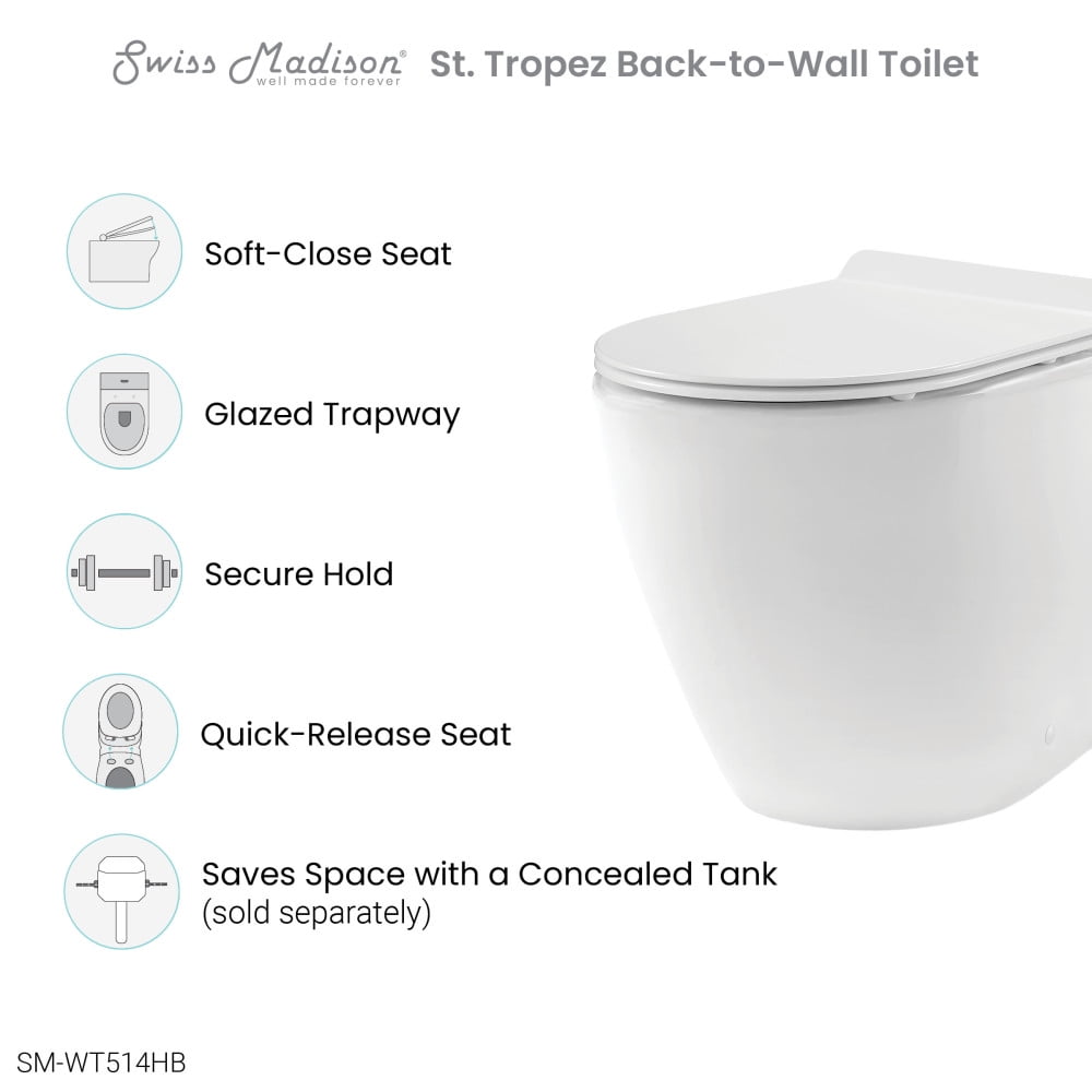 Space Saving: With the water tank in the wall, the Back-to-Wall toilet saves space in your bathroom and is aesthetically pleasing in design. Standard Elongated Bowl: Elongated bowl provides extra room and comfort. Durable Non-Porous Scratch Resistant Ceramic: Developed from ceramic, that is scratch-resistant and non-porous, providing a durable and reliable option that can withstand routine use. Soft Close and Quick Release Seat: Provides a silent and gentle closing mechanism for added convenience and safety. With just the push of a button, the seat detaches completely for a thorough cleaning. Standard Height: Between 15-17 inches, the standard height toilet is designed with ergonomic considerations, offering optimal comfort to users of all ages and body types. Required Components: Combined with the In-Wall Carrier tank system and the Actuator flush button; Sold separately. Collection: Part of the St. Tropez Collection, explore additional products in this collection to complete the room.
