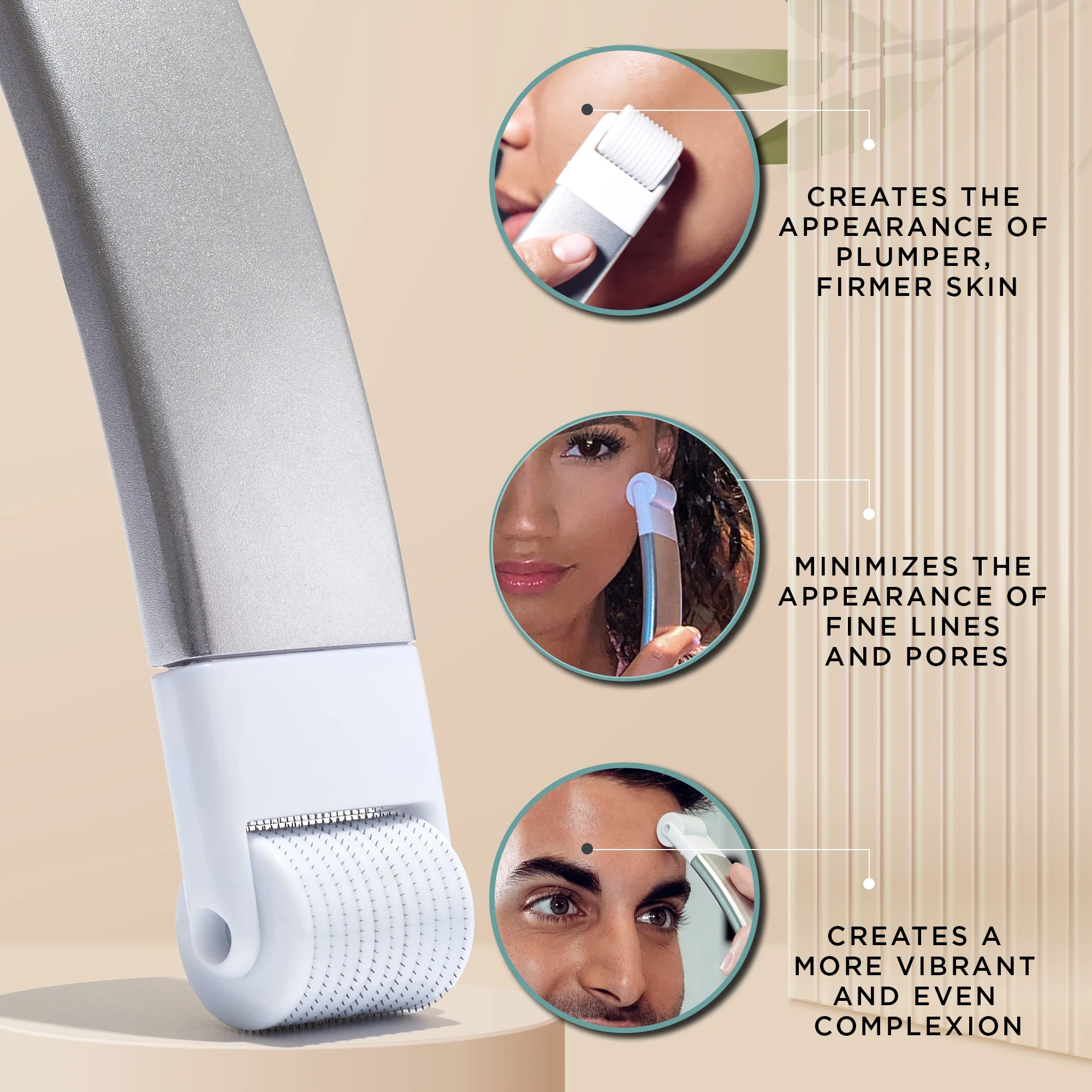 Our at-home Microneedling Tool with replaceable micro roller heads refines uneven texture, visibly lifts dark spots, and supports younger-looking skin. For all skin types. This StackedSkincare derma roller is ideal for fine lines, dark spots and acne-scarring concerns. Aesthetician designed and developed, this cruelty-free environmentally sustainable derma roller features an ergonomic handle to deliver spa-like results at home.