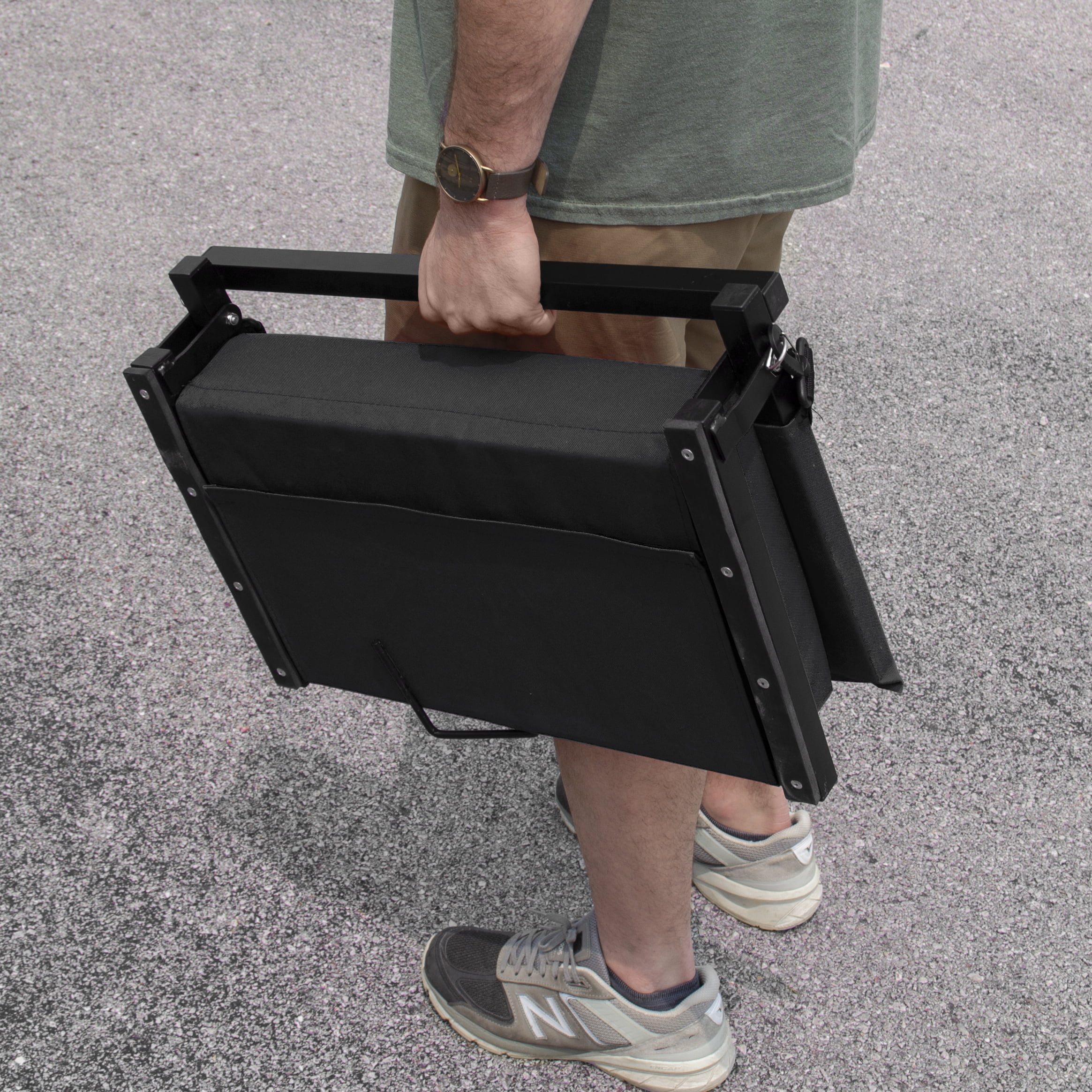 EXTRA-LARGE ULTRA-COMFORTABLE SEAT & BACK SUPPORT: 3” thick Ultra-Padded seat provides all day comfort on any surface for dedicated fans while watching your favorite sporting events PORTABLE & EASY TO CARRY: Folds in half with a built in handle and adjustable shoulder strap makes it easy to transport to and from each event QUALITY & DURABILITY: These stadium chairs are constructed with a quality steel frame with a powder coated finish made for years of comfort