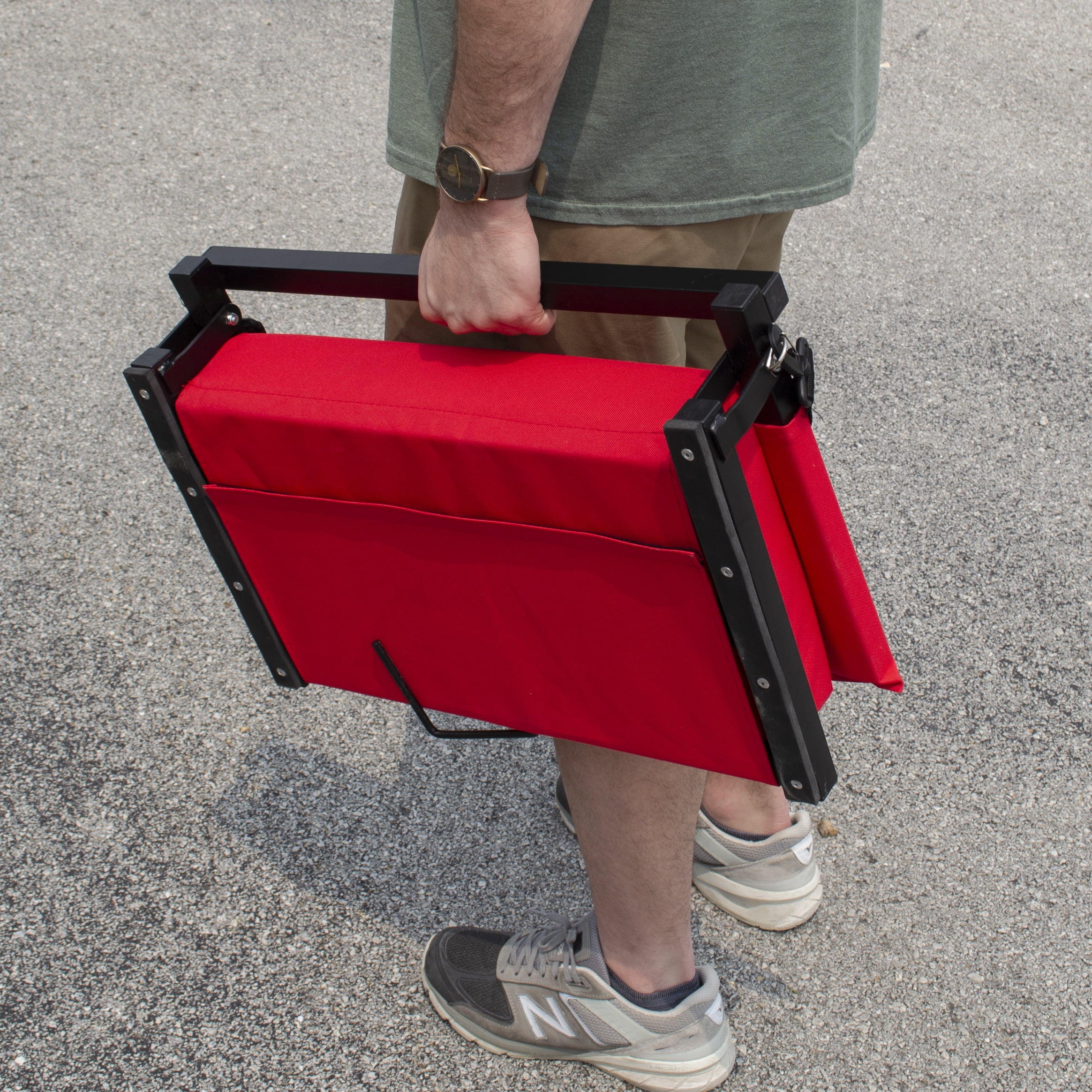 EXTRA-LARGE ULTRA-COMFORTABLE SEAT & BACK SUPPORT: 3” thick Ultra-Padded seat provides all day comfort on any surface for dedicated fans while watching your favorite sporting events PORTABLE & EASY TO CARRY: Folds in half with a built in handle and adjustable shoulder strap makes it easy to transport to and from each event QUALITY & DURABILITY: These stadium chairs are constructed with a quality steel frame with a powder coated finish made for years of comfort