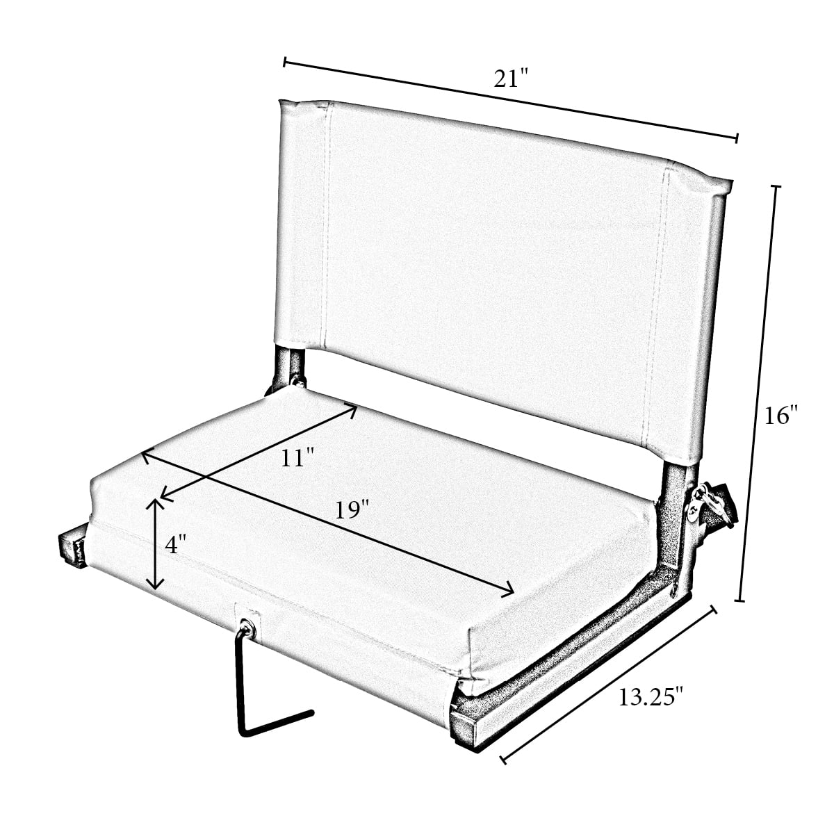 This Extra-Large size ultra-comfortable Stadium Chair has 3” thick padded seat that provides all day comfort on any surface for dedicated fans while watching your favorite events. Constructed with a quality steel frame and powder coated finish that makes these chairs durable for years of comfort. Portable and easy to carry, these chairs fold in half with a built in handle and adjustable shoulder strap that makes it easy to transport to and from each event. Bleacher hooks secure the seat to bench style seating along with solid rubber treads that provide additional grip to prevent sliding for a worry free seating experience.