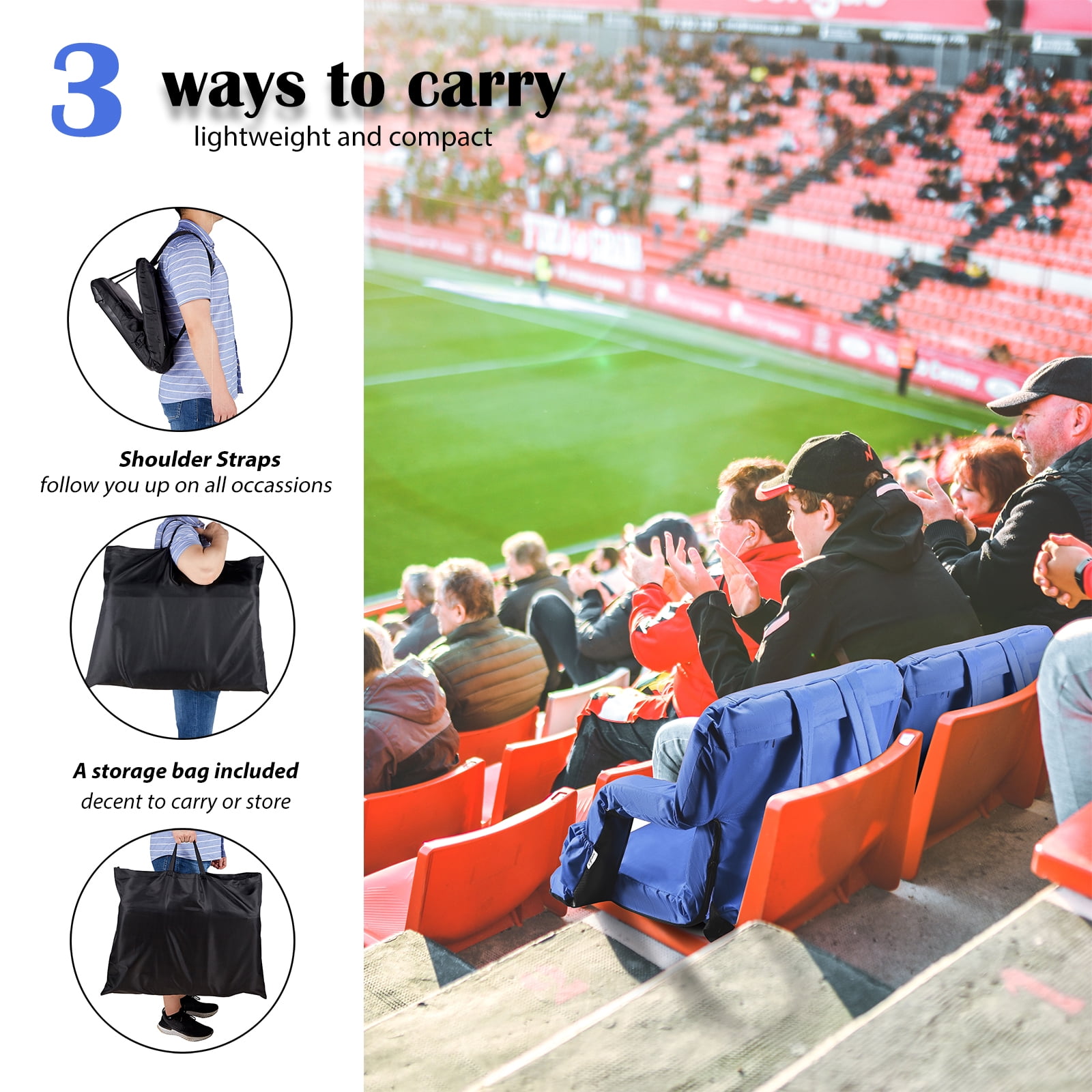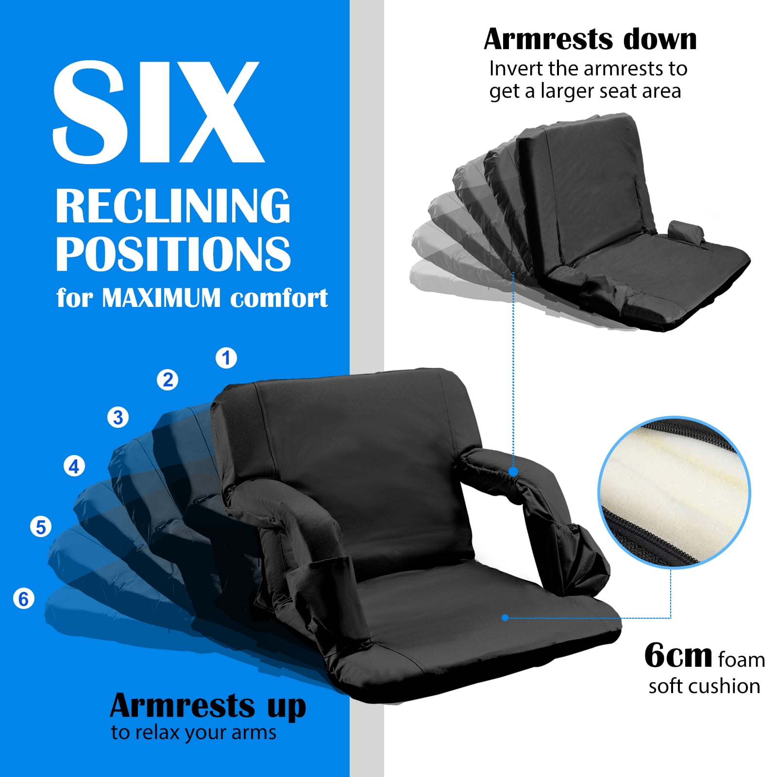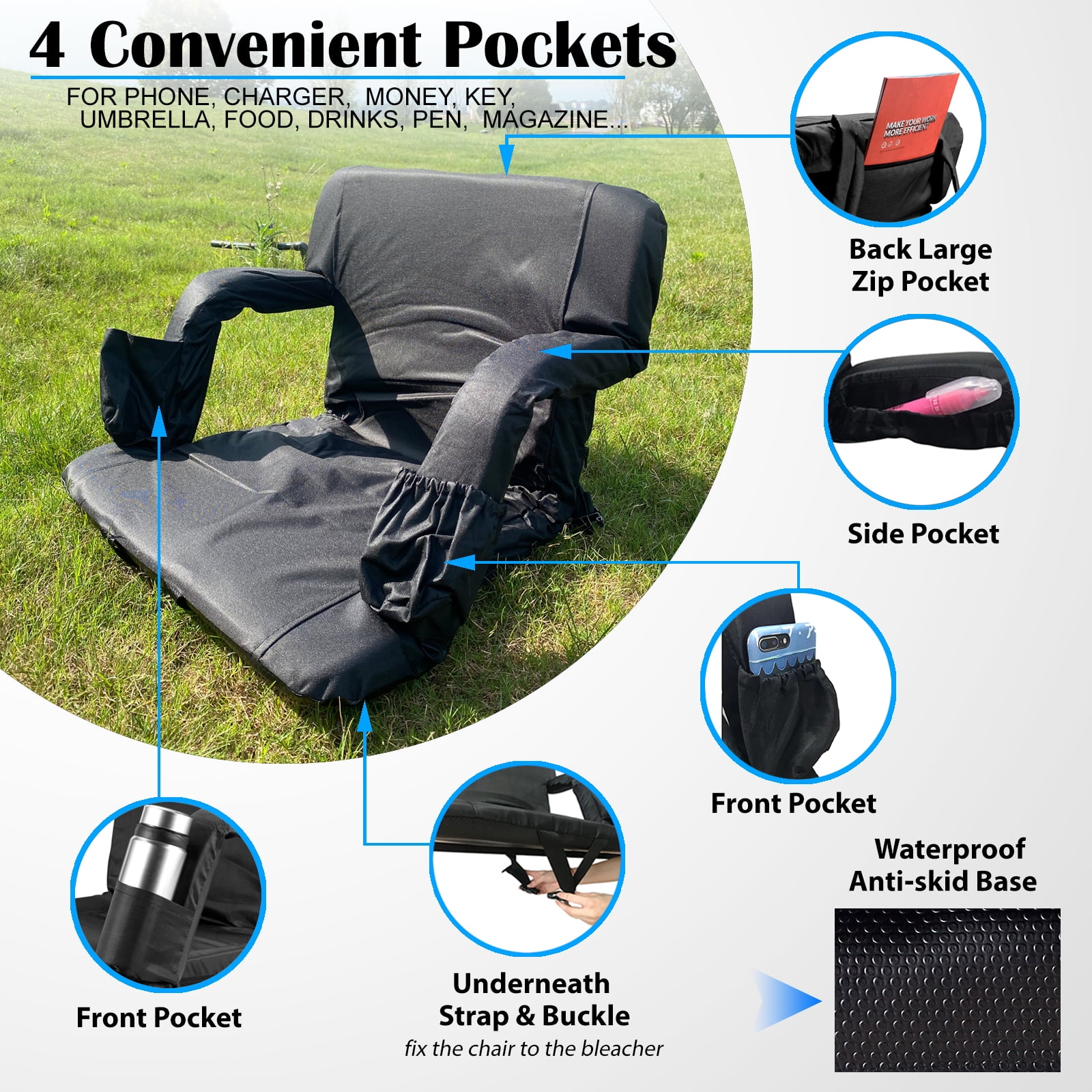 comfortable and safe:Built with sturdy steel frame, the seats are padded with 1.2 inch thickness foam and covered with durable fabric, providing you with pillow-like coziness. The bottom is made of non-slip waterproof rubber, and the bottom strap can be securely attached to the bench preventing slipping off. collapsible and portable: The stadium seat can be easily folded up. Two shoulder straps and 8.8lbs light weight allow you to carry it like a backpack, perfect for fishing, picnics, beach, stadium bleachers, outdoor concerts and other outdoor events. 6 reclining positions and 2 width positions:The backrest can be adjusted in 6 different angles, providing the most comfortable and suitable position. You can use it with handrails to rest arms comfortably, or lower the armrests to get more spacious seating. Convenient chair pockets: Always keep your possessions within reach. Two front pockets can hold water bottles ,drinks and snack. Side pockets holds valuable phones, keys, wallets etc. The large back zipper pocket are made for extra storage.