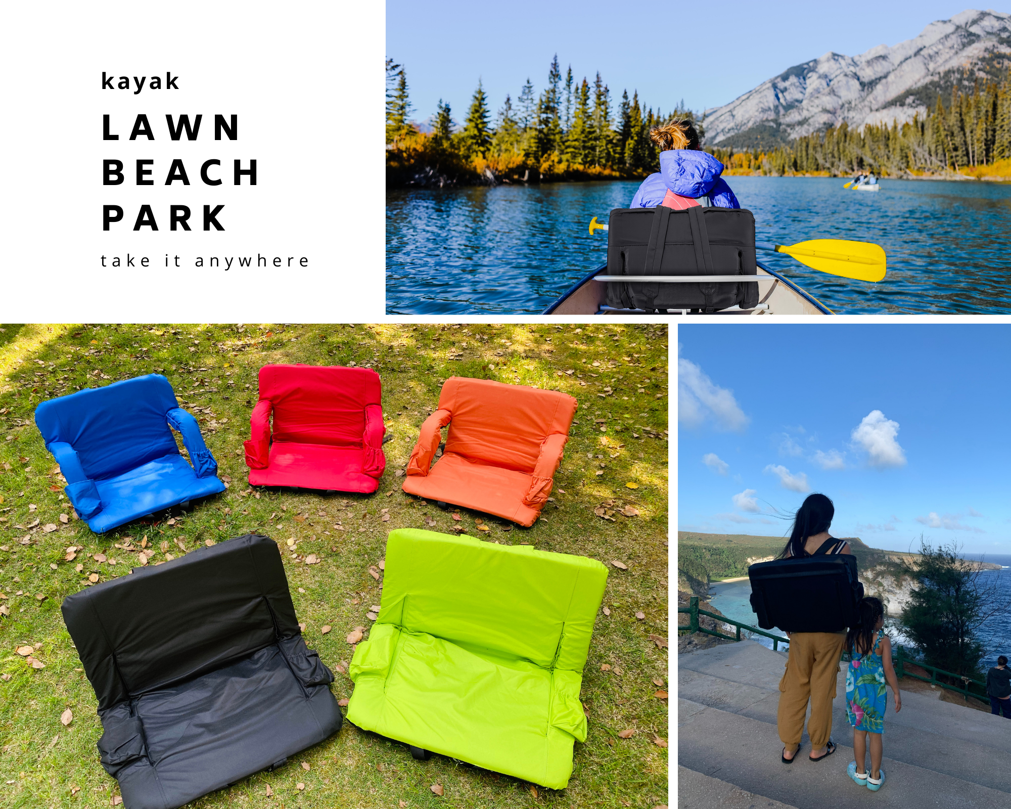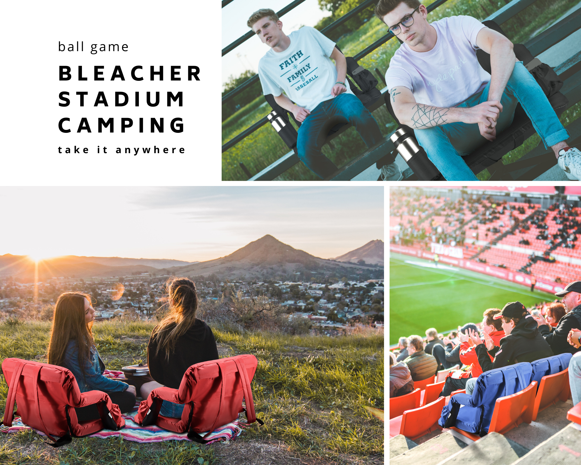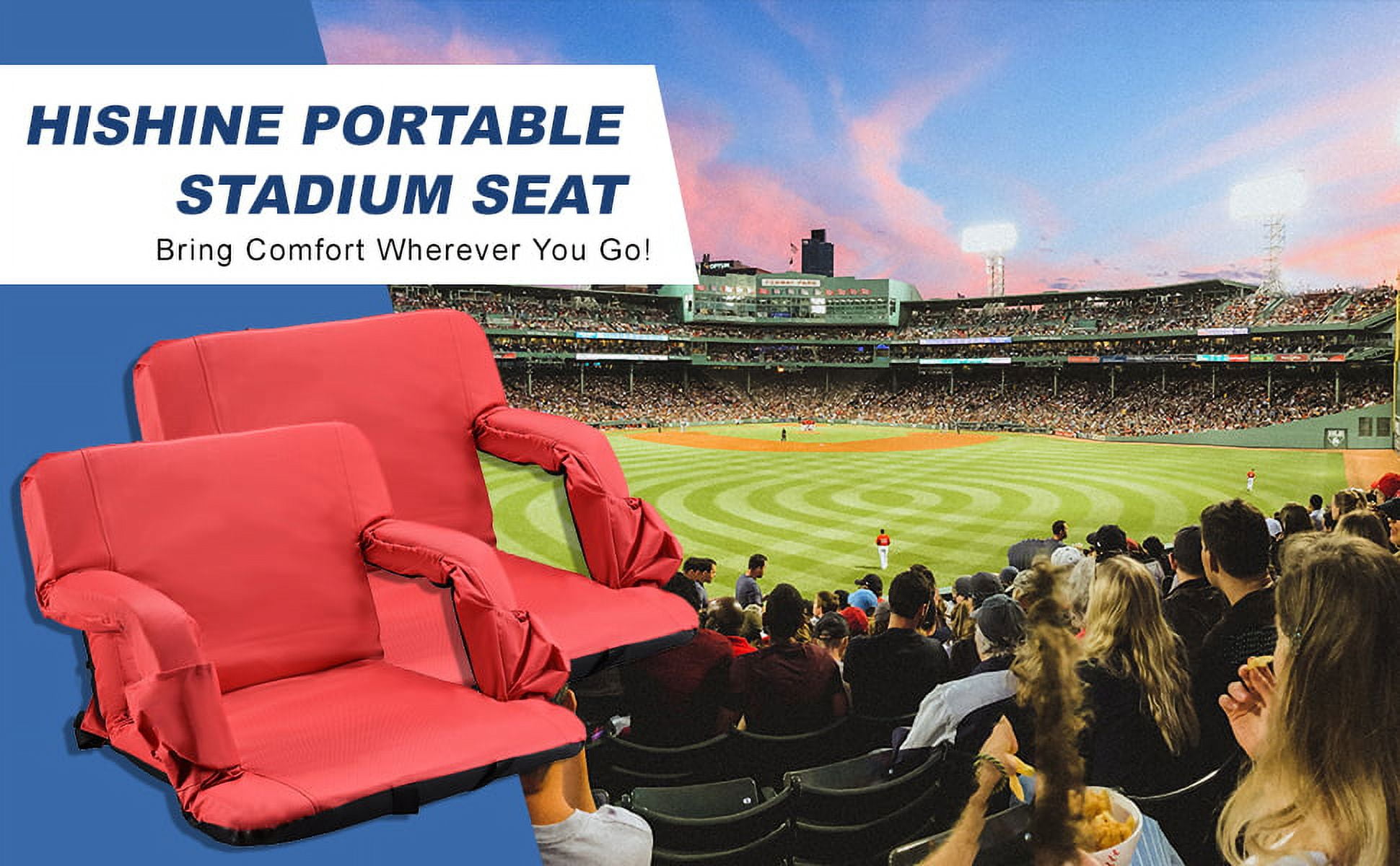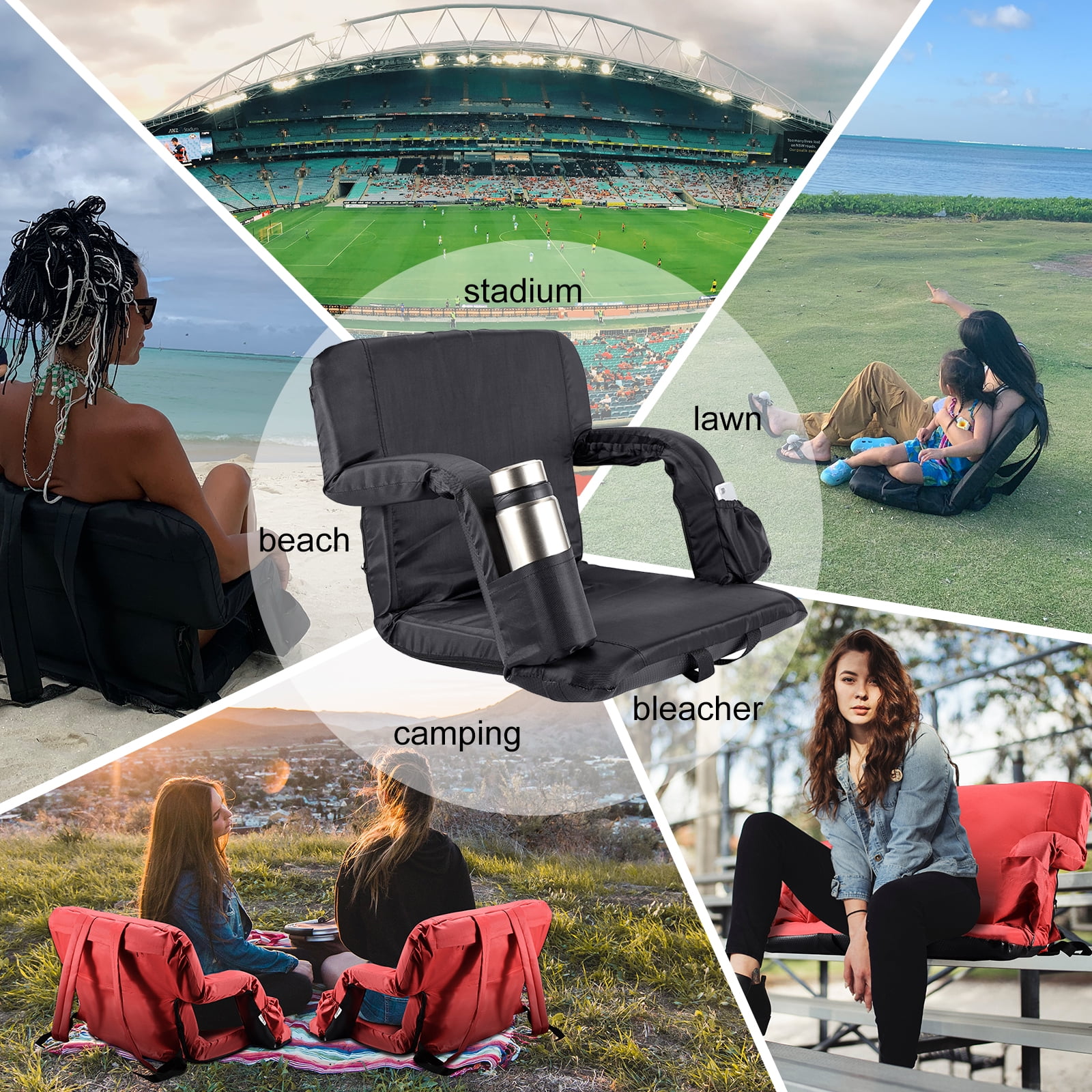 comfortable and safe:Built with sturdy steel frame, the seats are padded with 1.2 inch thickness foam and covered with durable fabric, providing you with pillow-like coziness. The bottom is made of non-slip waterproof rubber, and the bottom strap can be securely attached to the bench preventing slipping off. collapsible and portable: The stadium seat can be easily folded up. Two shoulder straps and 8.8lbs light weight allow you to carry it like a backpack, perfect for fishing, picnics, beach, stadium bleachers, outdoor concerts and other outdoor events. 6 reclining positions and 2 width positions:The backrest can be adjusted in 6 different angles, providing the most comfortable and suitable position. You can use it with handrails to rest arms comfortably, or lower the armrests to get more spacious seating. Convenient chair pockets: Always keep your possessions within reach. Two front pockets can hold water bottles ,drinks and snack. Side pockets holds valuable phones, keys, wallets etc. The large back zipper pocket are made for extra storage.