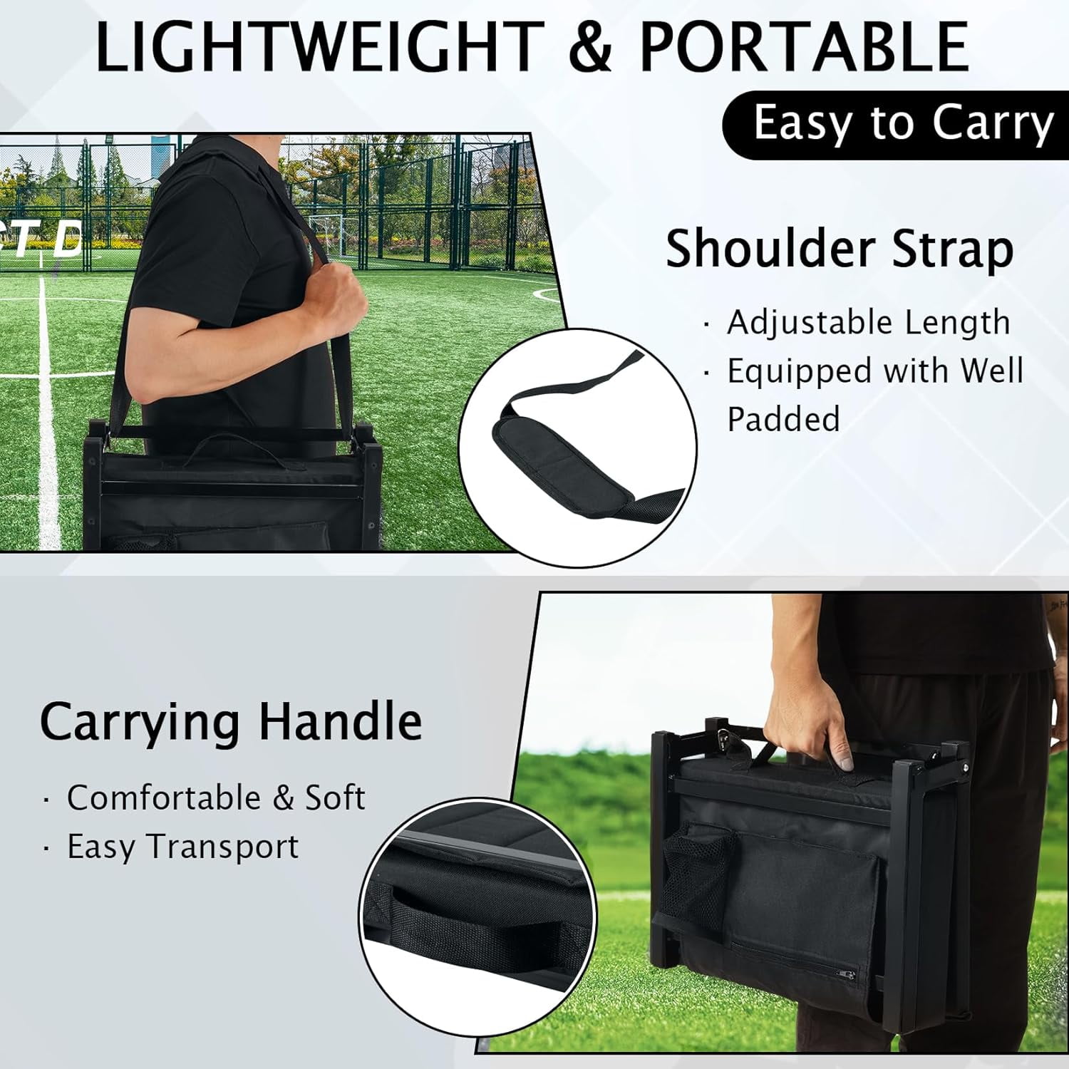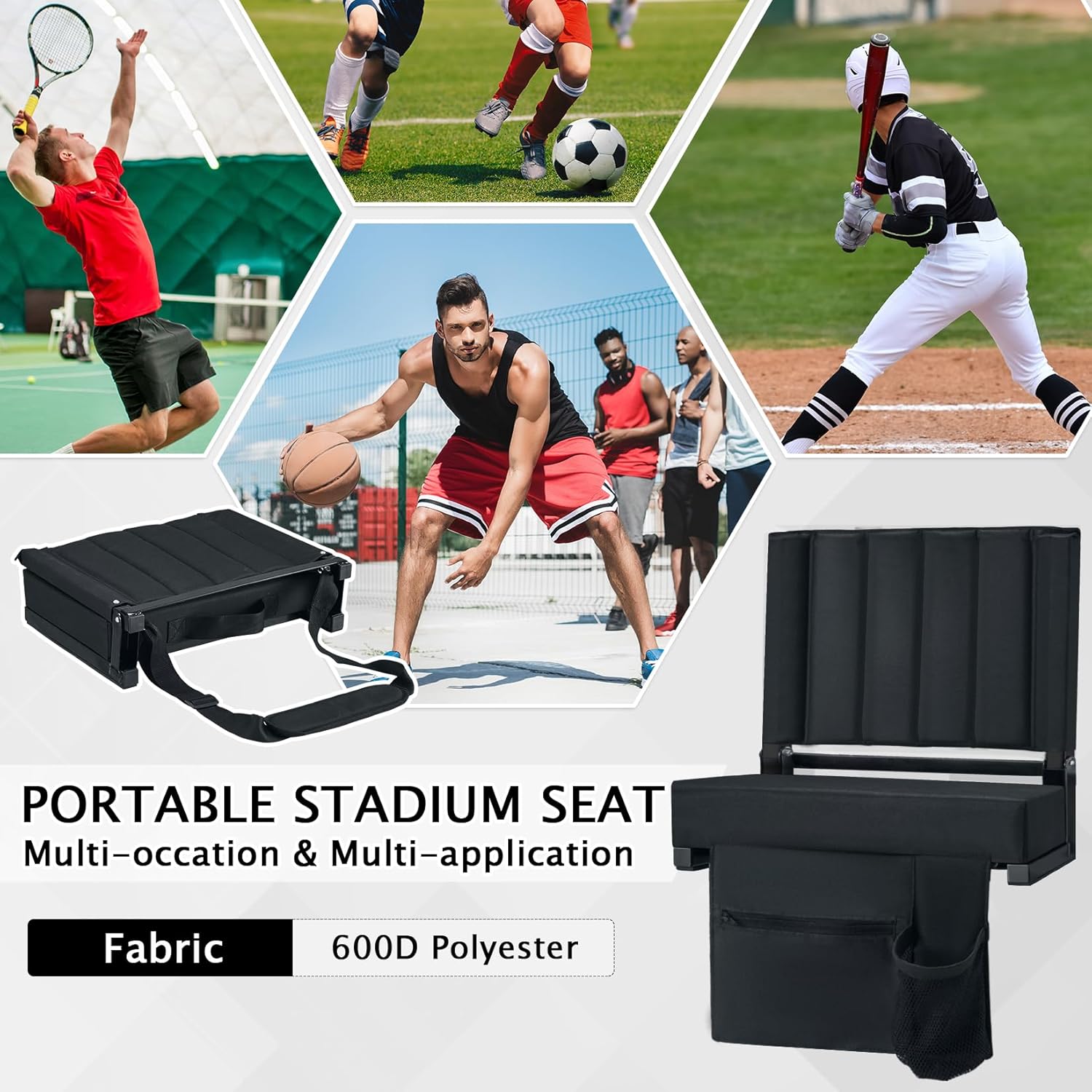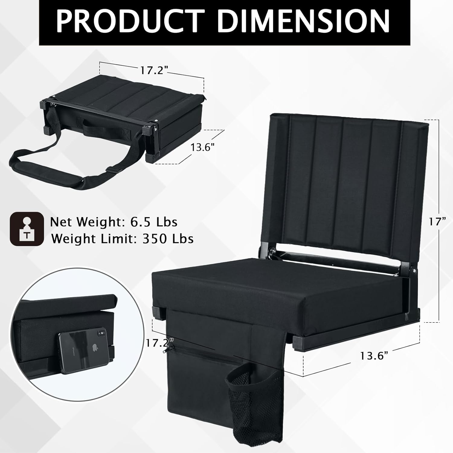 Product Description Stadium Bleacher Seats are perfect for watching and enjoying sports events Want a comfortable seat at the stadium instead of the traditional hard and cold bleachers? Our compact stadium bleacher seats are designed with comfortable and soft foam pads, perfect for any sports game or event you can watch or enjoy for countless hours. Comfortable – thick and soft seat cushions and excellent padded back support Extra wide seat – 17 inches wide, making our seats very spacious Multiple scenarios – suitable for sports events, basketball, football, tennis, etc. Specifications Color: Black Item Quantity: 1 Pack Material: 600D fabric and thick cushion foam and alloy steel frame Product size: 13.6 inches wide x 17.2 inches long x 17 inches high Weight limit: 350 pounds Net weight: 6.5 pounds Stadium Bleacher Seats with Backrest Premium Features and Details Safe and Stable Our stadium bleacher seats are equipped with two hooks to enhance the stability of sitting on wooden or metal bleachers. Compared with other products, the addition of extra hooks makes the seat more stable and safer when cheering for the victory of the game. In addition, it is equipped with anti-slip rubber strips at the bottom, which not only prevents sliding but also prevents scratches. Comfortable and Convenient Our stadium bleacher seats with backrest are made of high-quality steel frame and can support up to 350 pounds. The stadium chair is ergonomically designed with an optimal tilt angle for great comfort. In addition, it has multiple convenient drink holders to store snacks, drinks, or carry your phone easily. Lightweight and Portable Our bleacher seats are foldable design, lightweight and compact, weighing only 6.5 pounds, easy to fold and carry with adjustable padded shoulder straps to relieve shoulder pressure and pain. In addition, it comes with a built-in carrying handle, allowing you to easily carry it to where you want.