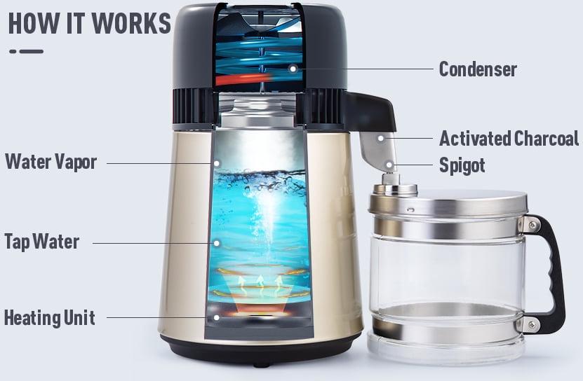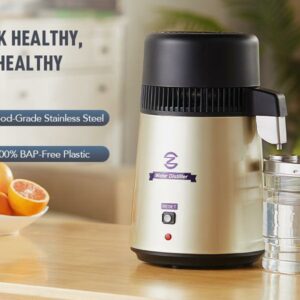 A water distiller processes water through heating, evaporation and condensation to separate pure, freshwater from contaminants. Our most sought after water distiller, this model has a 304 Stainless Steel exterior and top quality 1 gallon glass carafe with ergonomic Easy-Lift Handle. It can distill up to 1 liter/ hour, it also features single-button start, automatic turn off when it gets too hot.