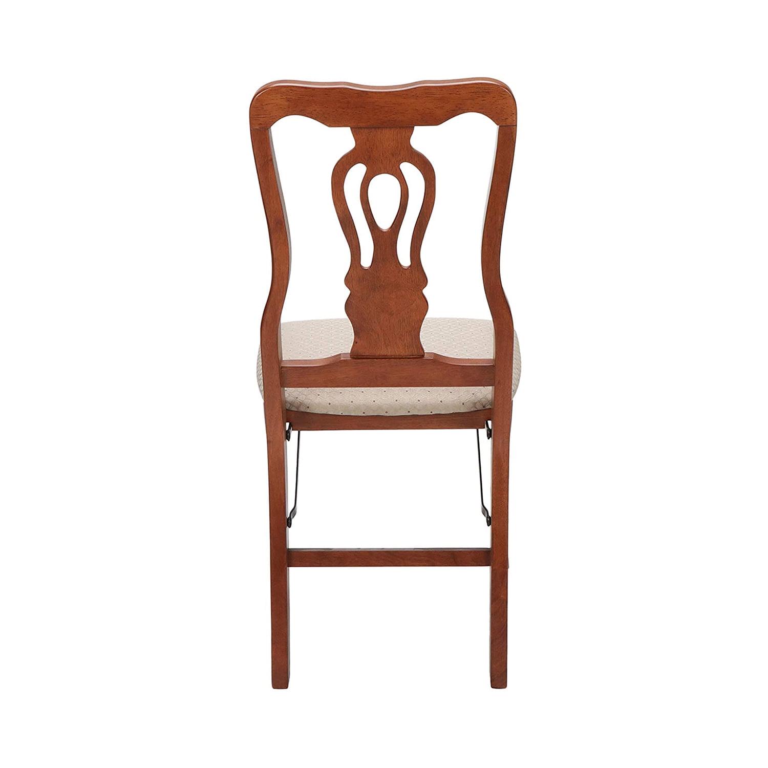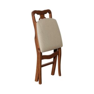 This folding chair has a Scroll Style back panel with flowing back posts. Designed to complement traditional dining room sets. The chairs are constructed of solid hardwoods with a steel folding mechanism and padded upholstered seat. With a blush fabric upholstery and cherry hardwood finish this folding chair offers the elegance and appearance of everyday furniture with the flexibility of folding furniture. With the Stakmore quality promise and warranty, you can rest easy knowing you will be fully satisfied with your purchase.