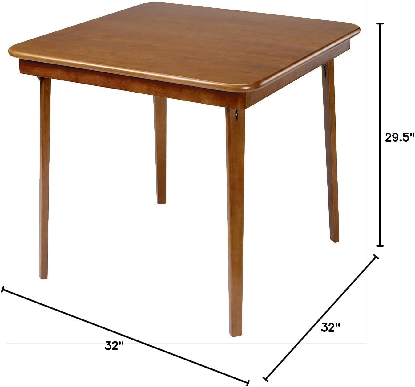 Elevate your hosting experience with this versatile table, crafted from high-quality solid wood, ensuring long-lasting durability and a timeless aesthetic appeal Timeless straight-edge design adds a touch of elegance to any space, enhancing the ambiance of your home décor Folds to a mere 3.375 inches deep, allowing for convenient storage in closets, under beds, or against walls when not in use Enjoy the convenience of immediate use without the hassle of assembly, allowing you to focus on your gatherings and games Material: Wood Color: Fruitwood Open Dimensions (L x W x H): 32 x 32 x 29.5 inches Folded Dimensions (L x W x H): 3.38 x 32 x 32 inches Weight: 29 pounds Manufacturer warranty: 5-year limited warranty