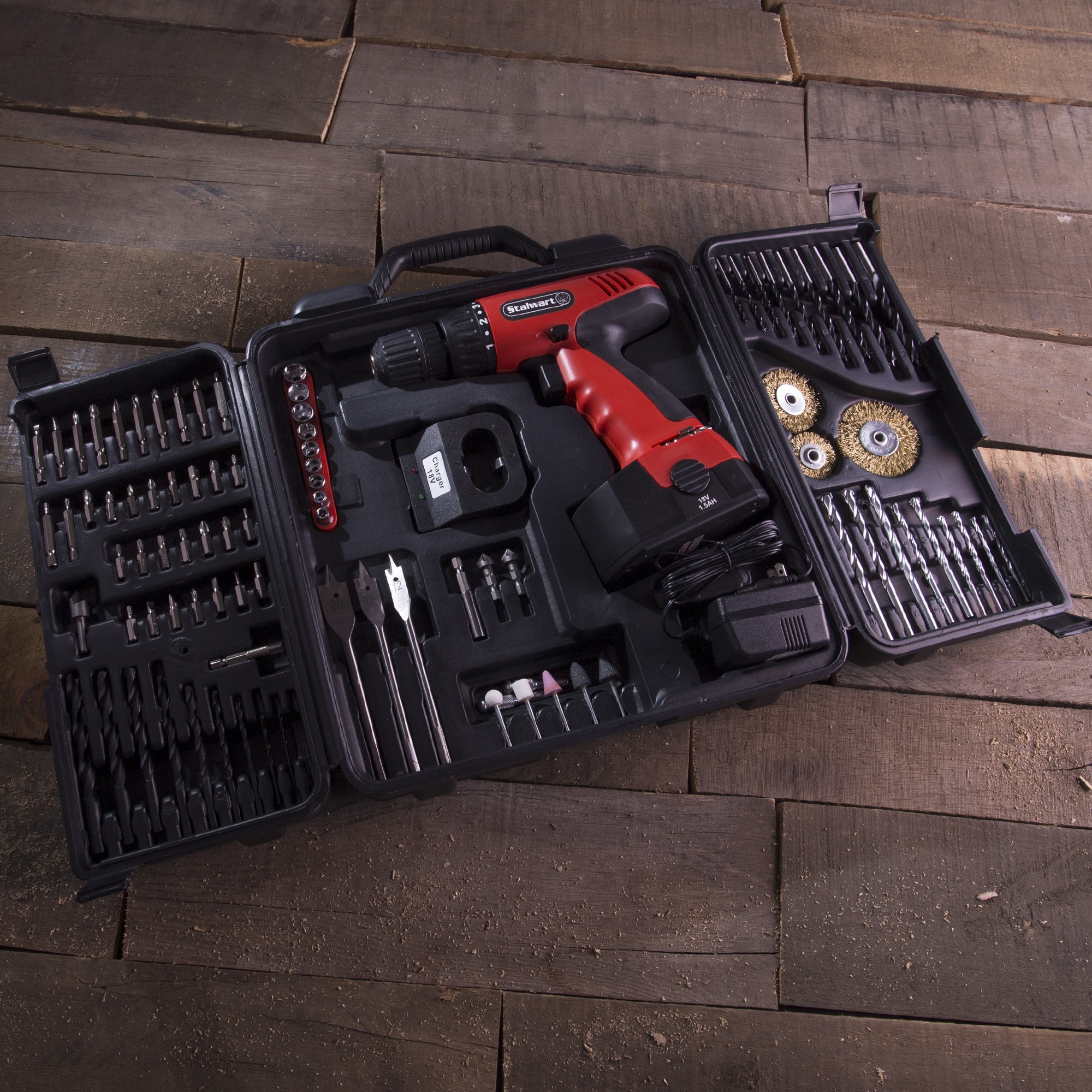 The Stalwart W550031 18 Volt Ni-Cad Cordless Drill with 89 Piece Drill Set has nearly everything you need for almost any job all in one convenient durable carrying case. You won’t be caught off guard on any project with all the bits, sockets and drivers provided in this whole kit.