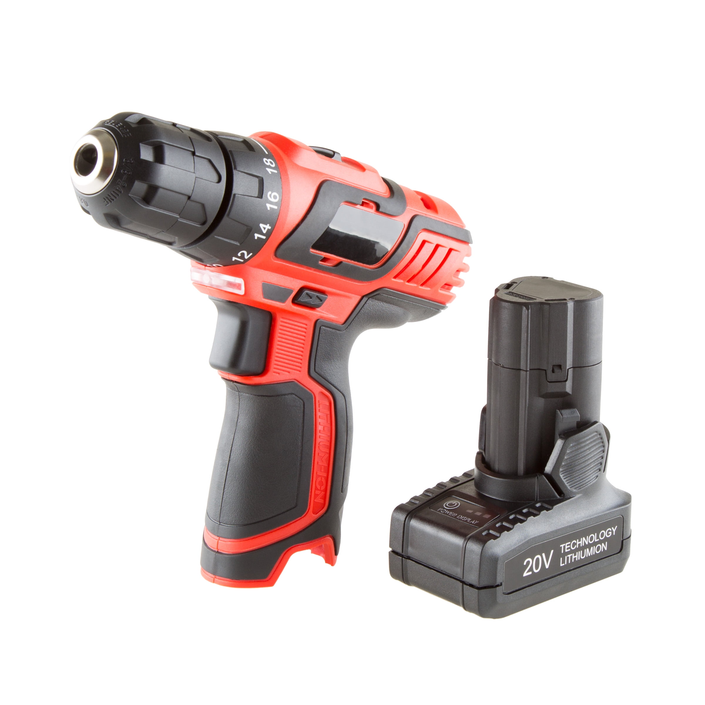 CORDLESS DRILL SET – This 20V power drill features a comfort grip handle, 2 speeds with 18 clutch settings, a built-in LED light, a lithium-ion battery, and a charger. SET INCLUDES – This kit includes a socket wrench, a magnet bit holder, a flashlight, and 2 spade drills, great for projects inside and outside of the home. DIY ESSENTIALS – The drill kit includes 7 Philips, 4 flat head, 4 hex, and 14 torx bits, and a socket adaptor with 12 sockets (4, 4.5, 5, 5.5, 6, 7, 8, 9, 10, 11, 12, and 13mm). INCLUDES BASIC TOOLS – This drill driver set is also equipped with 5 spur point drills (3, 4, 5, 6, and 8mm), and 10 twist drills (2, 2.5, 3, 3.5, 4, 4.5, 5, 5.5, 6, and 6.5mm). CARRY CASE – This cordless drill with battery and charger set comes with a hard-shell carrying case to hold this entire 65-piece-set, ideal for storage, organization, and portability. SPECIFICATIONS – No Load Speed: 0-400, 0-1400 RPM; Maximum Torque: 35Nm; Lithium-Ion Battery Charging Time: 3-5 hours; Flashlight Requires 3AAA Batteries (Not Included). DIMENSIONS – Case: (L) 11” x (W) 12.5” x (H) 3.75”.