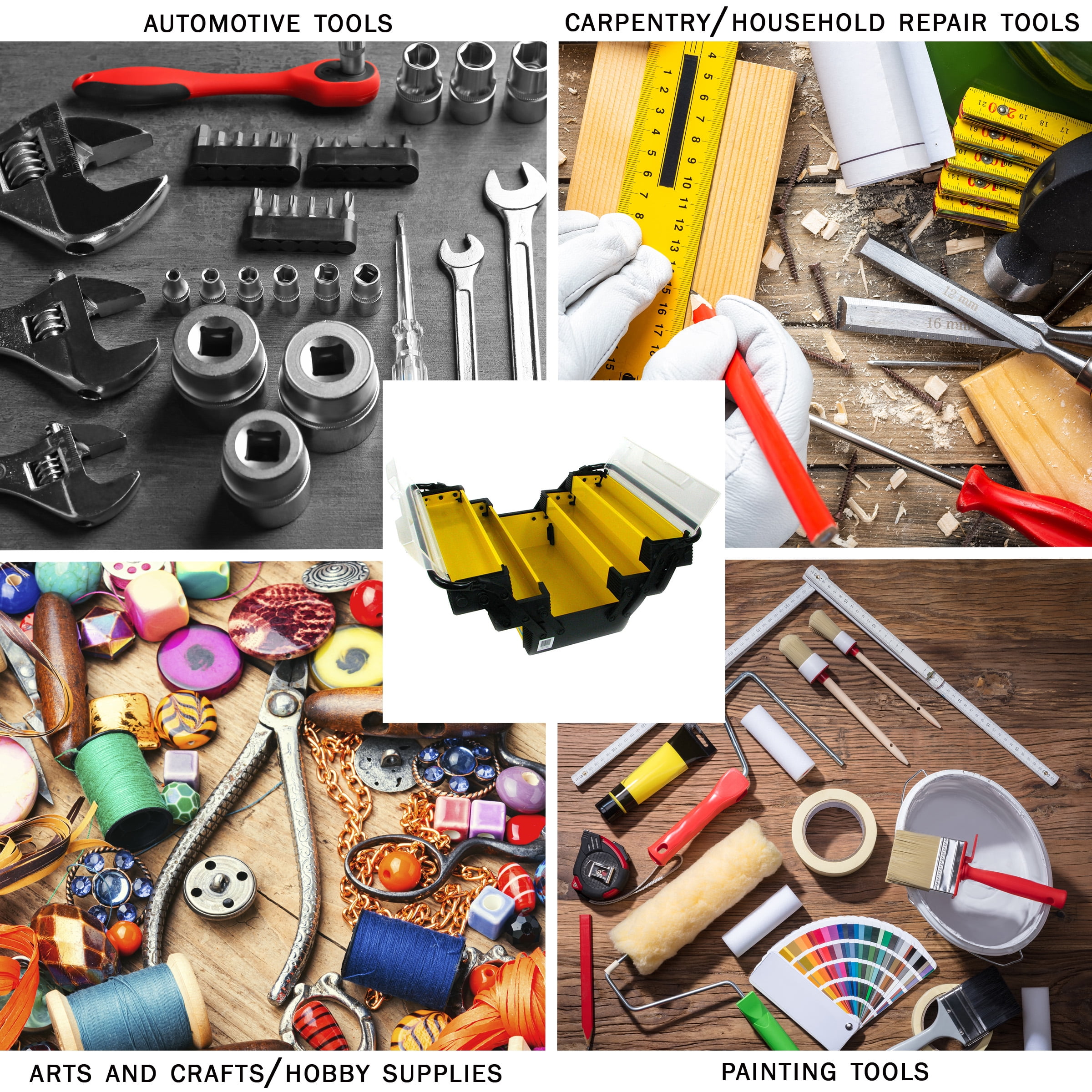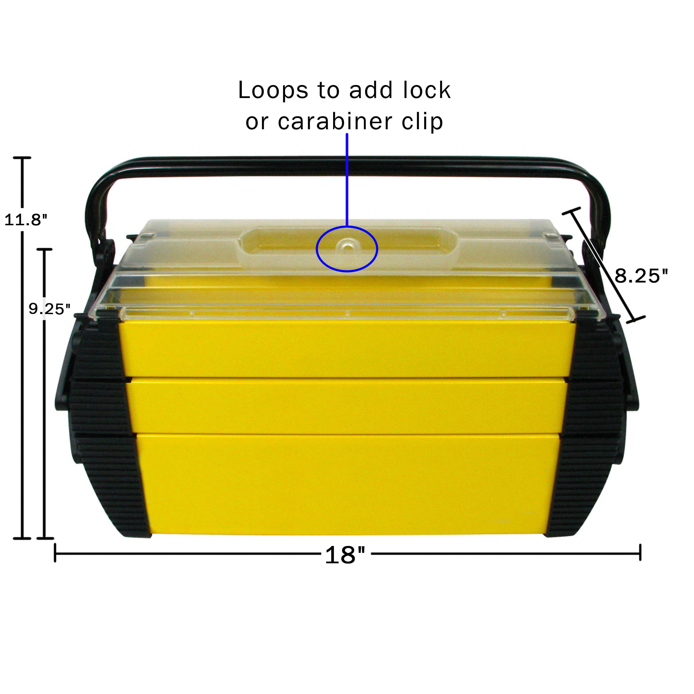 3-TIER PORTABLE TOOL BOX – This plastic tool box opens to reveal five compartments over three levels, including a large storage section that is perfect for bigger items. DURABLE – Constructed from rugged plastic, this portable tool holder is a long-lasting option for toolbox organization, and the tray distributes the weight evenly for stability. PORTABLE – With convenient carrying handles, this 18-inch large tool box is easily portable while supporting locks and carabiners to keep the organizer box’s contents secure. MULTIPURPOSE – This multipurpose plastic tool box with handle is perfect for everything from hardware like nails, screws, and bolts, to fishing tackle, jewelry, and craft supplies. MATERIALS – PE Plastic And Steel. DIMENSIONS – (L) 18″ x (W) 8.25″ x (H) 11.8″; Top Tray: (L) 14.8″ x (W) 3.5″ x (H) 2″; Middle Tray: (L) 15.9″ x (W) 3.5″ x (H) 1.8″; Base Bin: (L) 16.2″ x (W) 7.9″ x (H) 3.7″. COLOR – Yellow.
