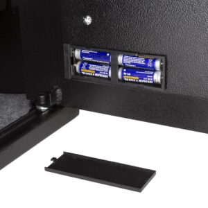 – PRODUCT DETAILS Materials: Steel. Dimensions: (L) 15 x (W) 12 x (H) 12 ; Interior: (L) 14.75 x (W) 11 x (H) 11.5 ; Door: (L) 13.5 x (W) 9.75 . Mounting Hardware, 2 Manual Override Keys and 4AA Batteries Included. Color: Black.