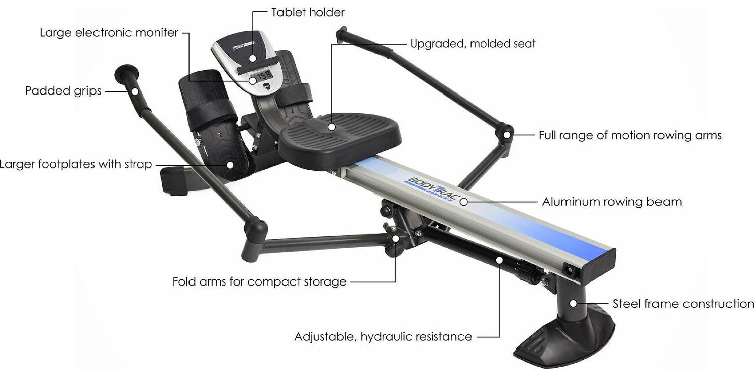 With a compact design (23.5 x 46 ), the BodyTrac Glider 1060 home rowing machine features full-motion arms and adjustable, hydraulic cylinder resistance for a natural and effective rowing stroke. The ball-bearing roller system allows the premium molded seat to slide smoothly on the aluminum rowing beam. Even more, you ll be able to enjoy rowing workouts for years to come. The sturdy steel frame construction is built to last. When you re finished with your workout, the rower arms easily fold and the rower can be stood on end to be out of the way when not in use.