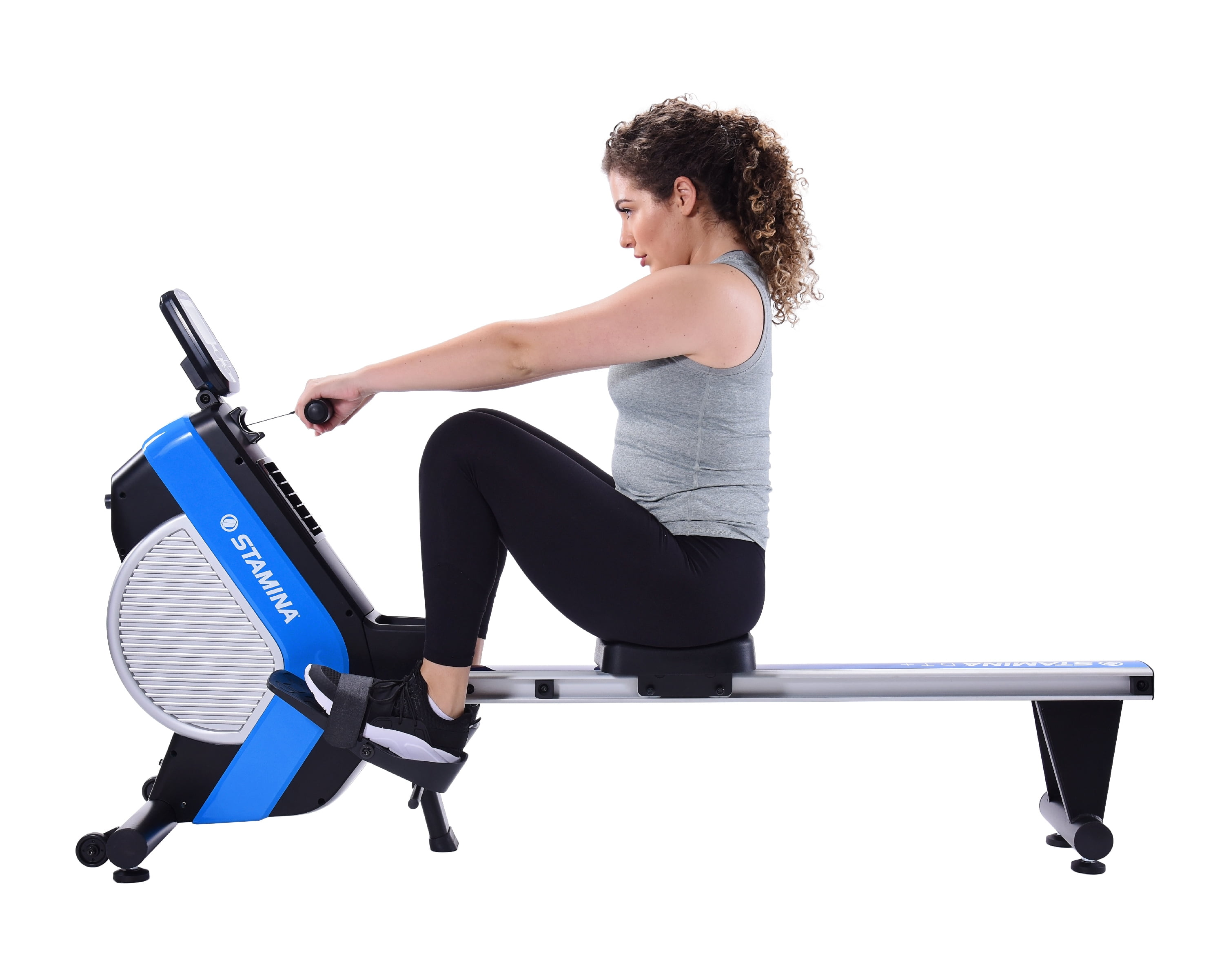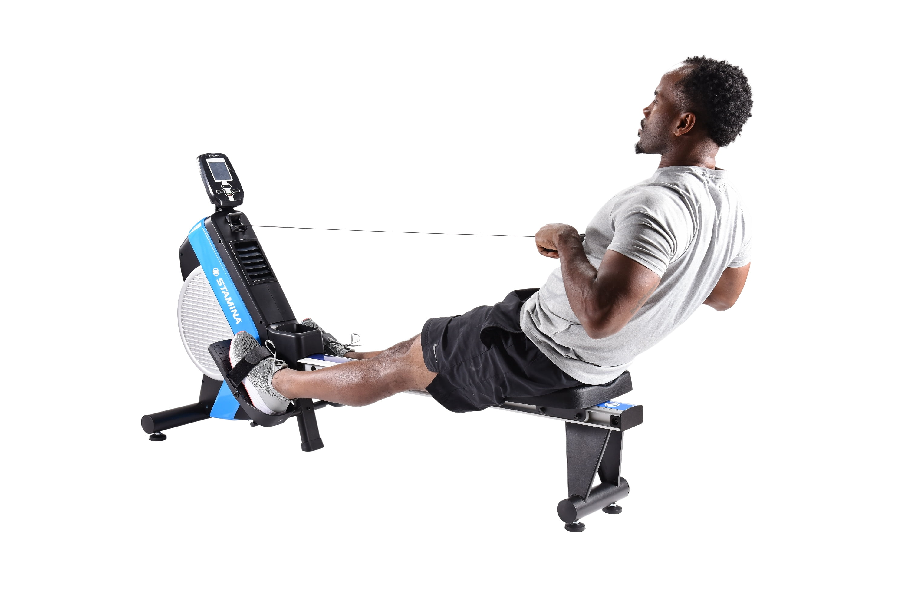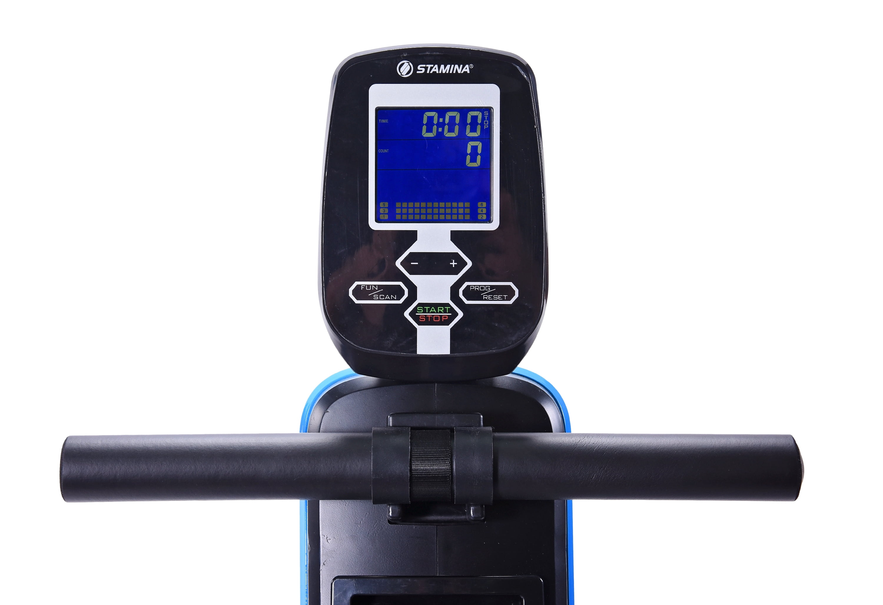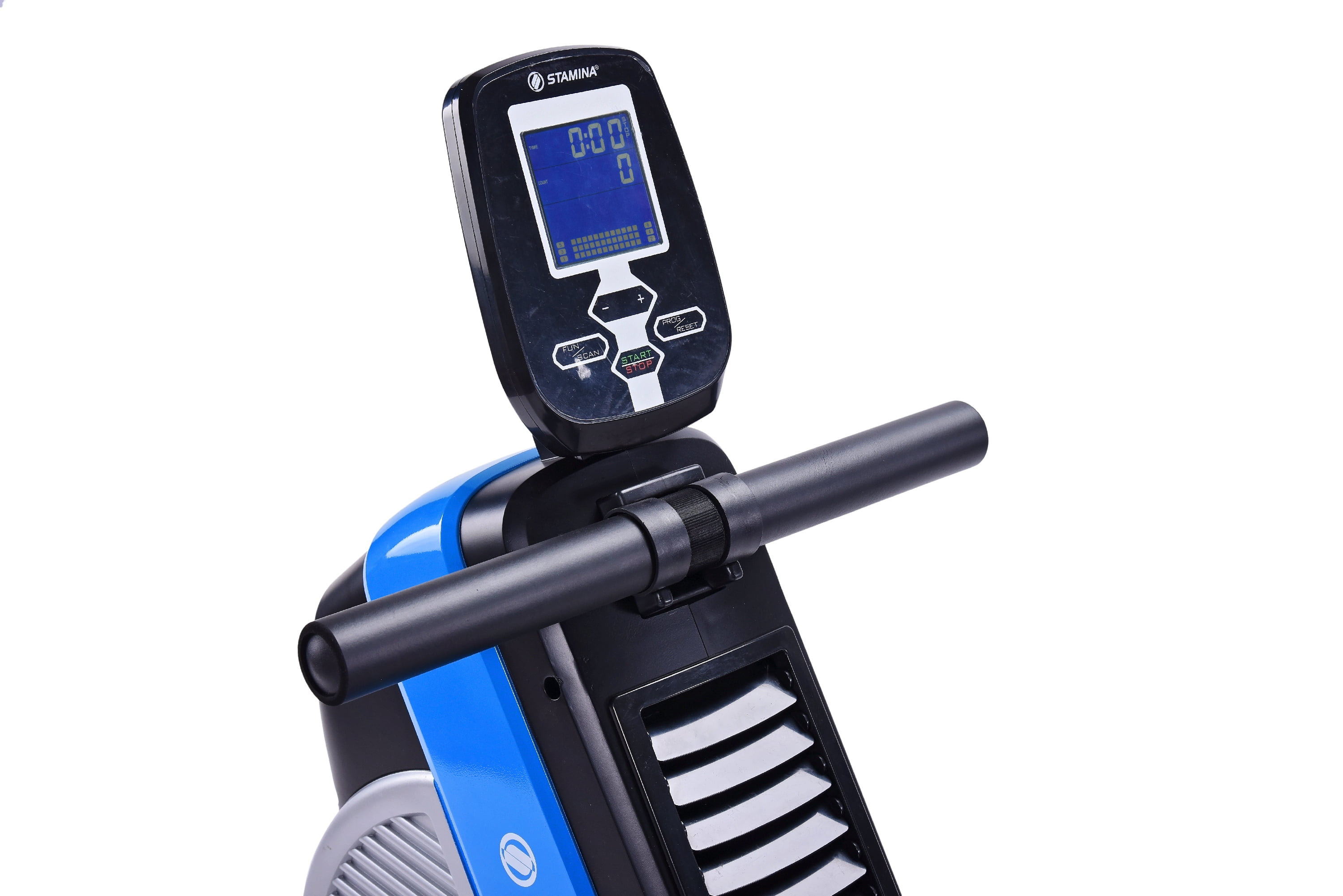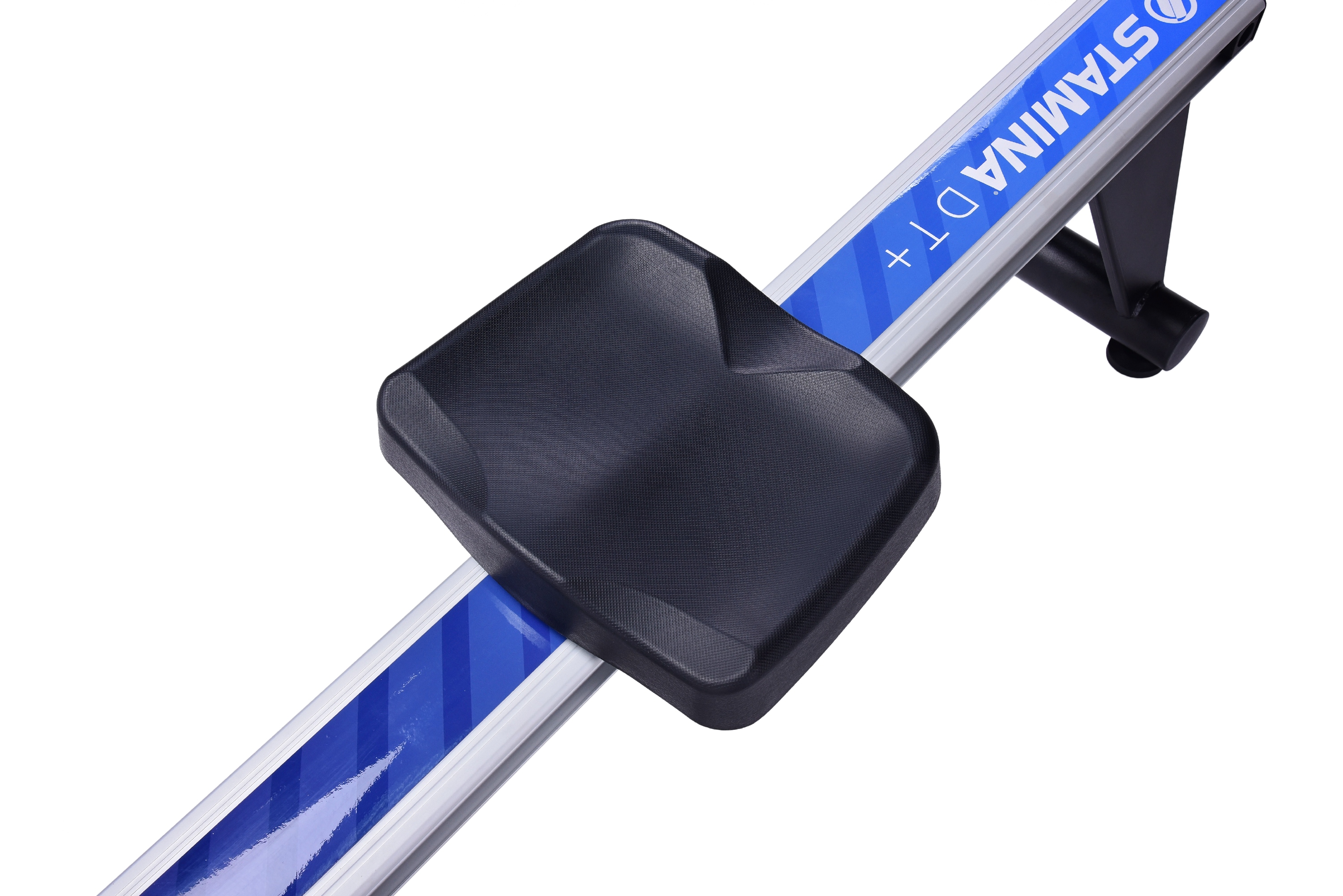 Building a sculpted body is easy with the Stamina DT Pro Exercise Rower with Dynamic Air Resistance. This feature-rich rowing machine is designed to help you reach all of your fitness goals, including toned muscle, improved metabolism, and better heart health. Air resistance on the DT Plus is intuitive and easy to use. If you desire greater resistance, simply increase the intensity of your rowing stroke. Or, if you want less, ease off. You can further customize the baseline resistance level on the large LCD monitor. Program your own routine or follow along with pre-setting workouts on the LCD monitor, including target intensity, target heart rate, target intervals, and custom intervals. The monitor also tracks time, watts, strokes per minute, count, distance, calories, and heart rate*. *The DT Plus is compatible with any 5 kHz heart rate transmitter. The molded, padded seat offers a smooth rowing stroke. Textured footplates and adjustable straps keep you stabilized and aligned. No matter what your intensity is, the padded handlebar provides a firm grip. Lastly, stay hydrated by placing a drink in the bottle holder. After you’re done, use the built-in wheels to move the rowing machine to storage.