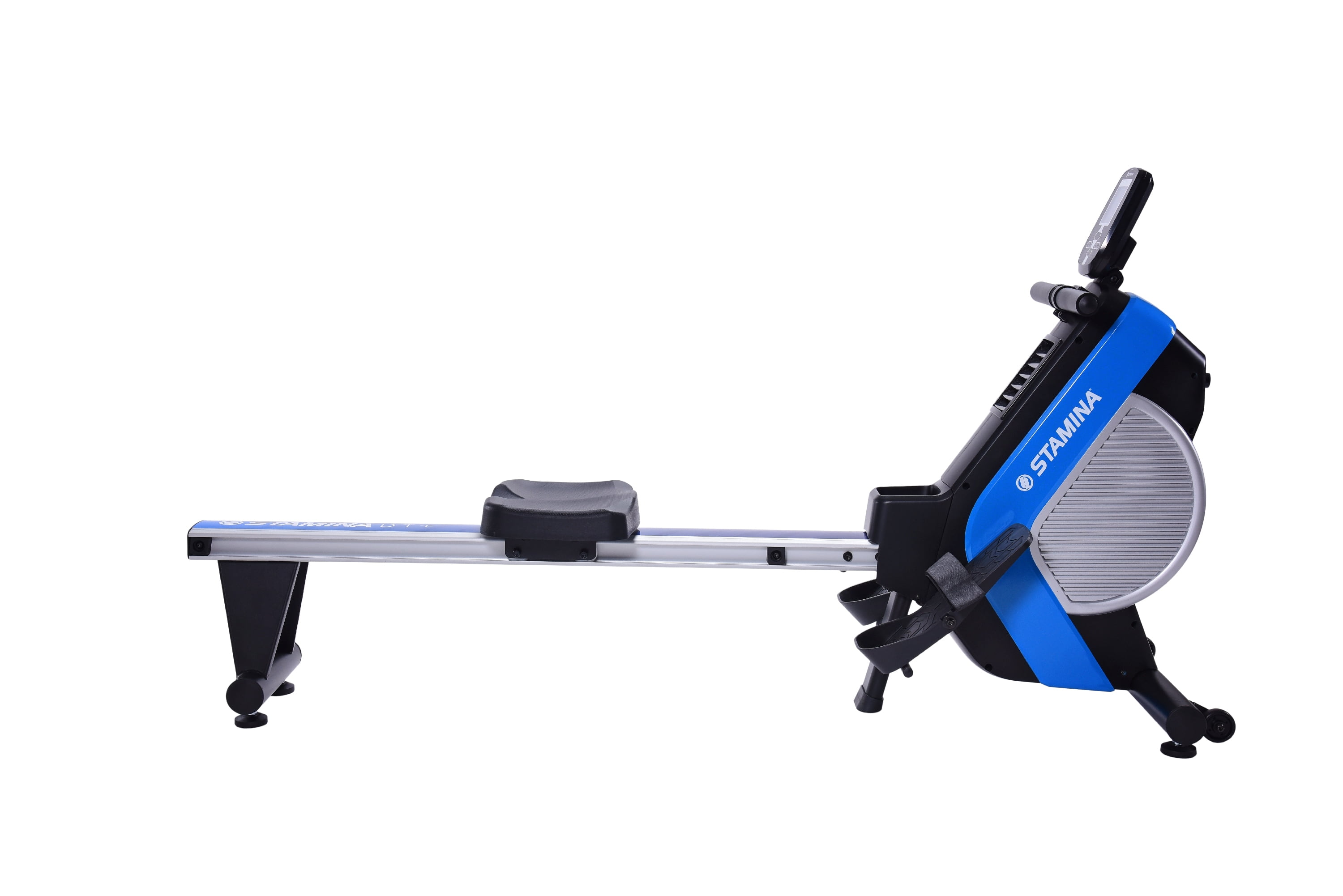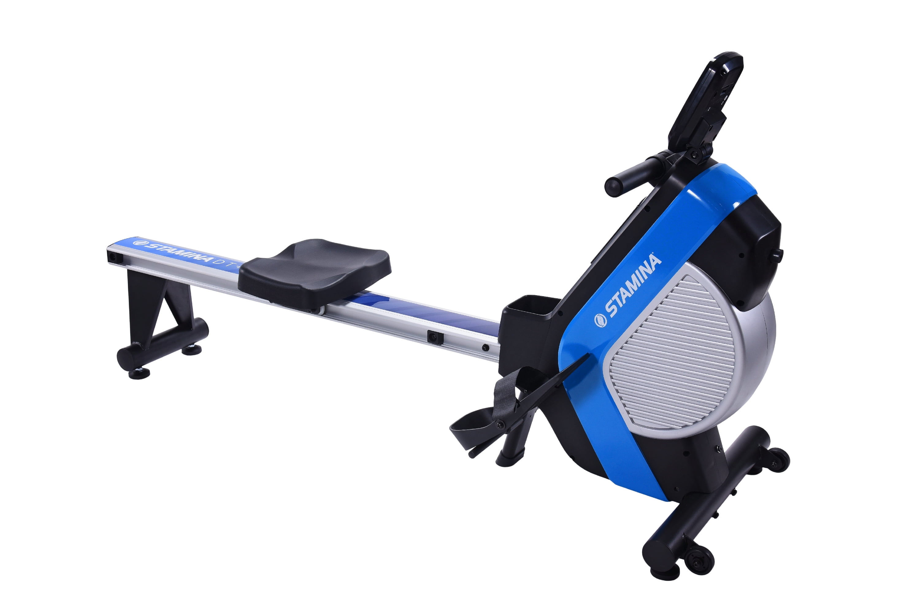 Stamina DT Pro Exercise Rower with Dynamic Air Resistance: Dynamic air resistance LCD monitor tracks time, watts, strokes per minute, count, distance, calories, and heart rate (heart rate transmitter not included) Compatible with any 5 kHz heart rate transmitter Increase magnetic intensity using the LCD monitor Set customizable workouts including target intensity, target heart rate, target intervals, and custom intervals Textured footplates and straps Bottle holder Molded, padded seat Padded handlebar Anti-skid endcap Built-in wheels Assembled Dimensions: 65″ x 21″ x 35.5″ Weight Capacity: 250 lbs.