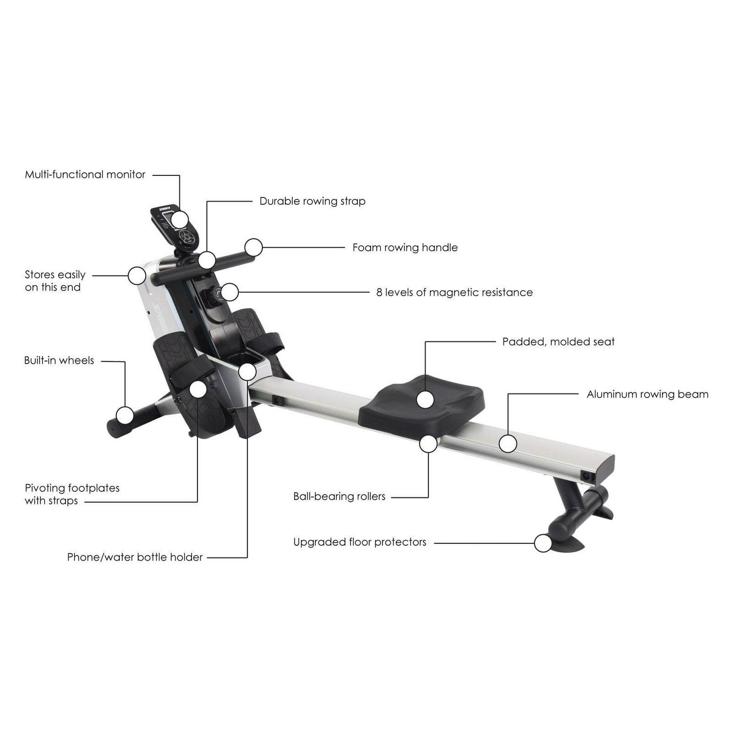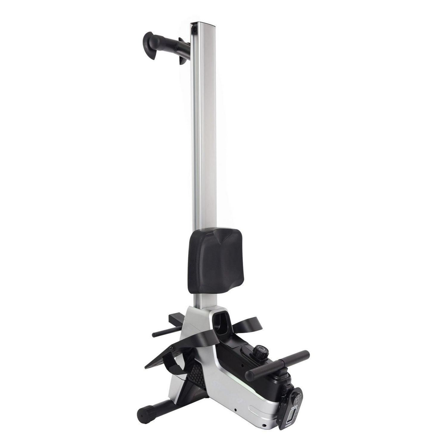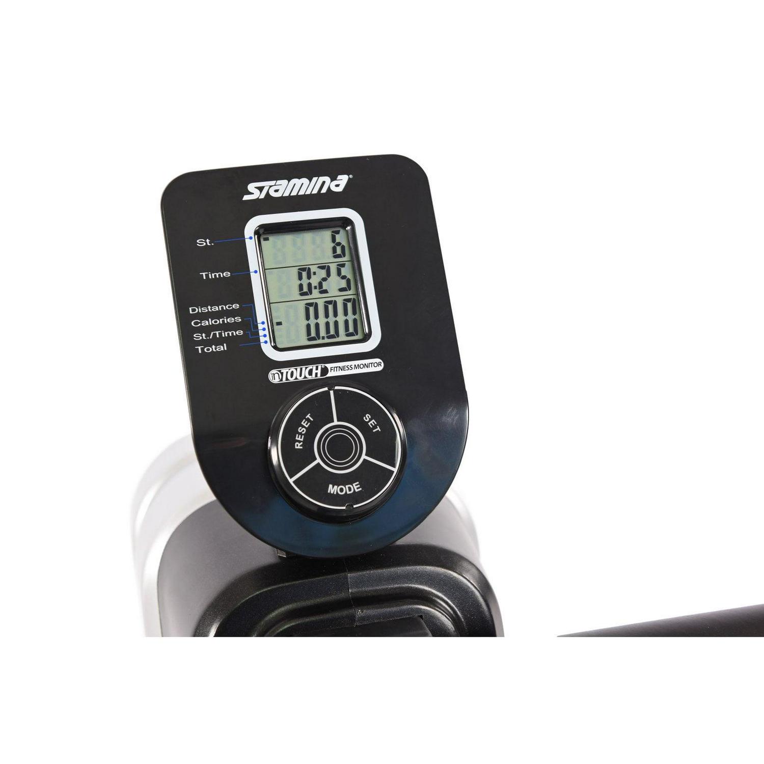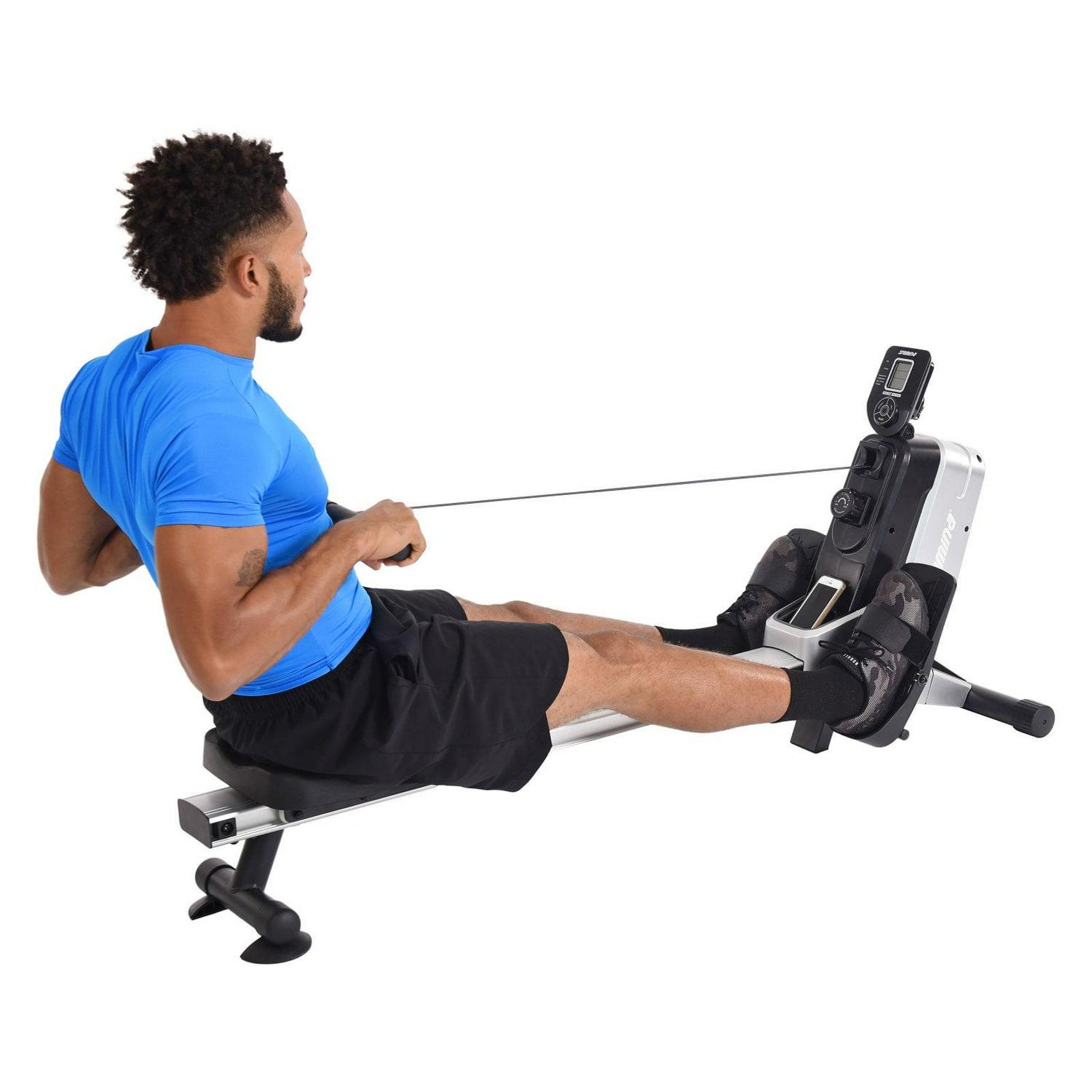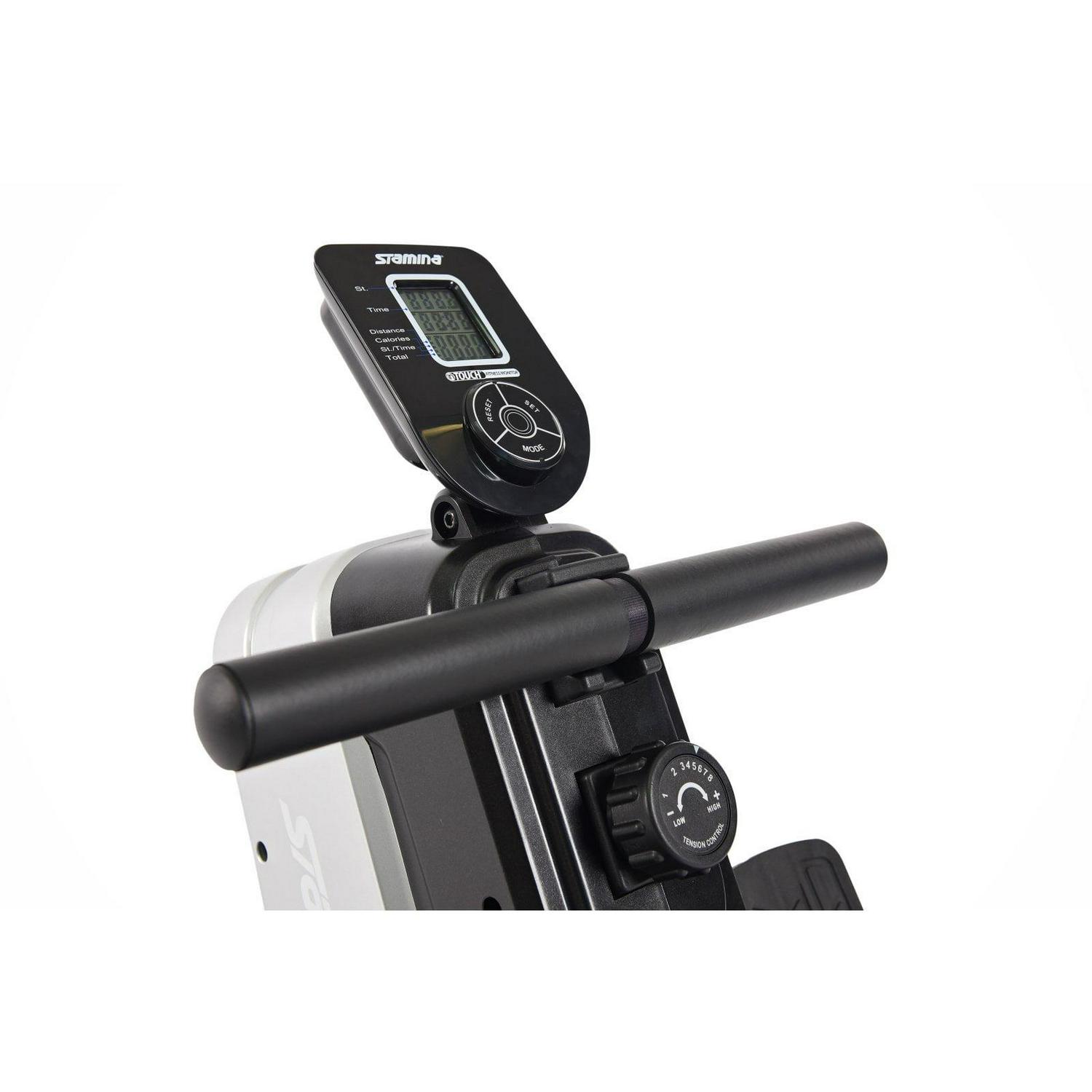 With the Stamina Magnetic Resistance Rowing Machine, you’ll be able to improve your cardiovascular fitness and strength your legs, arms, back, abs, and glutes all this one powerful piece of exercise equipment. With this rower, you re trading the crowded gym for the peace and quiet of your own home. Eight levels of adjustable magnetic resistance are quiet enough to row in the same room with others so that you can spend time with family and improve your fitness. This also means you can row at the crack of dawn without waking the entire house. When you re finished with your rowing workout, simply store the rower in a closet or corner on its end. This rower includes many performance and comfort upgrades. The aluminum beam and ball-bearing rollers help the seat glide on both the push-off and return while pivoting footplates and foot straps ensure your feet are secure. With the foam rowing handle, padded seat, and a multi-purpose holder for your beverages or phone, you ll want to row for longer sessions simply because it s comfortable and convenient. Enjoy rowing at home with the Stamina Magnetic Resistance Rowing Machine.