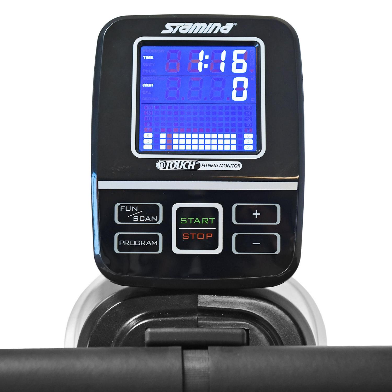Elevate your fitness routine with the Stamina Magnetic Rowing Machine 1130, a complete workout water rowing machine that gives you a full-body workout from the comfort of your own home. With its 16 levels of quiet magnetic resistance and adjustable foot straps, you get the range of motion, security, and smooth rowing stroke you need to revolutionize your workout. This compact rowing machine also comes equipped with a backlit monitor that records your performance and lets you choose from 13 program options. The fitness monitor lets you easily track your heart rate and get more out of your exercise as you improve your cardiovascular performance. Burn fat and build endurance as you track your total strokes, workout time, calories burned, distance covered, and more. The upgraded premium, molded seat, and foam rower machine handle combine comfort and intelligent design. Download the all-in-one müüv app for access to assembly videos, personalized workouts, and ad-free music listening from iHeartRadio. Enjoy a mix of cardio, strength, and flexibility from a full-body workout equipment that targets all the desired muscle groups through high or low-impact exercise settings. The Stamina Magnetic Rowing Machine is one of the best rowing machines for home use. After using it, you can simply stand the machine on its end and store it in a corner or inside a closet.