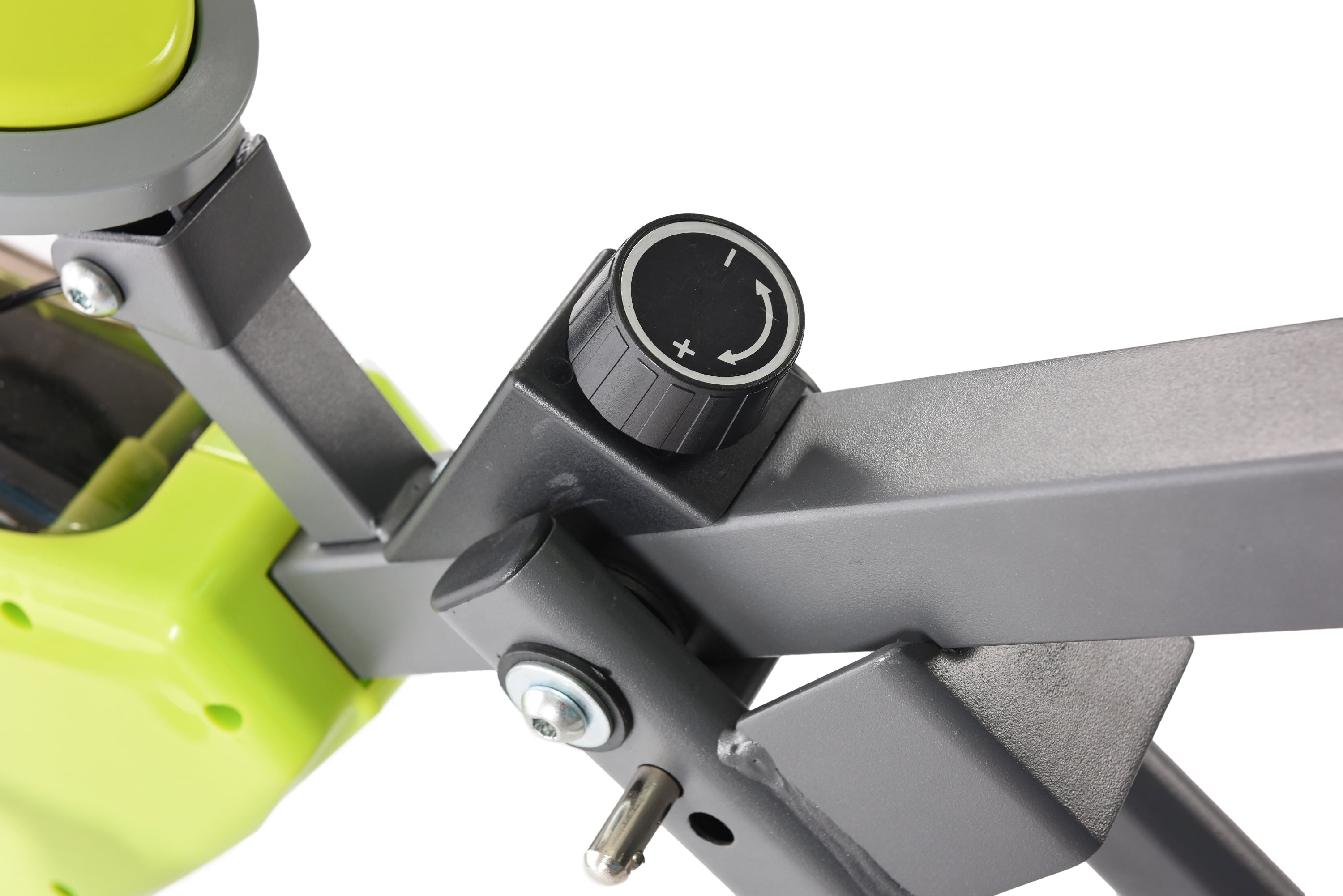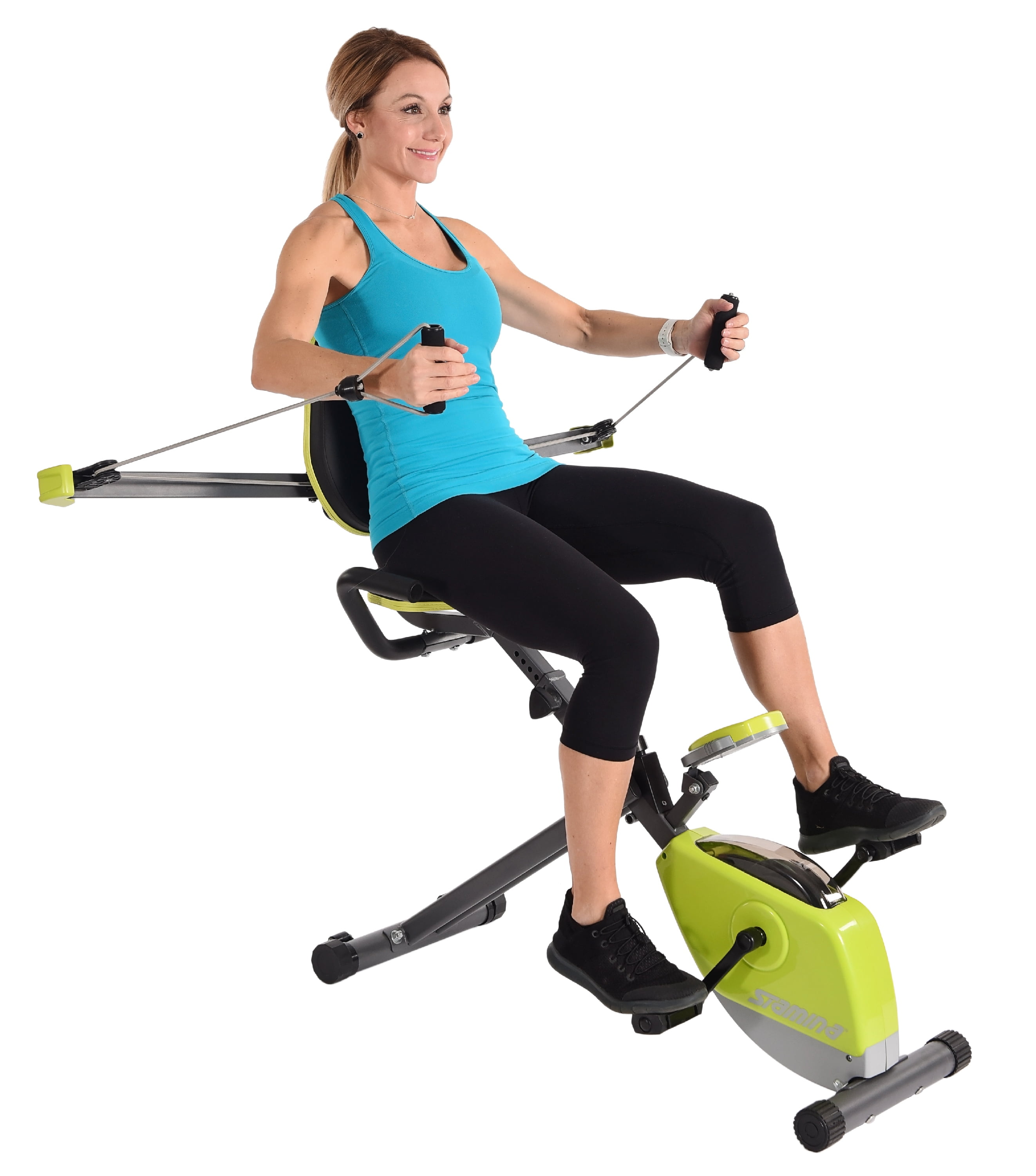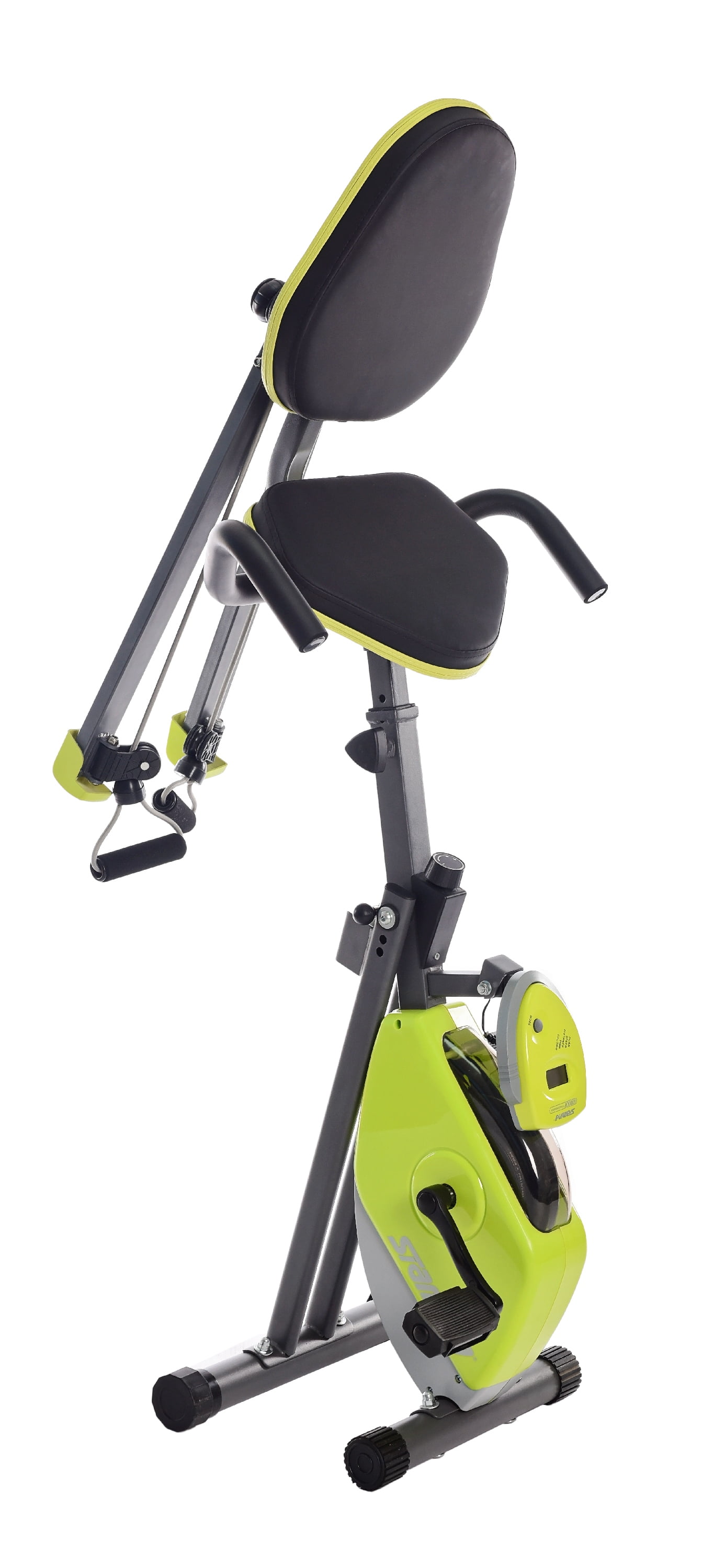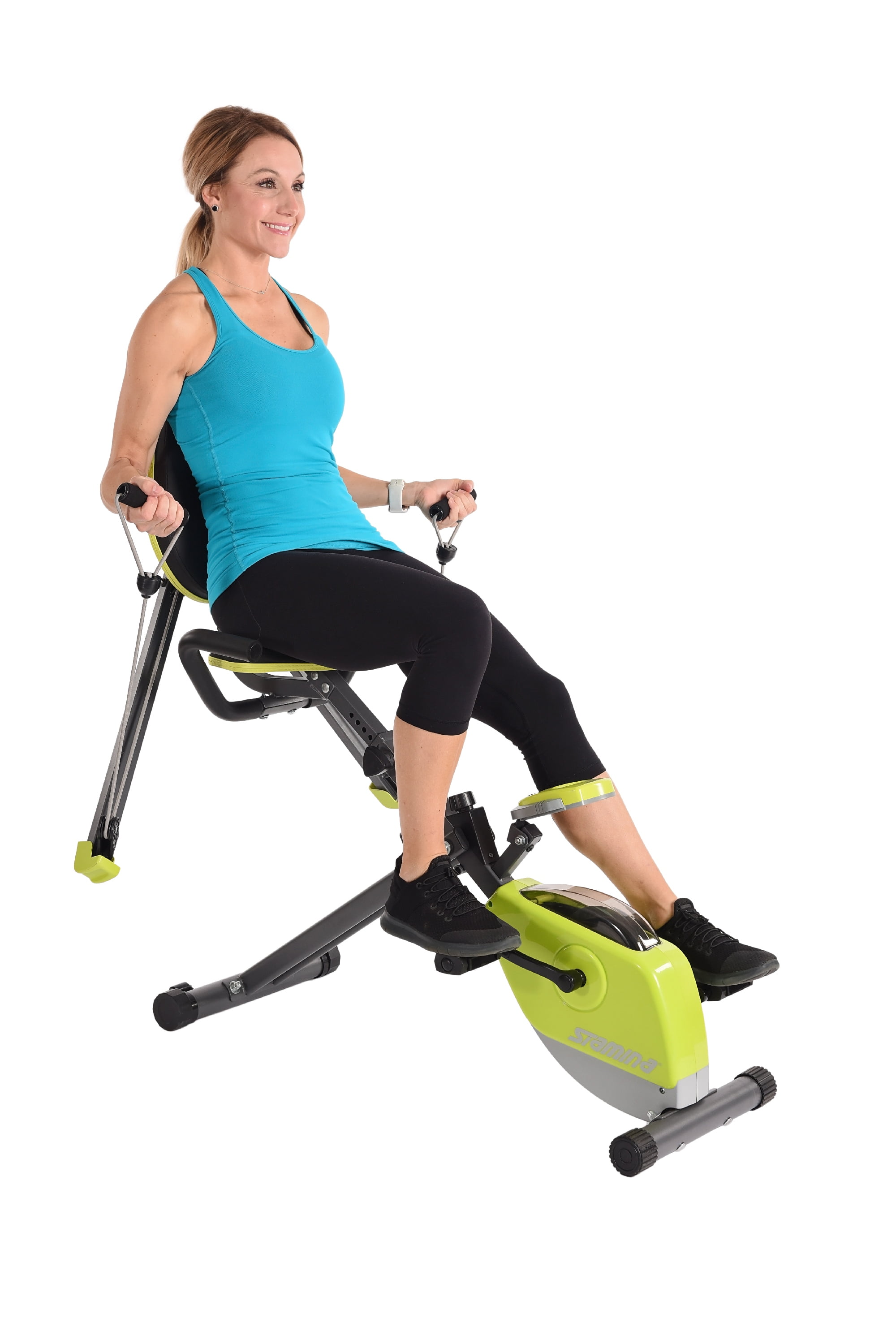 Stamina Wonder Upright Exercise Bike with Upper Body Resistance Arms Wonder Arms add optional upper-body resistance workout with elastic bands Adjustable arm angle for variety of resistance exercises Easy-to-reach tension dial lets you adjust bike workout intensity on-the-fly Multi-function workout monitor displays workout time, calories burned, speed and distance Wide, cushioned seat and backrest for optimal comfort Padded, ergonomic side handles Adjustable seat height Textured pedals for added stability Built-in wheels for easy transport Assembled Dimensions: 48″L x 29.5″W x 52.5″H
