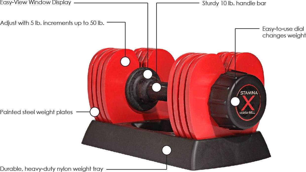 If you re serious about becoming stronger, why pay for dumbbell sets that will limit your potential and your range of productive exercises Each Stamina X Versa-Bell 50 lb. adjustable dumbbell offers nine dumbbell weights in one, shattering the limitations that comes with a single-weight dumbbell. Specifically designed with your continual growth in mind, Stamina s innovative adjustable-weight dumbbell ranges from 10 to 50 pounds.