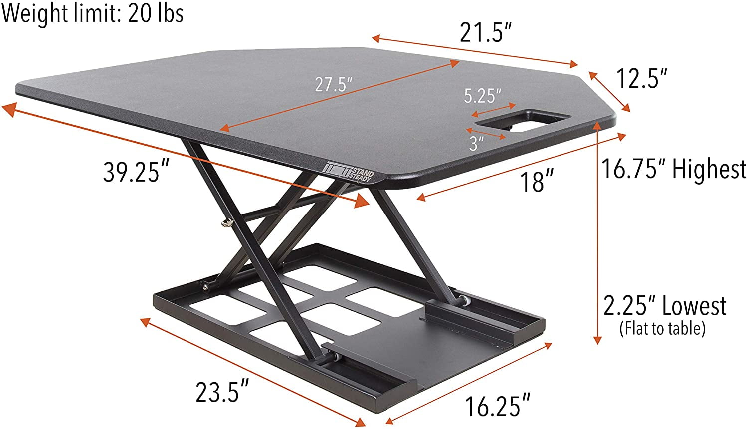 Living a more productive life really can be this simple. With no assembly required, just place your X-Elite Premier Corner Standing Desk Converter by Stand Steady on any desk or surface and use the pneumatic air-assisted lift to smoothly and quickly make any desk sit-to-stand. Want to know more? The X-Elite Premier Corner weighs only 25 lbs. and can support up to 20 lbs. Its desktop is 39.25” long and 18” wide. It can be adjusted anywhere between 2.25” and 16.75” high. The best part? Its compact footprint is only 16.25” long and 23.5” wide while the desktop still provides ample room for all your desk necessities.