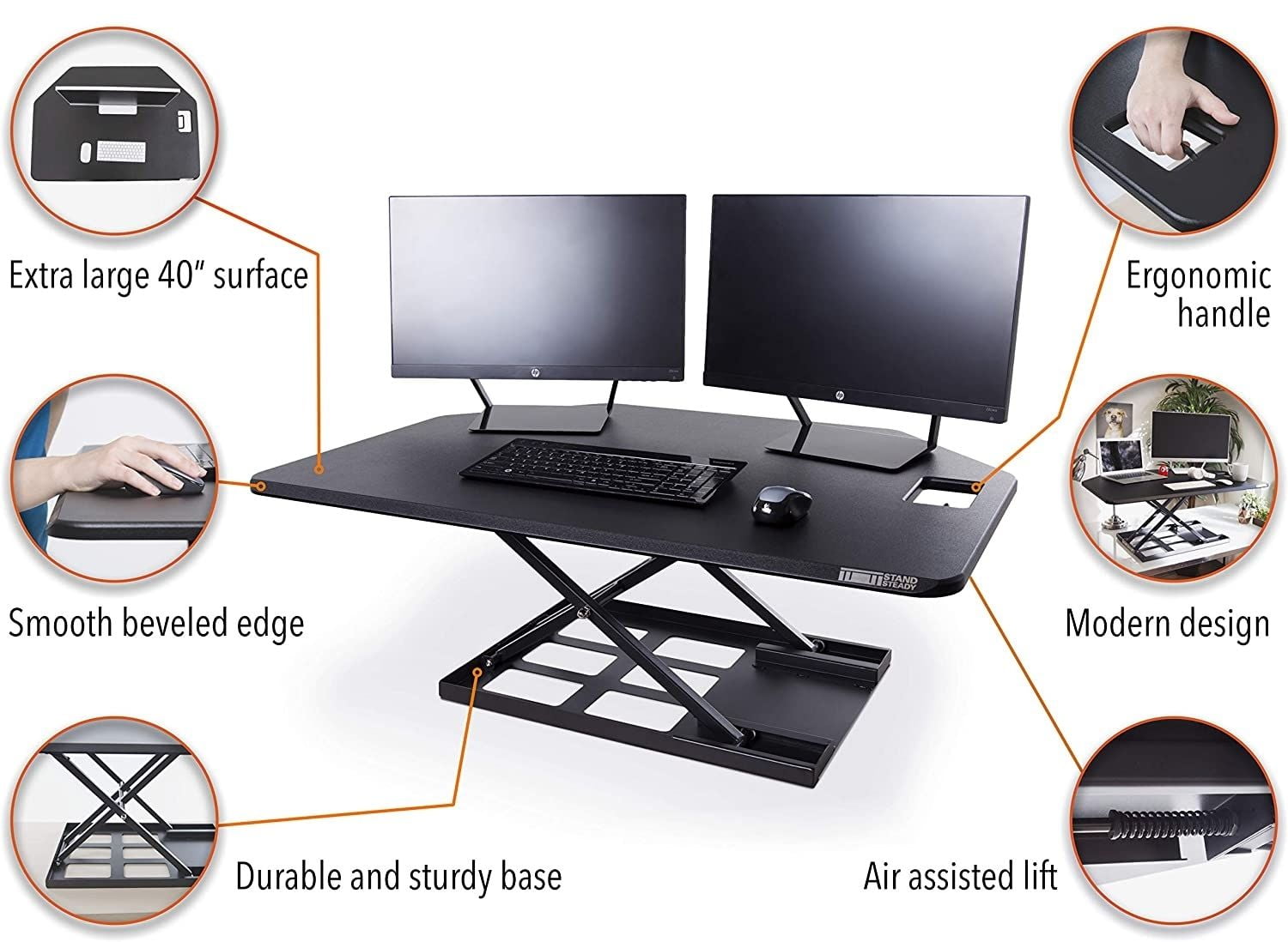 Product Highlights: MODERN DESIGN: The X-Elite Premier Corner’s classic black finish and smooth beveled edge will add a high end feel to any space PNEUMATIC HEIGHT ADJUSTMENT: Go from sitting to standing by using the easy-grip ergonomic handle and let the air assisted lift do the rest SPACIOUS DESKTOP: The extra-large 40″ surface provides plenty of room for up to two monitors, a keyboard, and every accessory you can think of DURABLE & STURDY BASE: Equipped with easy glide tracks and a metal frame, this desk converter will ensure you won’t wobble while you work FULLY ASSEMBLED: Simply open the box, place it on the desired surface and start living your best ergonomic life. Better yet, you can place this on an l-shaped space and easily use it as a corner desk converter