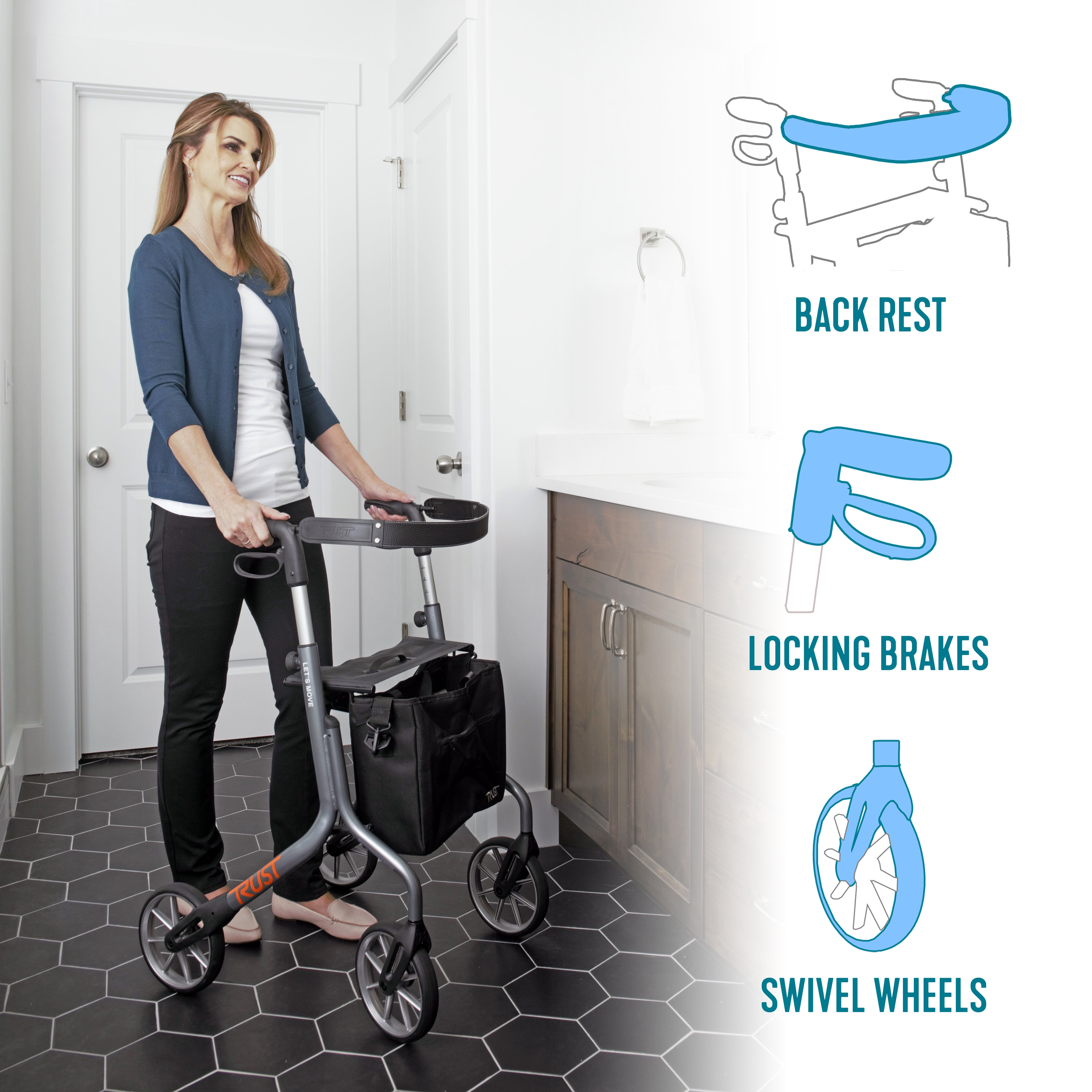 The Stander Let’s Move Rollator by Trust Care is an innovative walking aid that gives users independence, balance, and support while at home or on the go. Weighing only 14.6 lbs, easily navigate narrow hallways, bathrooms, or busy sidewalks with the compact frame and 8 in swivel wheels. The comfortable mesh seat and full back strap provide a convenient place to rest, and the rear locking brake system is built into the ergonomically shaped handles; when not in use activate the parking brake to keep the rollator close by. Conveniently transport items and keep personal belongings close by with the included fabric bag. When folded, the rollator can easily fit in a car for transport or be stored standing up in a closet. Maintain your independence with this versatile walker rollator.