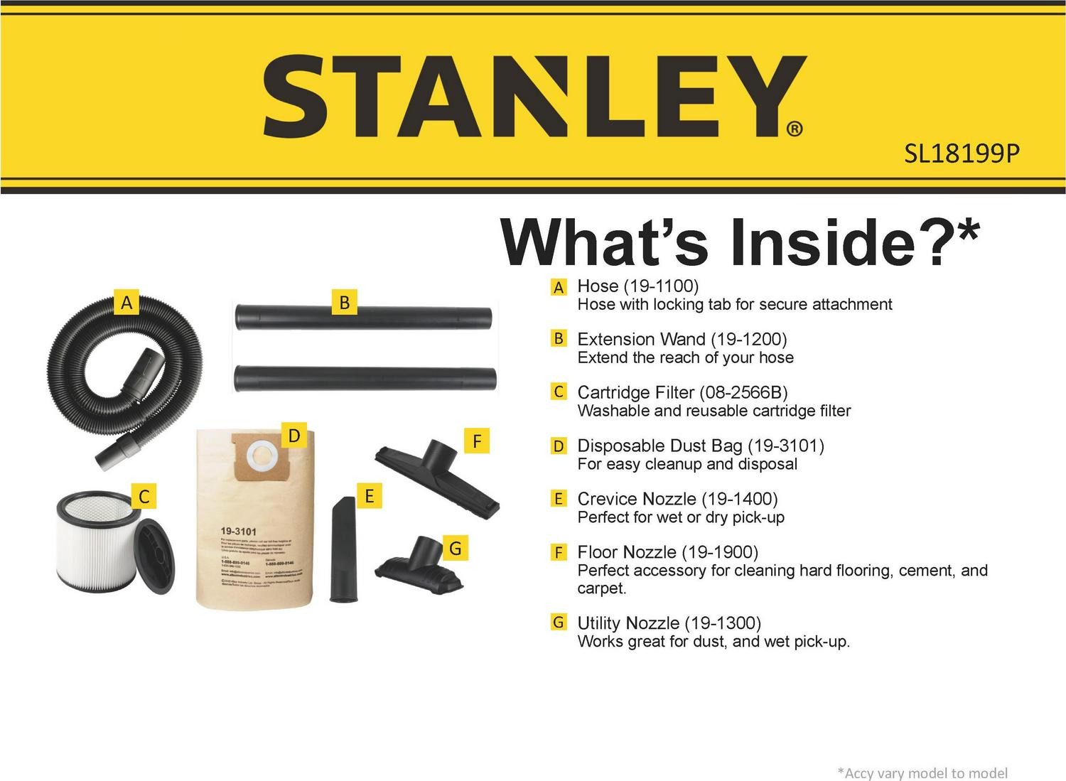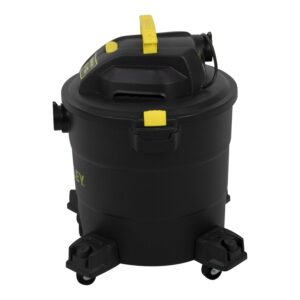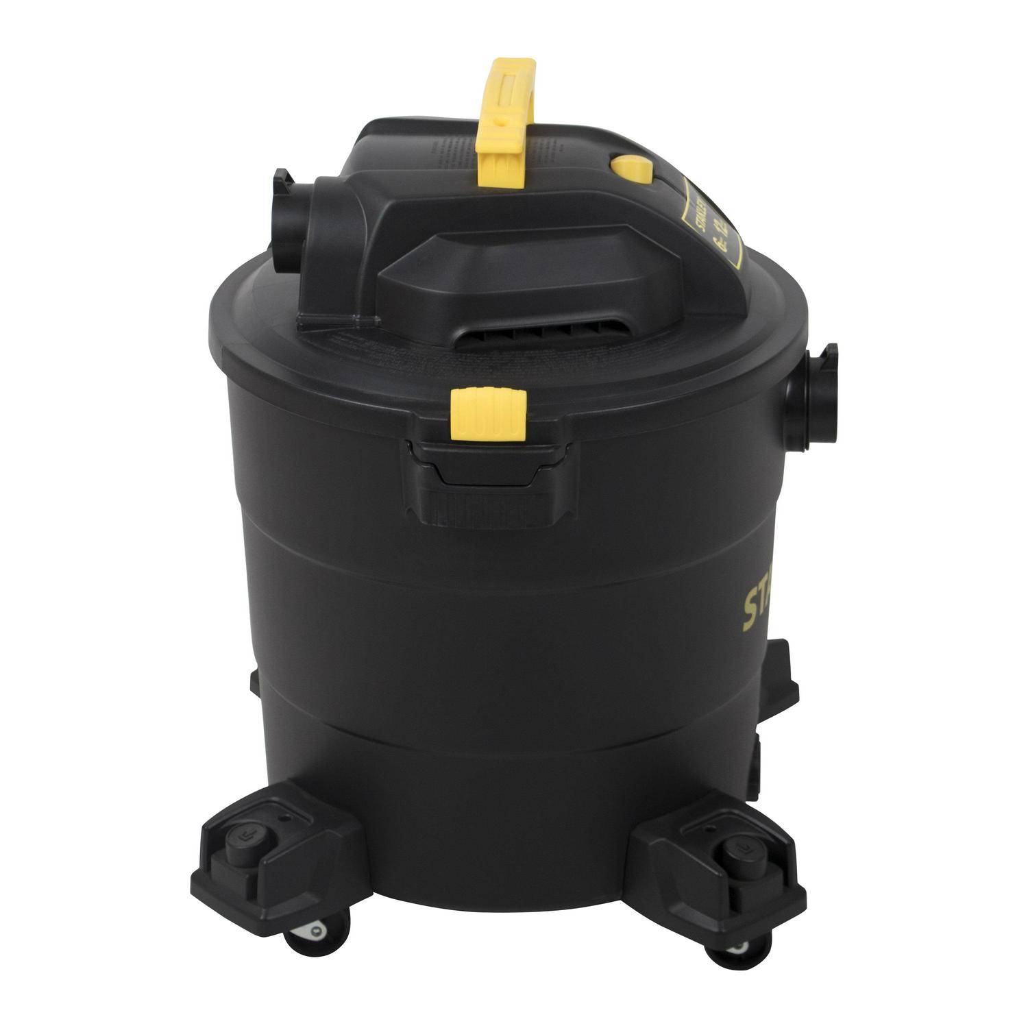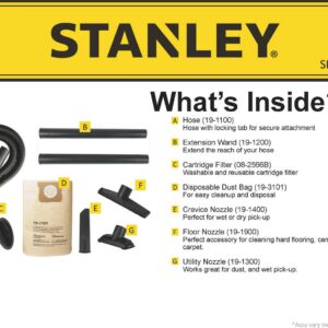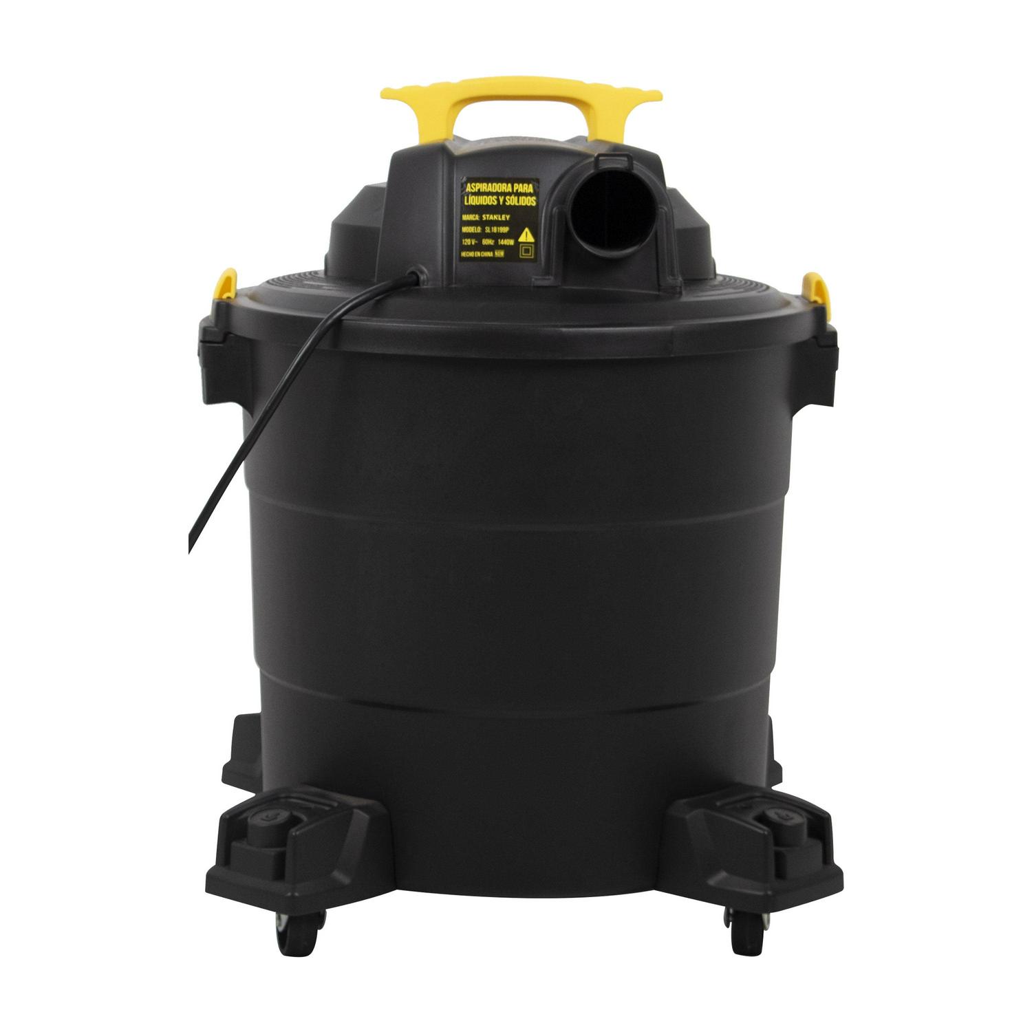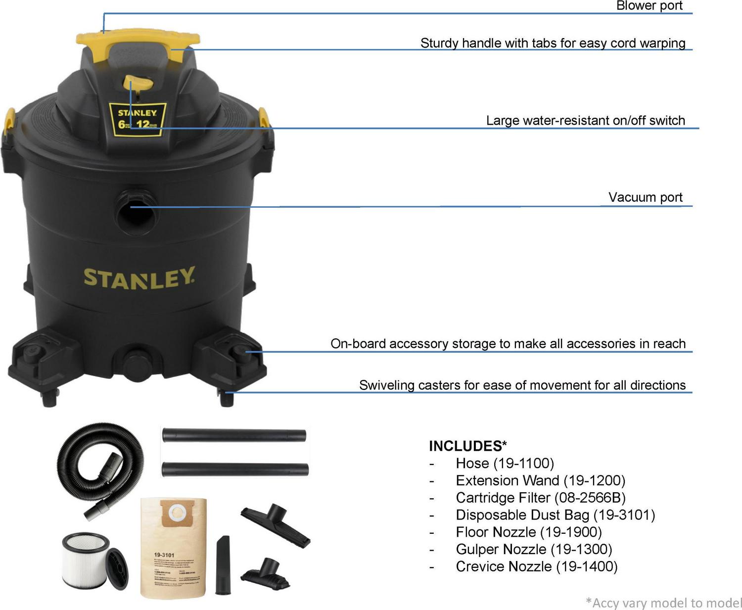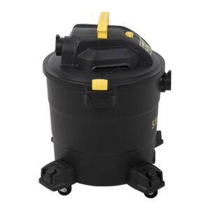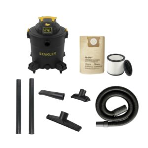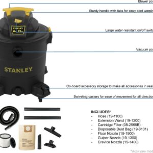 Stanley SL18199P, 5.5-Peak Horsepower, 12-Gallon wet/dry vac, with a powerful heavy-duty motor for industry leading performance, provides maximum suction power for heavy duty pickup. Swivelling casters provide ease of movement in all directions. The powerful rear blower port instantly converts vacuum to power blower. Other features include a quick lock hose, 10′ power cord with cord wrap design and an accessory holder keep your accessories organized. Accessories include 1-7/8-inch wide by 6-foot long hose, two extension wands, utility nozzle, crevice nozzle, 10-inch floor nozzle and cartridge filter and dust bag.