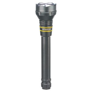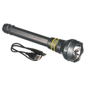 The Stanley 1000 lumen LED rechargeable flashlight is a practical solution for the campsite, the worksite, or unexpected power outages. It combines a tough, waterproof aluminum housing with high-intensity LED, and a rechargeable lithium-ion battery to provide up to 9.5 hours of continuous illumination on a single charge. It’s also got 2-way USB charging, allowing the flashlight to double as a portable power bank and charge up your smartphone or personal electronics. The integrated lithium-ion battery can hold a charge for up to 12 months in storage, making it a practical choice for emergency use. The Stanley 1000 lumen LED rechargeable flashlight.