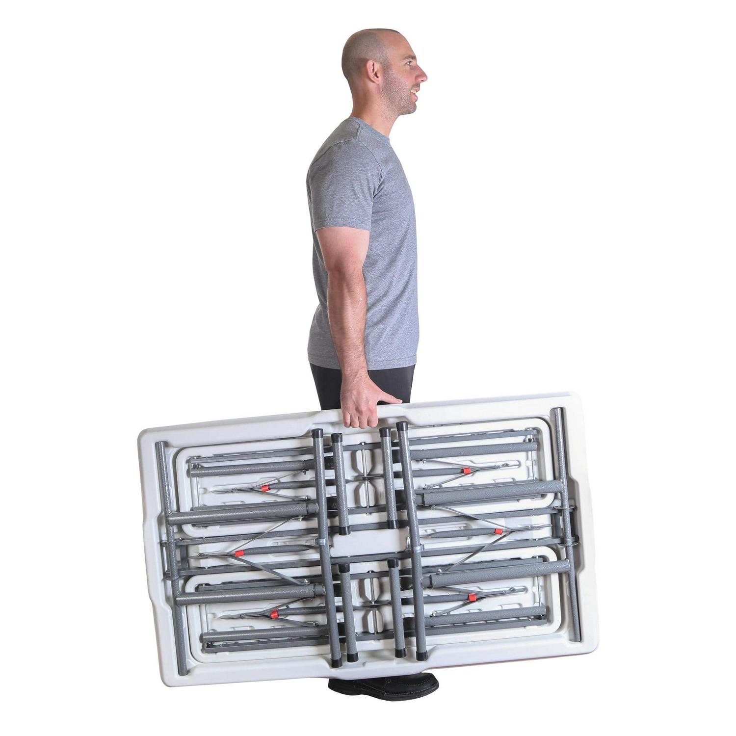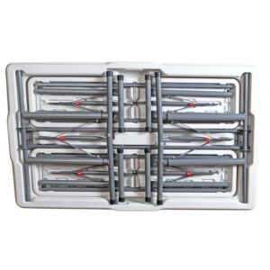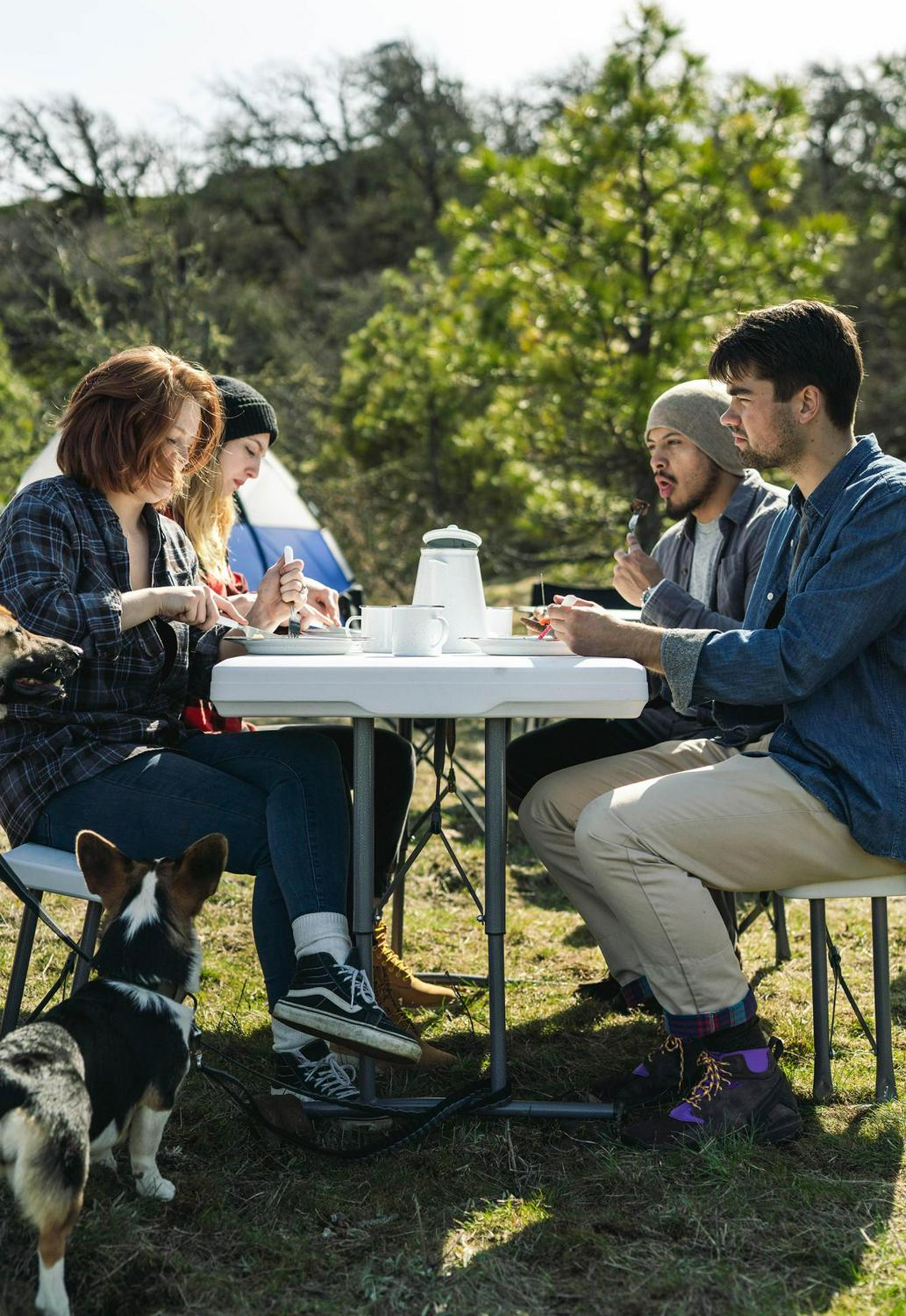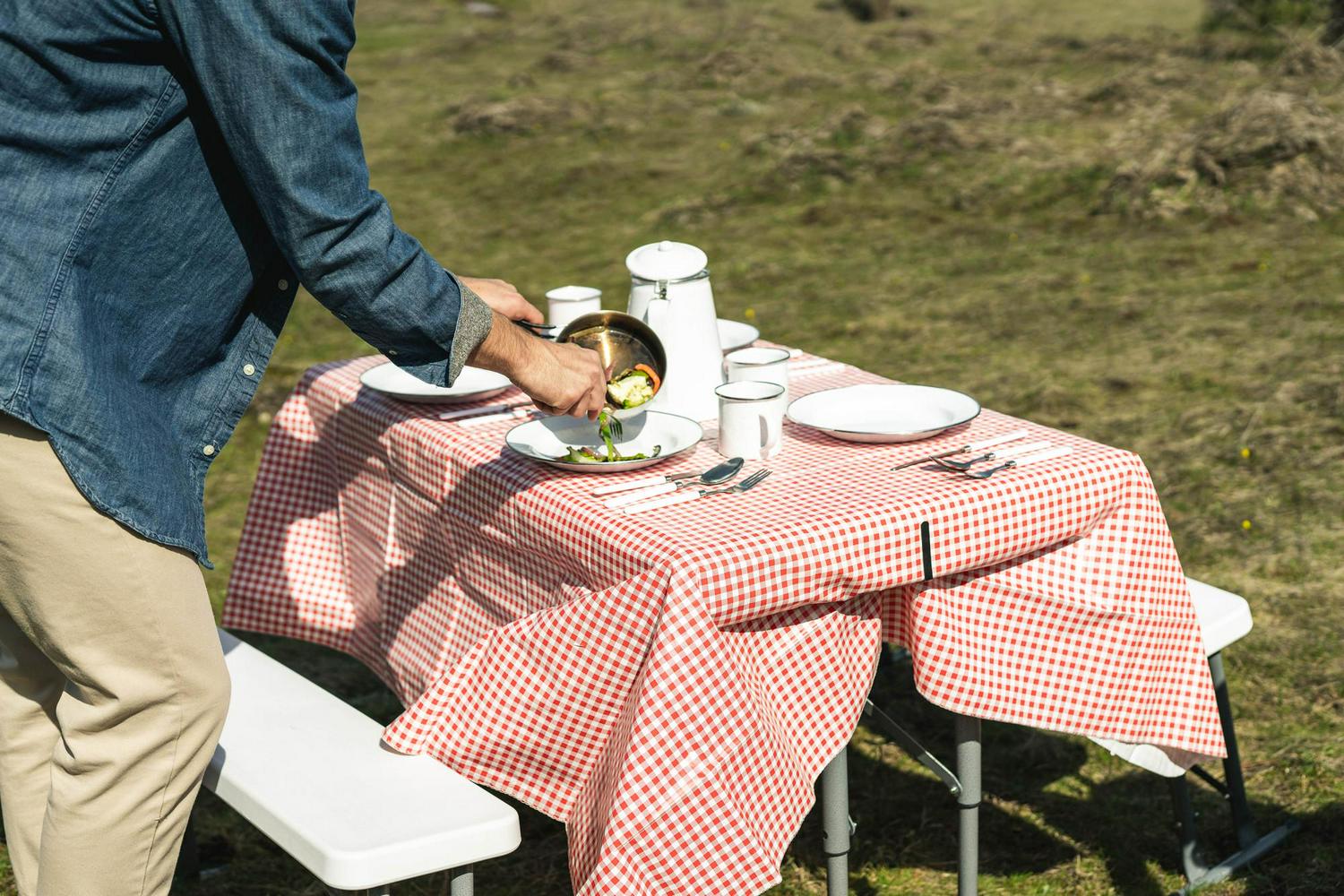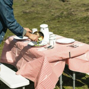 Rugged table and bench set that is great for camping or tailgating. Set up takes a matter of seconds, easily accommodating four hungry campers. Table and bench seats include quality steel telescopic legs allowing the benches to fold fully and nest in the side of the table’s interior.
