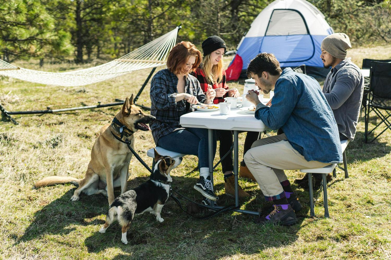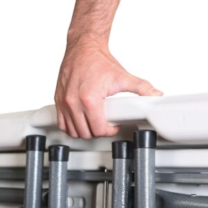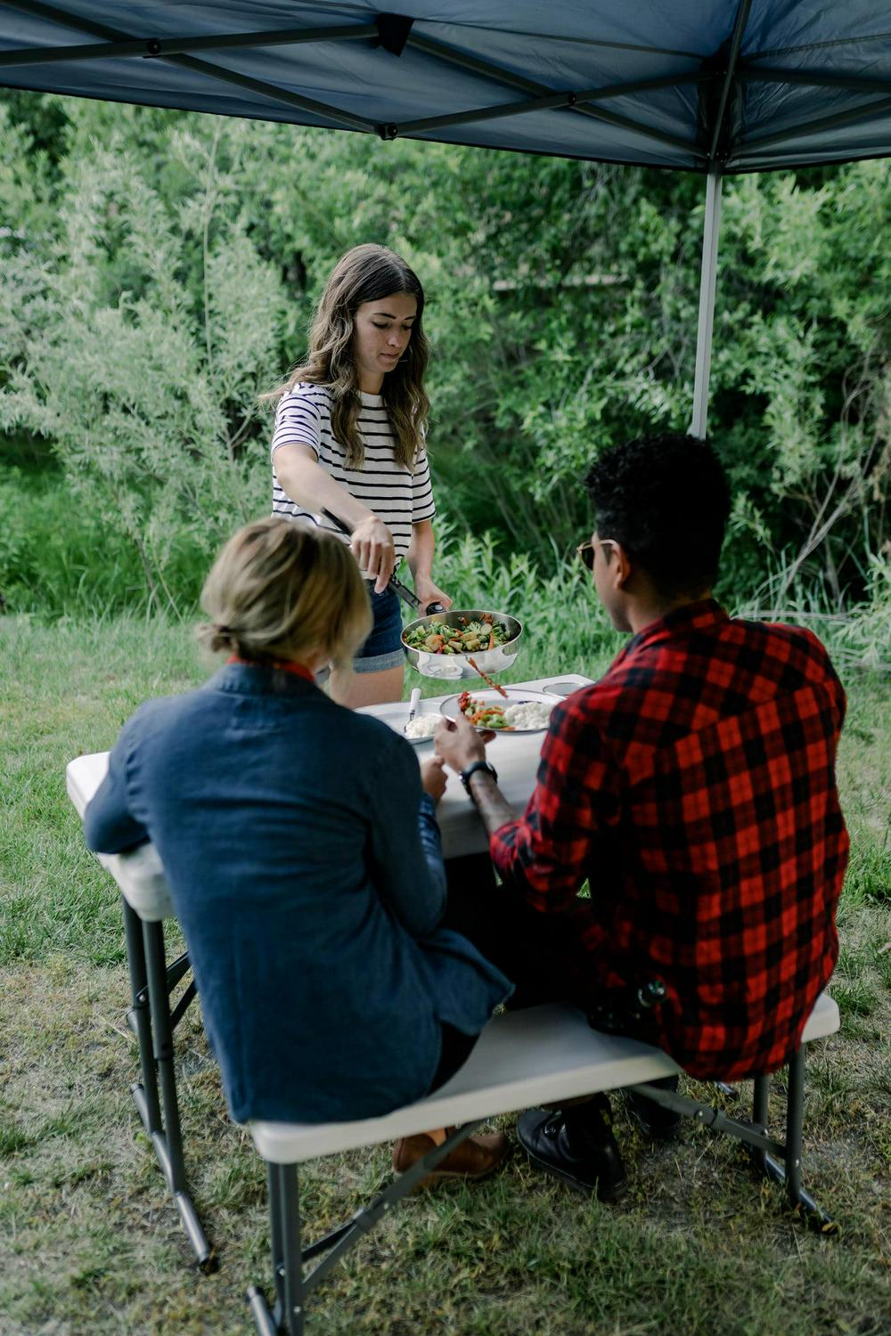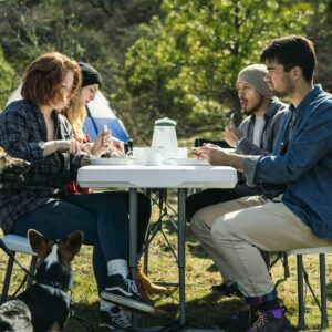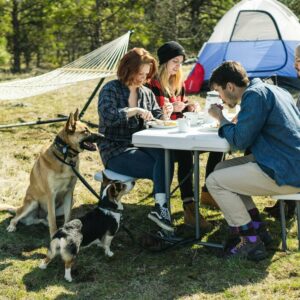 Rugged table and bench set that is great for camping or tailgating. Set up takes a matter of seconds, easily accommodating four hungry campers. Table and bench seats include quality steel telescopic legs allowing the benches to fold fully and nest in the side of the table’s interior.