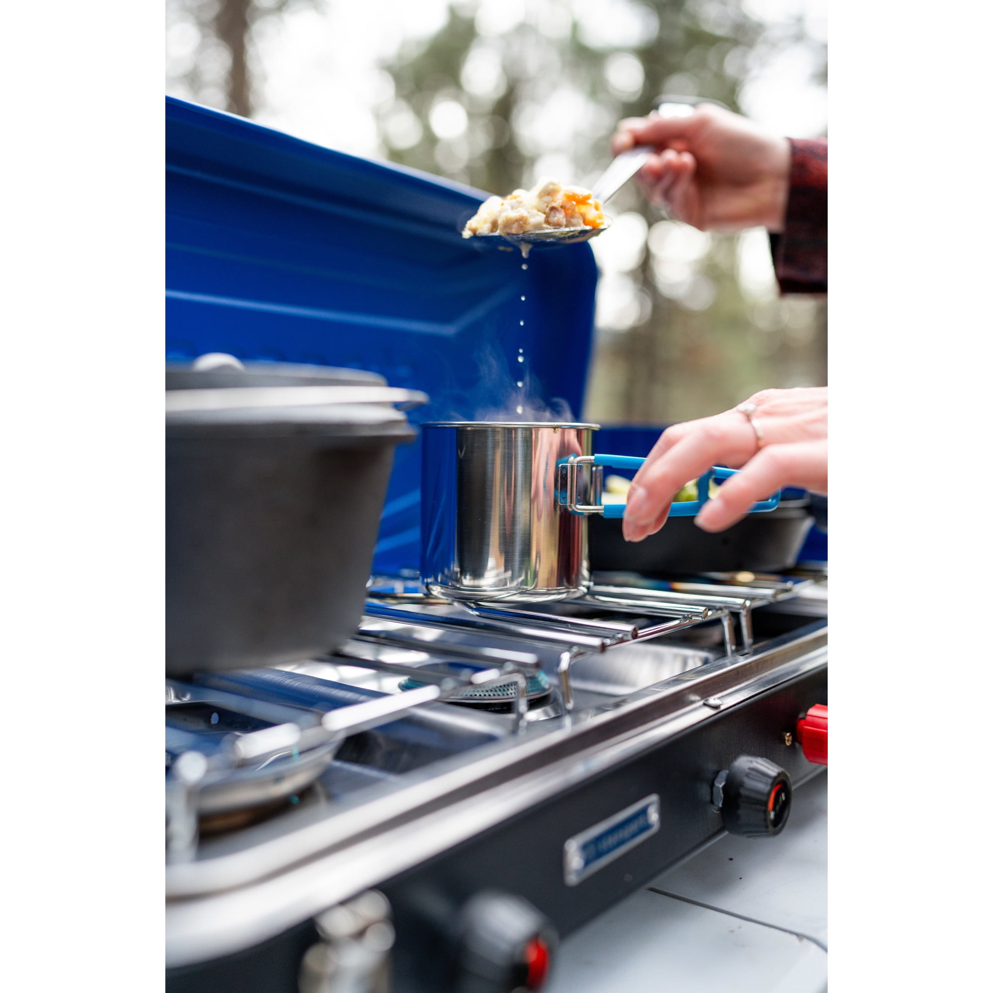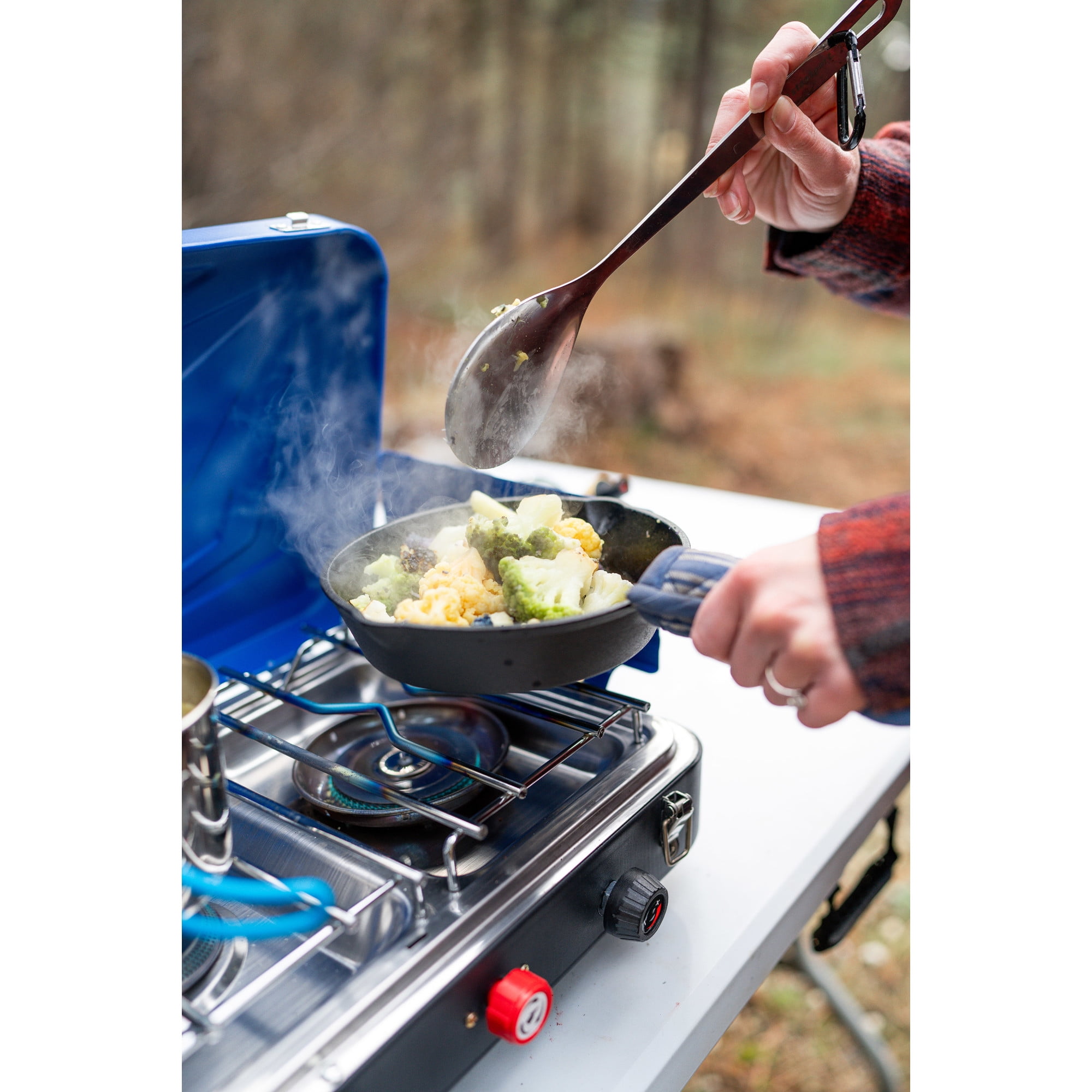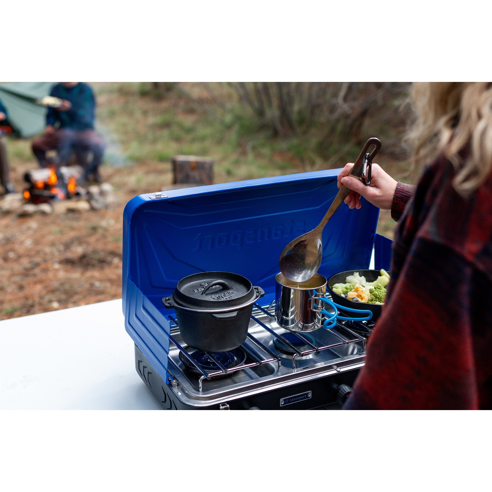 This Stansport 60,000 BTU 3-Burner Propane Stove starts with 2 oversized, stainless steel burner heads with 25,000 BTU of cooking power each. Nestled between them is a 10,000 BTU center burner-ideal for warming sauce or boiling pasta. With the included piezo electronic ignition, you don’t need matches to start cooking. It also comes with a regulator for easy control of your fuel. A steel frame and stainless-steel drip pan ensure this stove is durable and easy to clean. Total of 3 burners.