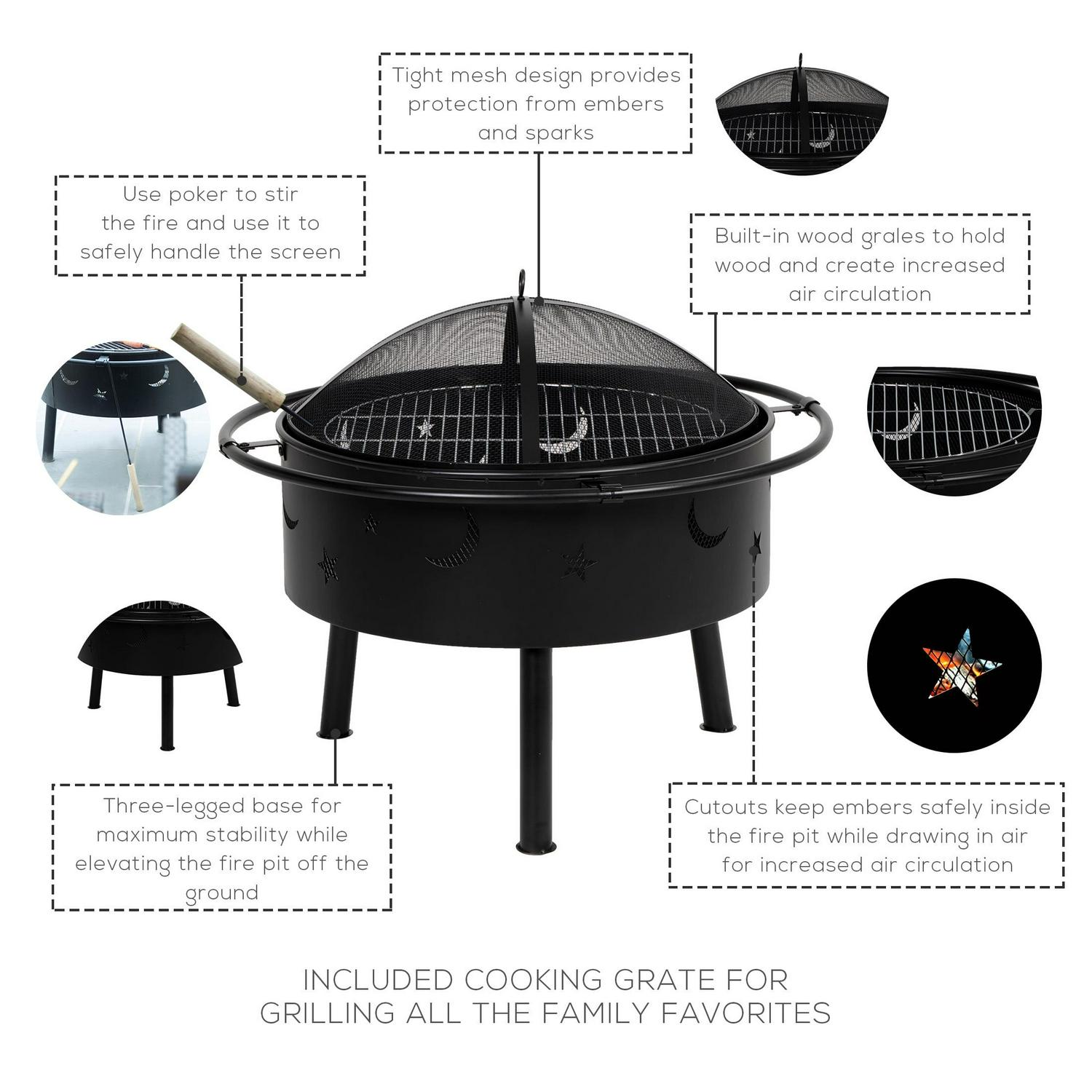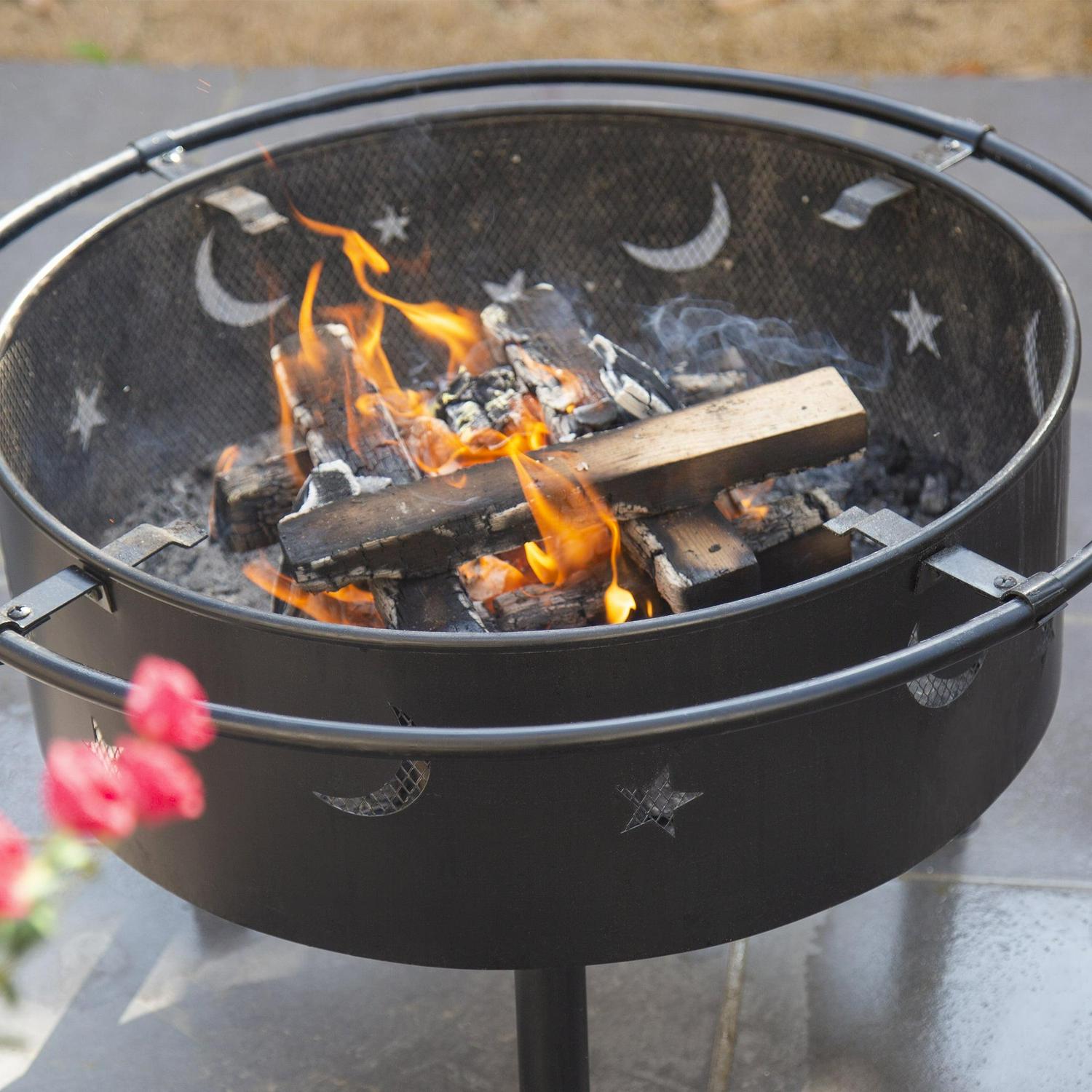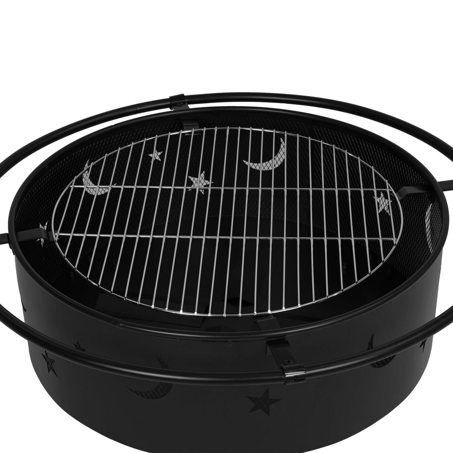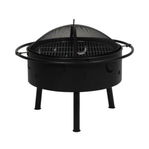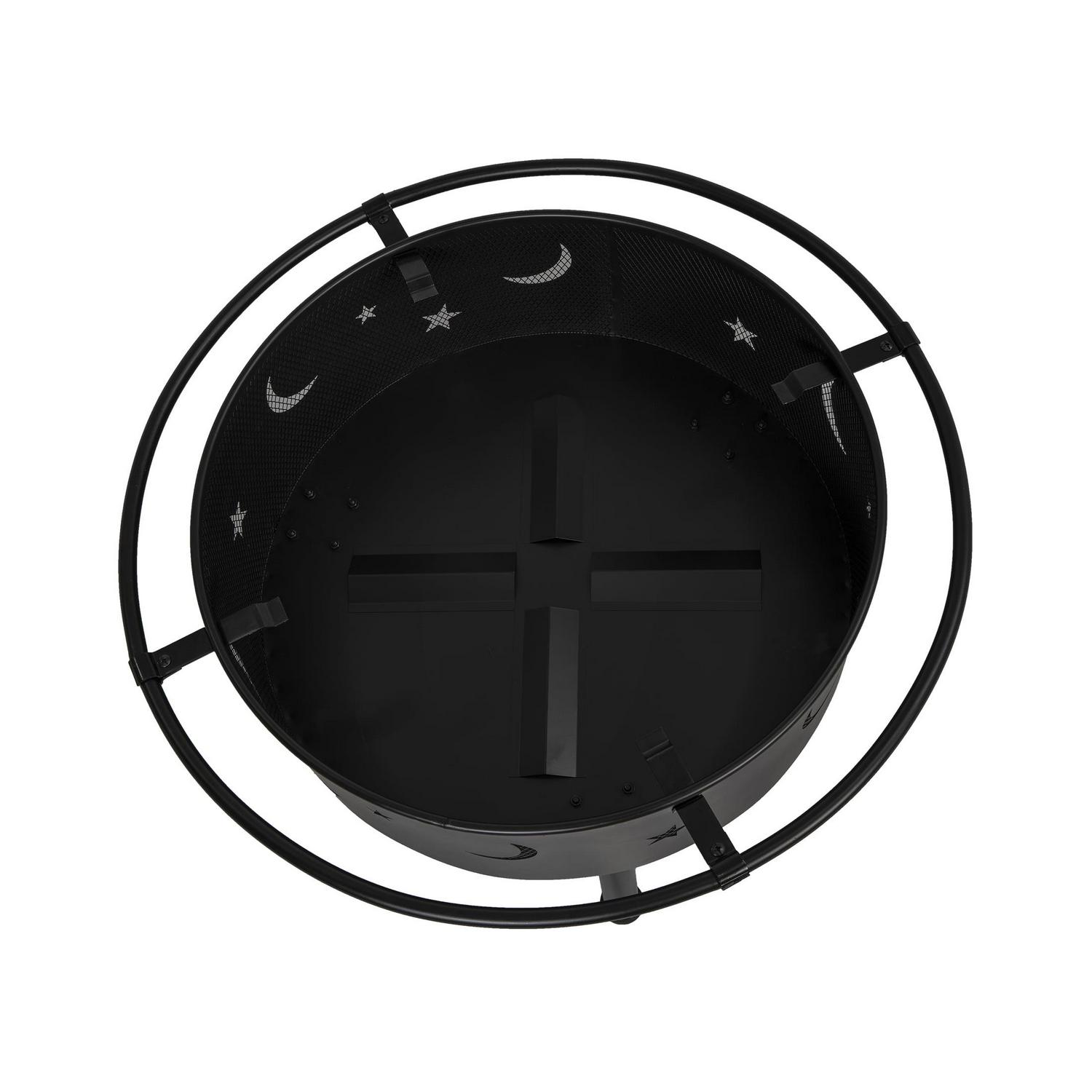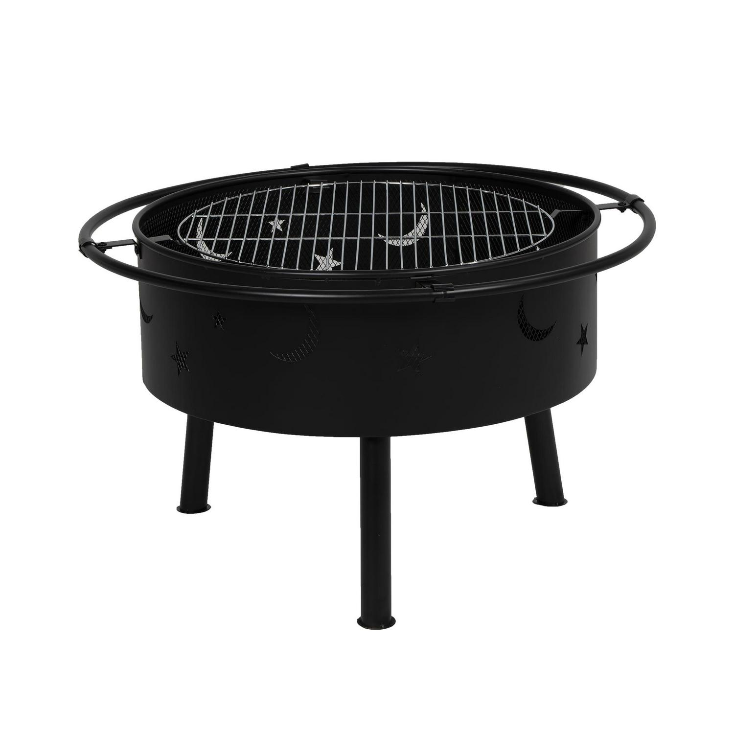 Entertain family and friends all year long with this unique whimsical celestial cutout fire pit. Star and Moon cutouts are not just for show, they are for flow. Each opening allows your fire to last longer due to the circulation of air flow. This robust fire pit is extremely convenient and designed with ease of assembly and transport. The collapsible metal leg construction raises the fire pit above ground which provides stability and easy to store. Included with this fire pit is the tight mesh design spark guard cover to ensure safety and poker to keep the coals burning and safely handle the screen. Don’t miss out on creating lasting memories with this incredibly compact designed product.