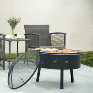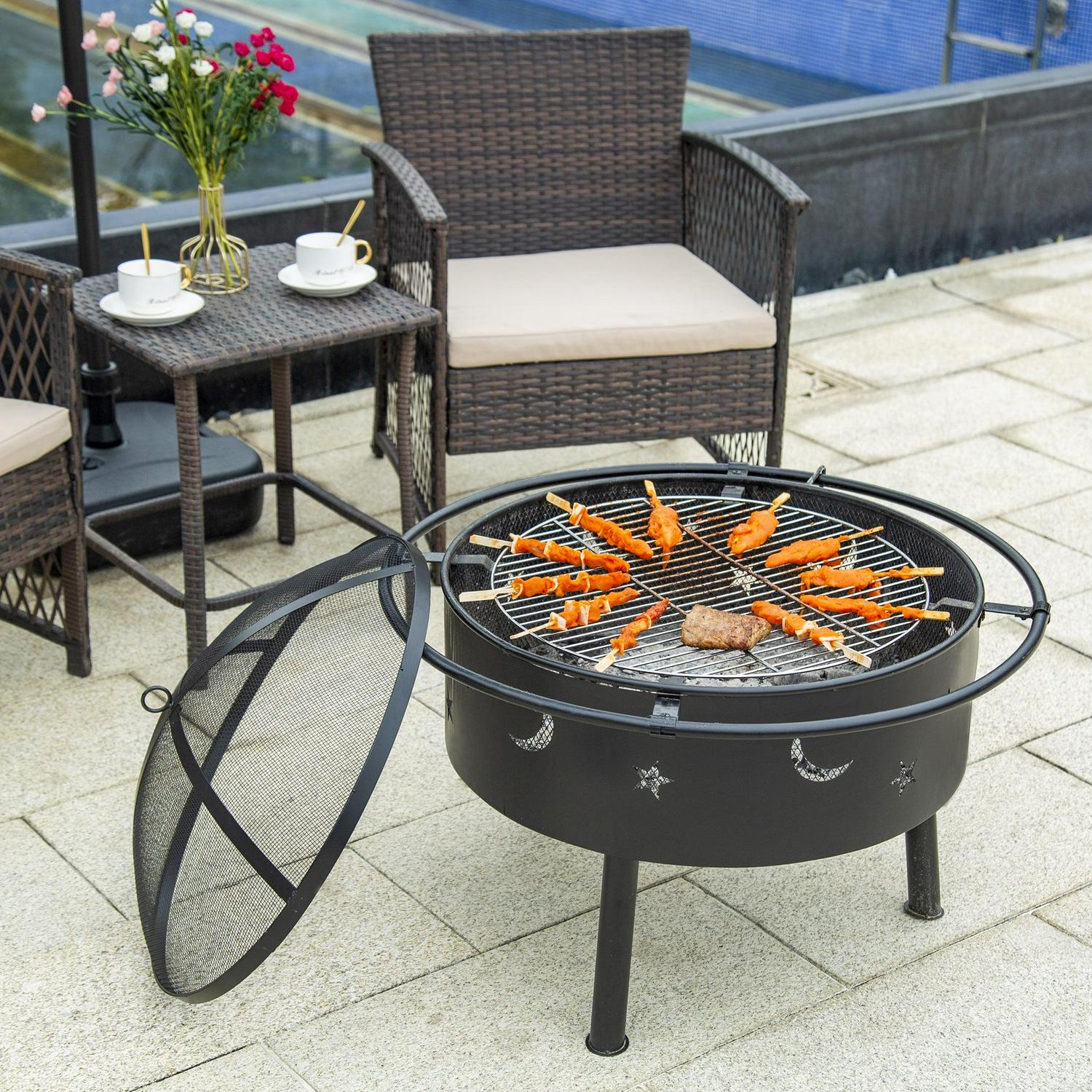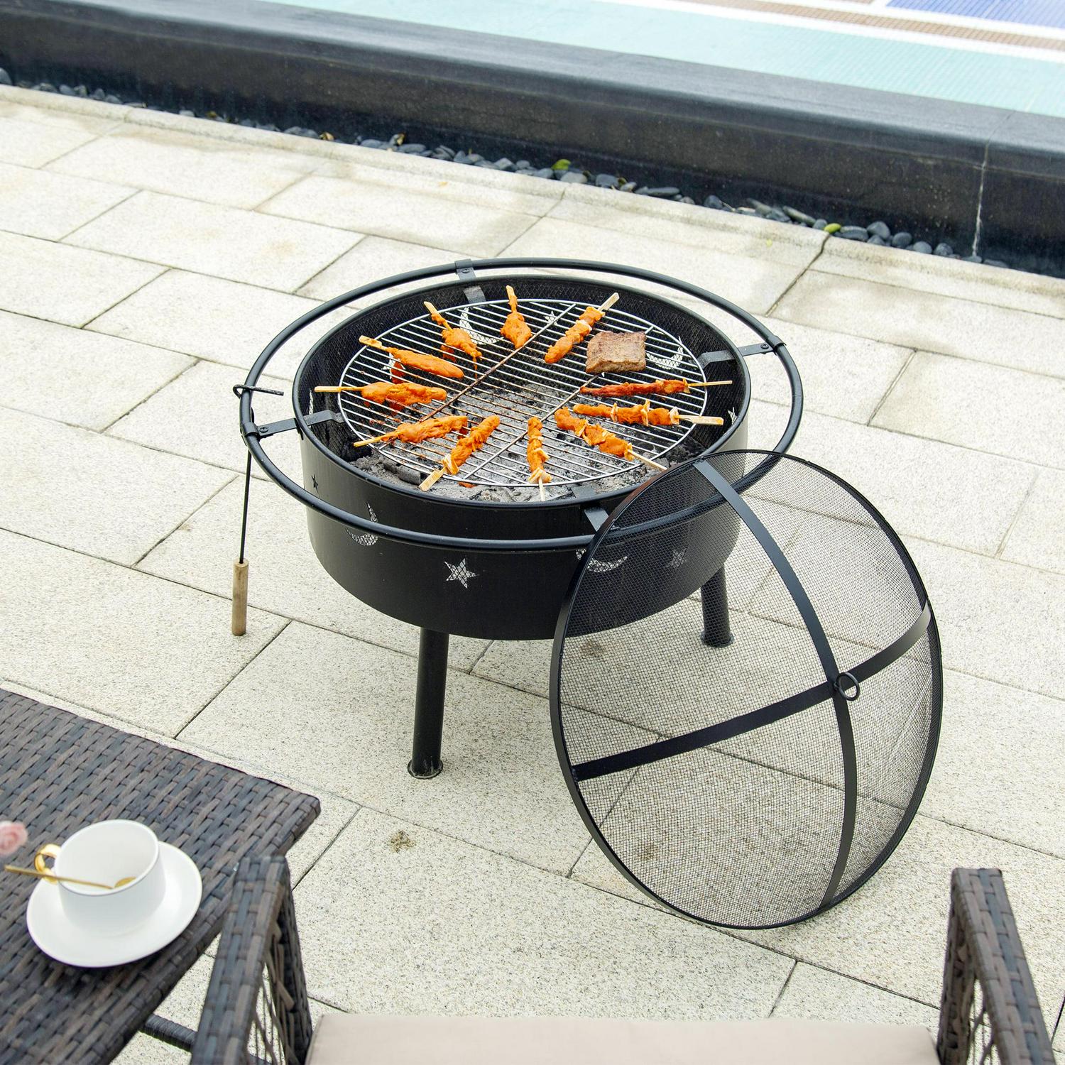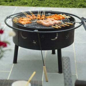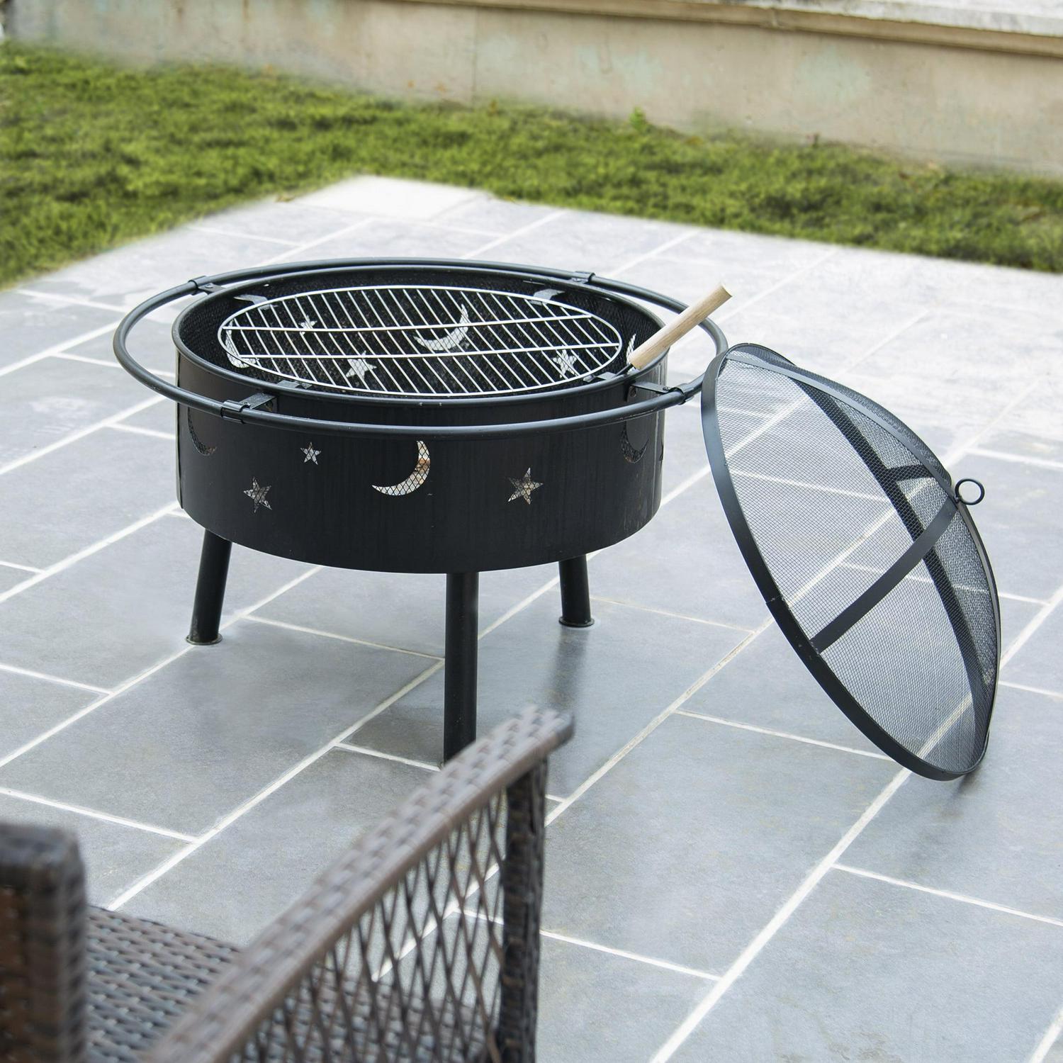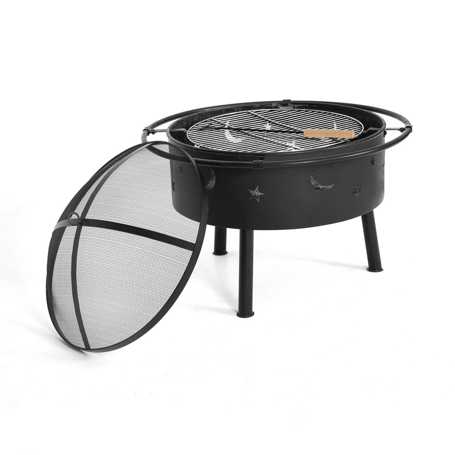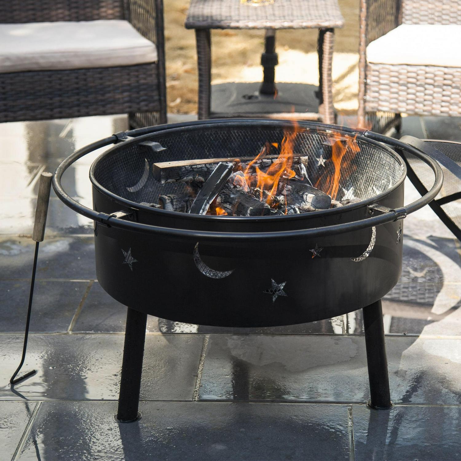 Entertain family and friends all year long with this unique whimsical celestial cutout fire pit. Star and Moon cutouts are not just for show, they are for flow. Each opening allows your fire to last longer due to the circulation of air flow. This robust fire pit is extremely convenient and designed with ease of assembly and transport. The collapsible metal leg construction raises the fire pit above ground which provides stability and easy to store. Included with this fire pit is the tight mesh design spark guard cover to ensure safety and poker to keep the coals burning and safely handle the screen. Don’t miss out on creating lasting memories with this incredibly compact designed product.
