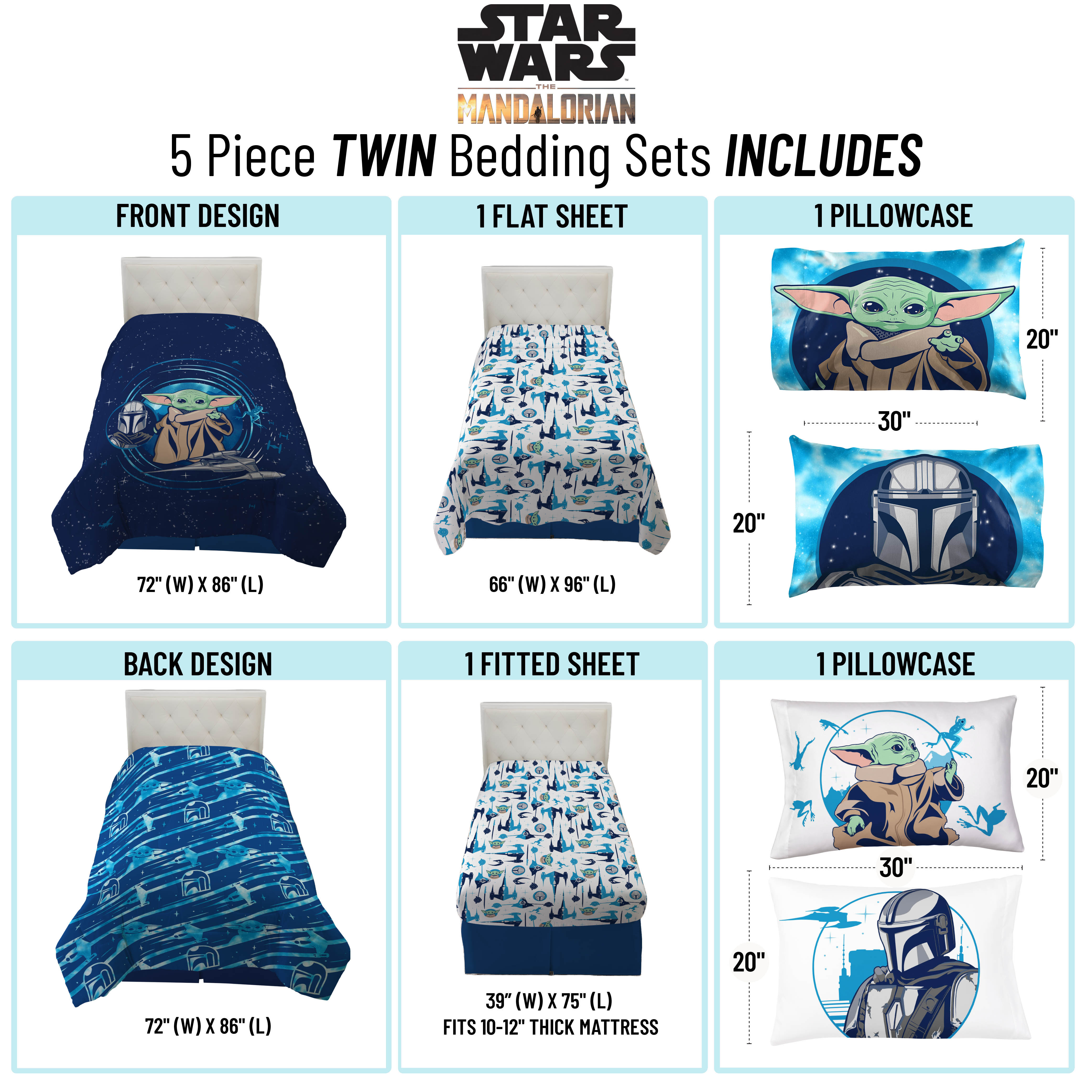 Let wisdom guide you with this 5 Piece Grogu Twin Bed Set with Sham. Set includes a comforter, one sham, fitted sheet, flat sheet, and one standard sized pillowcase. This bed set features Grogu and The Mandolorian on a starry space background . Made from 100% Microfiber, this bed set is the perfect weight to keep you comfortable all year round. Simple care instructions include machine wash cold and tumble dry low. Complete the look by shopping our other Grogu home and bedding items, sold separately on .