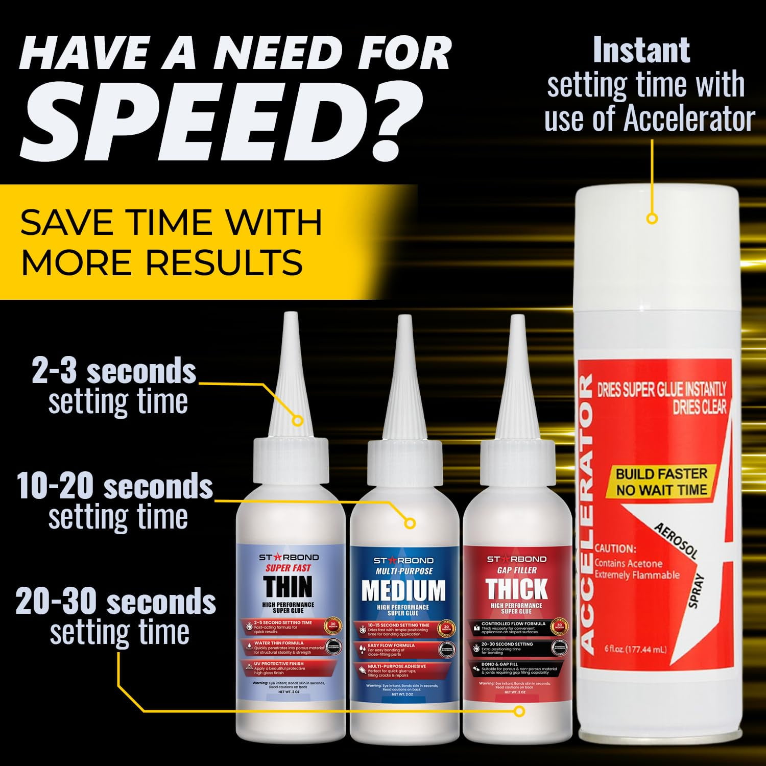 Starbond 2 oz. Thin, 2 oz. Medium, 2 oz. Thick CA Glue with 6 oz. Aerosol Accelerator Bundle, Cyanoacrylate Adhesive Super Glues for Woodworking, Woodturning, Guitar, Hobby