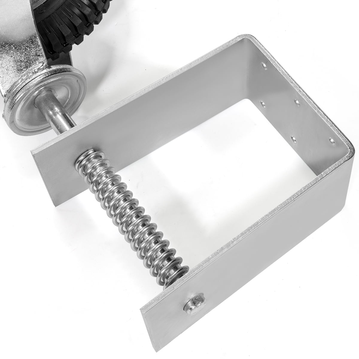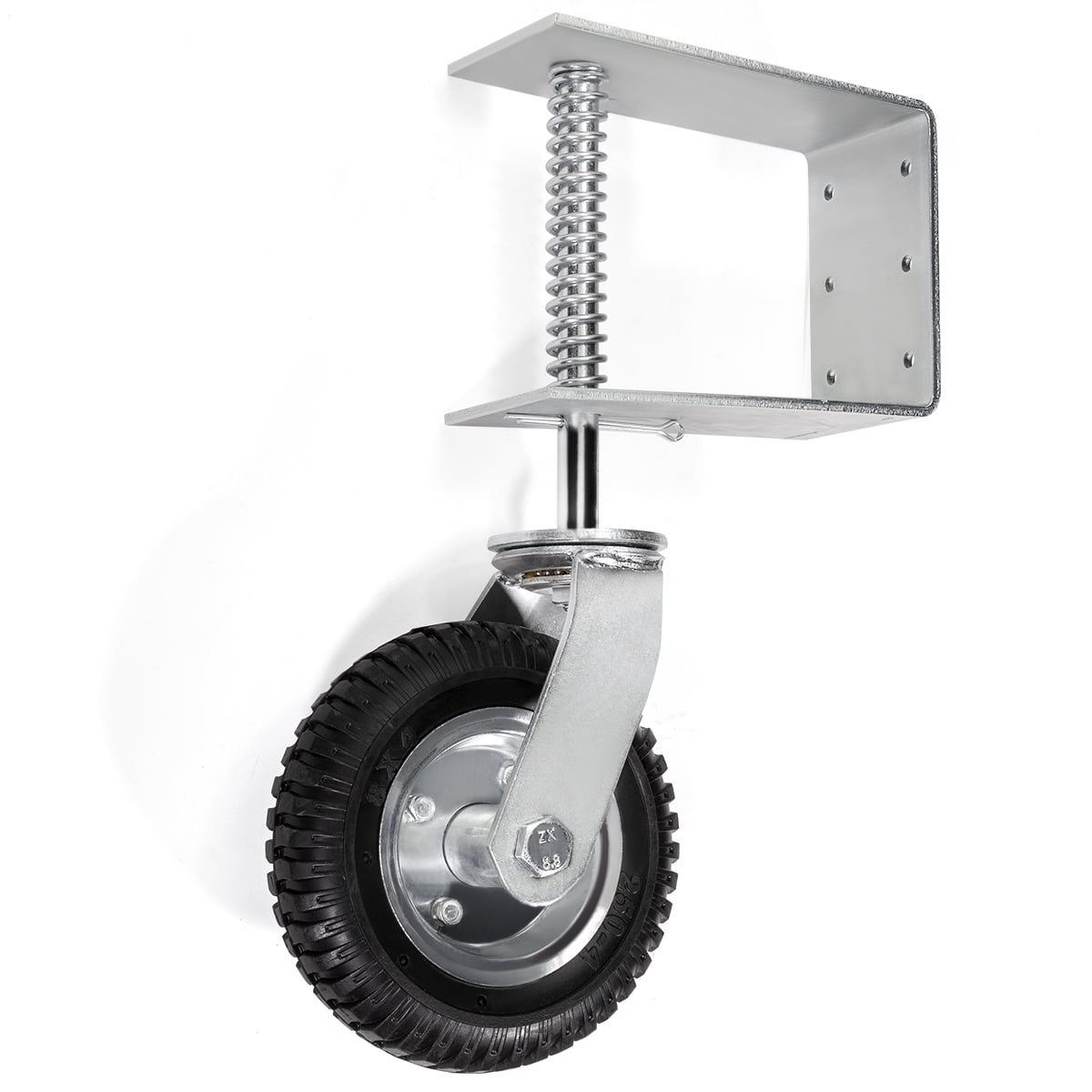 Stark Heavy Duty spring-loaded gate casters adjust with surrounding terrain to maintain gate height throughout the opening and closing cycles. These rotating supports work equally well on level and uneven exterior surfaces such as asphalt, brick, concrete, dirt, grass, gravel and pavers. Spring-loaded vertical travel to smoothly navigate the terrain surrounding the gate Features: Rotating supports – Able to work equally well on level and uneven exterior surfaces such as asphalt, brick, concrete, dirt, grass, gravel and pavers Universal Mounting Plate – Heavy duty universal mounting plate with 6 holes to easily attach to wooden gates or along horizontal or vertical rails of a tubular farm gate Heavy Duty Material – The wheel swivel caster is made of premium rubber material and steel construction, sturdy and durable Easy Mount – Versatile hole pattern also allows for easy mounting to a tubular farm gate along horizontal or vertical gate rails Provide Smooth Movement – Spring suspension smooth out uneven ground Specifications: Color: Silver # of Wheel: 1 Tire Material: Flat-Free Swivel: Yes Frame Material: Steel Max Weight Capacity: 200lbs Tire Size: 8 x 2 Hub Size: 4-3/4″ Wheel Size: 8″ Diameter Overall Dimension: 8″(L) x 4″(W) x 19-1/4″(H) Mount Hardware Included: No Package Content: 1 x Spring Loaded Gate Caster