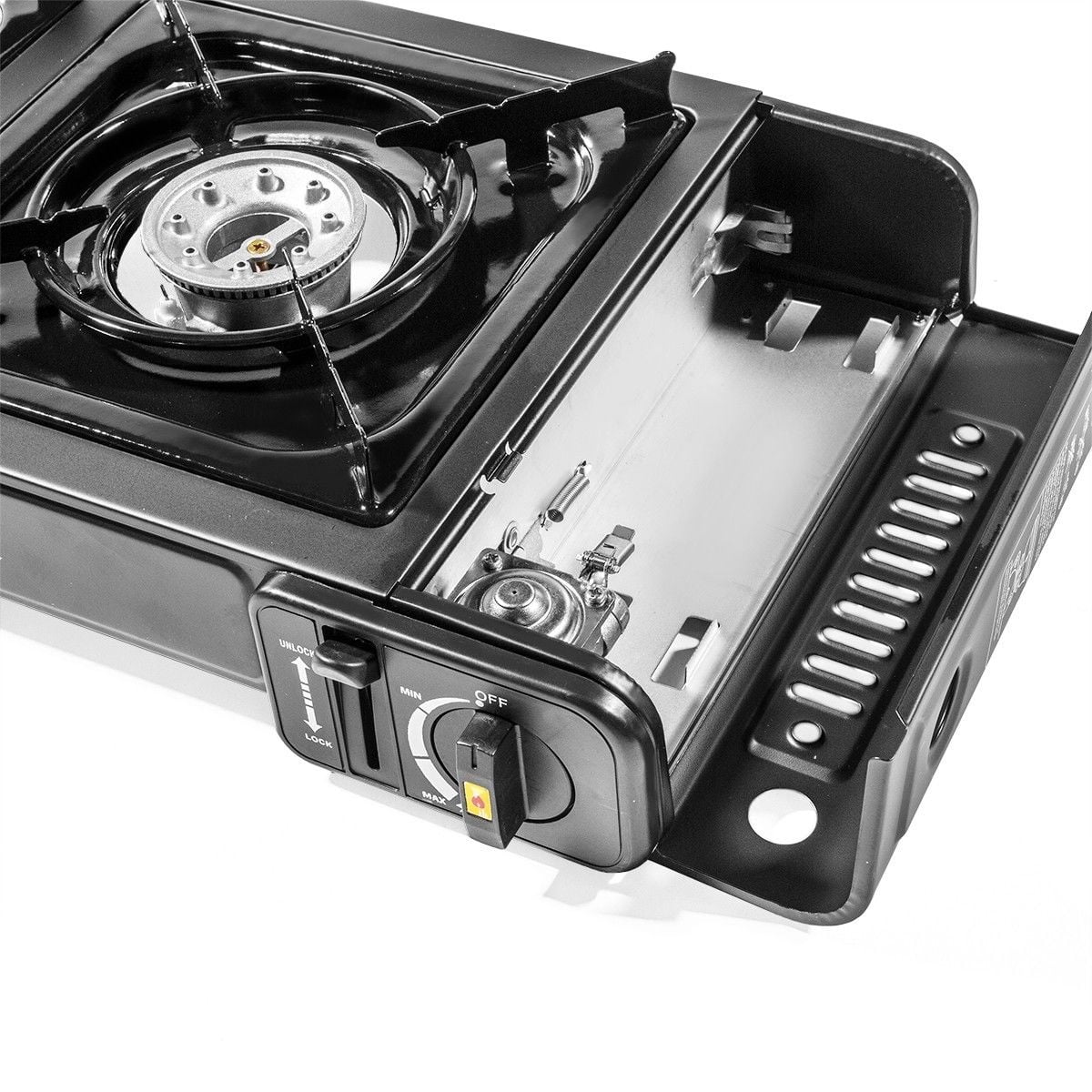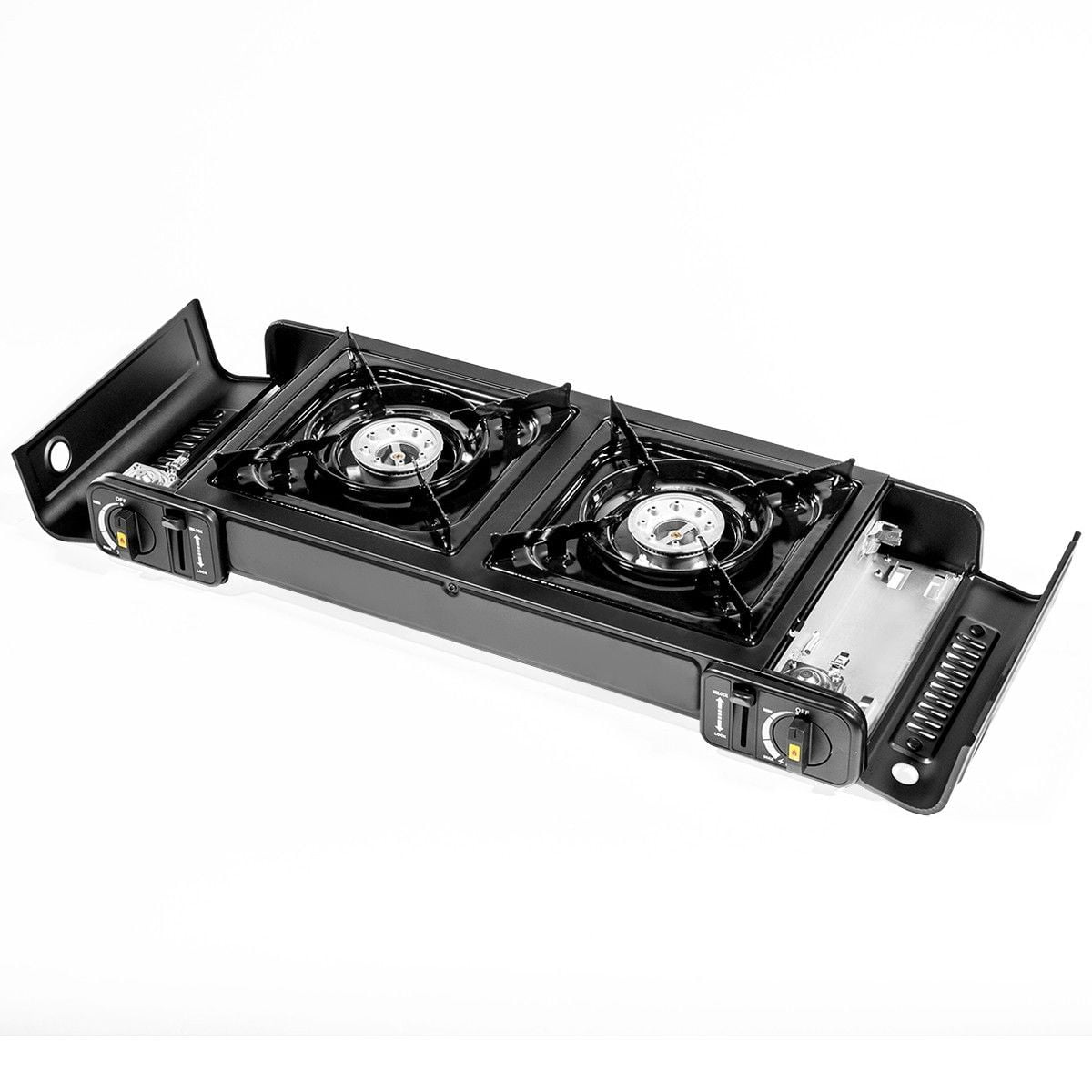 Stark USA 2 Burner Butane Camping Stove: High Quality Material – Non stick BBQ grill and with high quality material surface. Heat output of each burner is 8,000 BTU/Hr, 16,000 BTU totally Convenient Operation Control – Individual control knob for maximum heat regulation, powered by standard 8 oz build-in butane gas canister.(NOT INCLUDE) You can use it quickly and easily in the outdoors Safe and Reliable – Automatic safety switch, gas leakage protection device and over gas pressure safety device are available Easy To Use and Clean – Reliable for camping, outdoor cooking, home emergency kit, etc. Your best choice for emergency cooking preparedness toolkit. Save time and mind in outdoor picnics No Tool Ignition is Needed – Piezo-electric ignition that eliminates the use for lighter/matches per burner in order to ignite flame. It is convenient for you to use it quickly