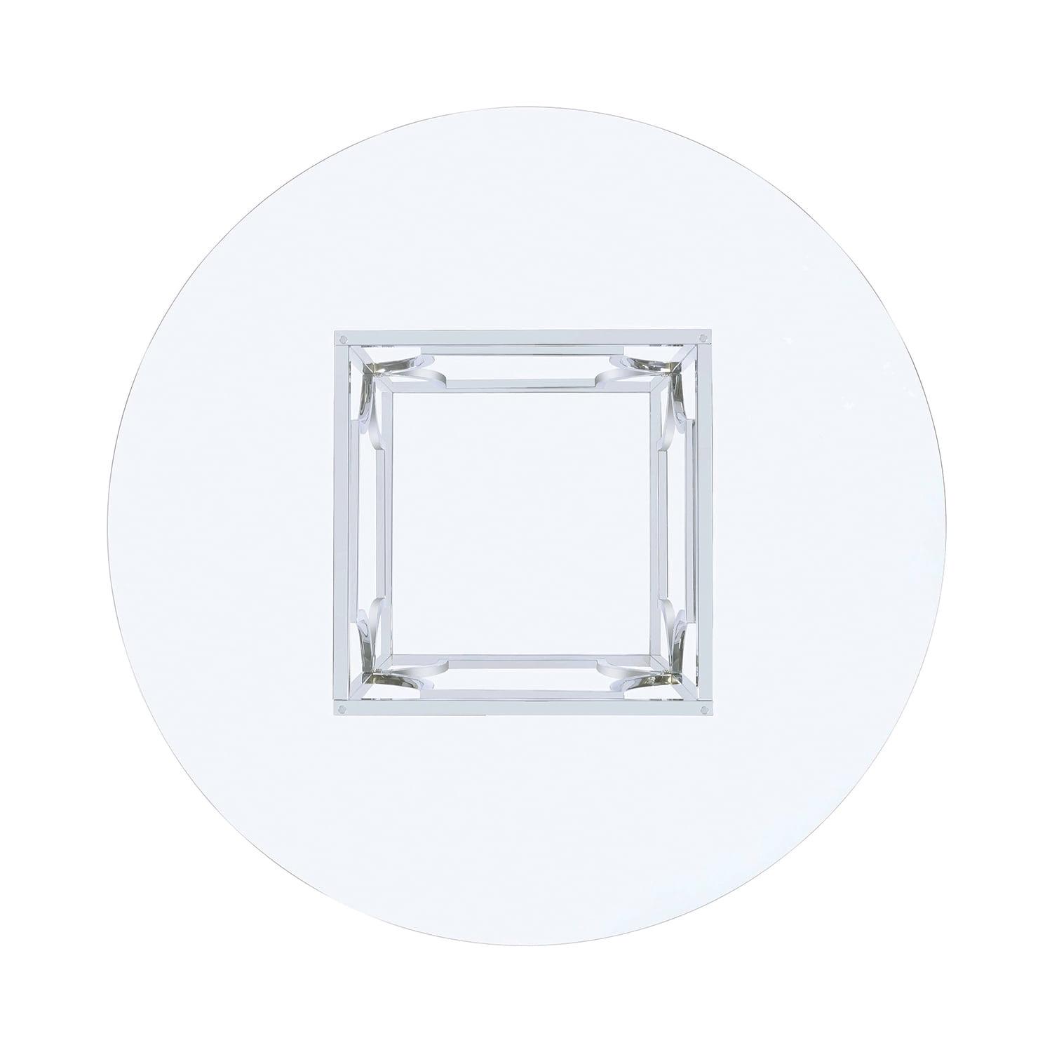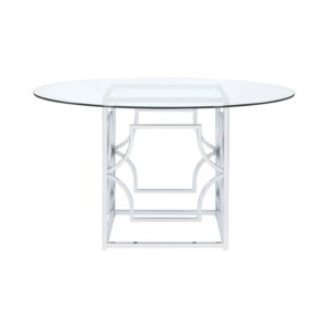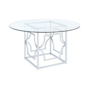 Add a beautiful visual to a dining room with this stunning dining table base. Traditional in style, the metal frame features an openwork pattern. Sharp curves connect to create an airy feel, upgraded by a modern chrome finish. Radiant and metallic, the base enlivens any space with its reflective aura. Top with a round or square glass table top for a showstopping look.