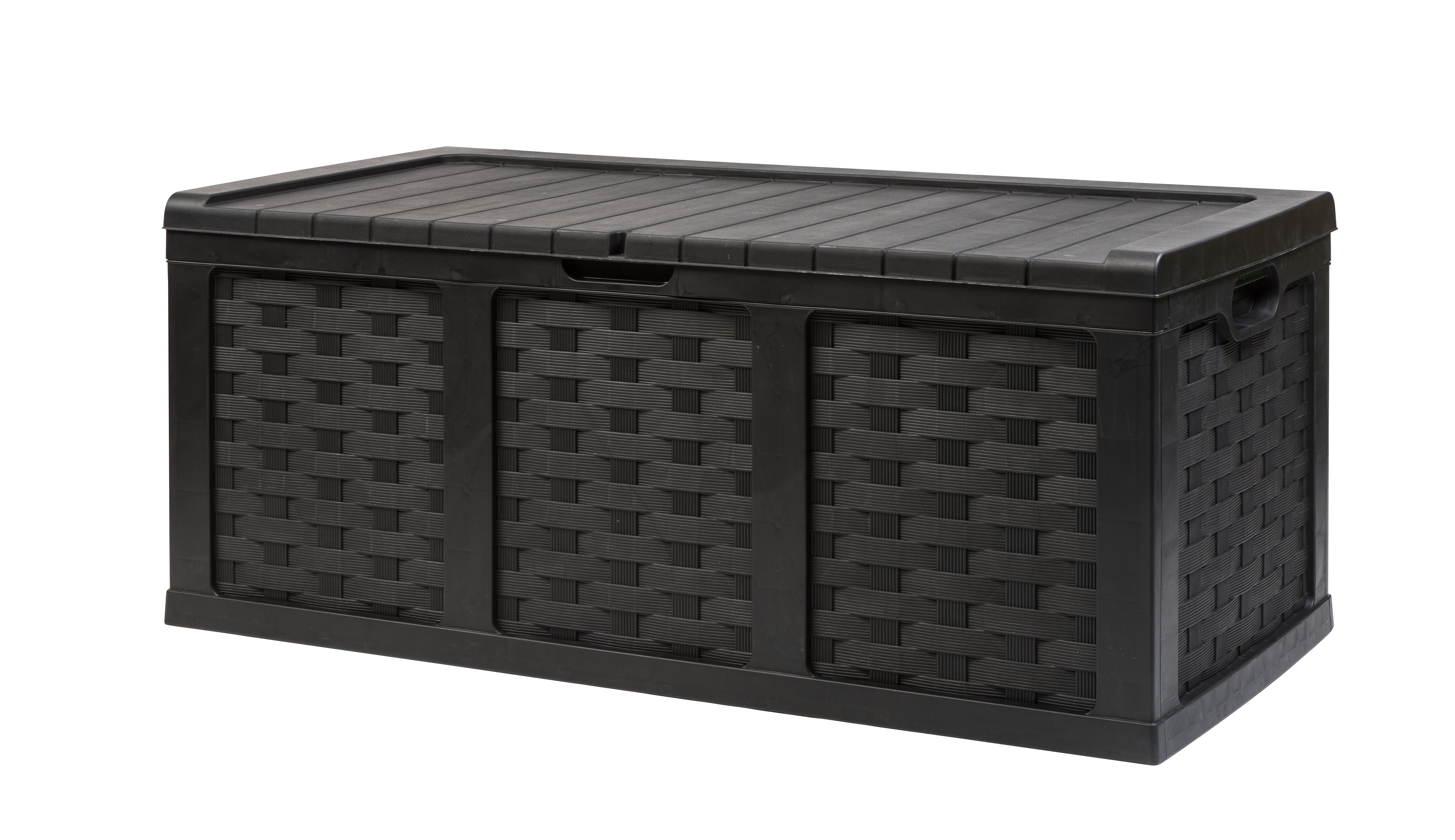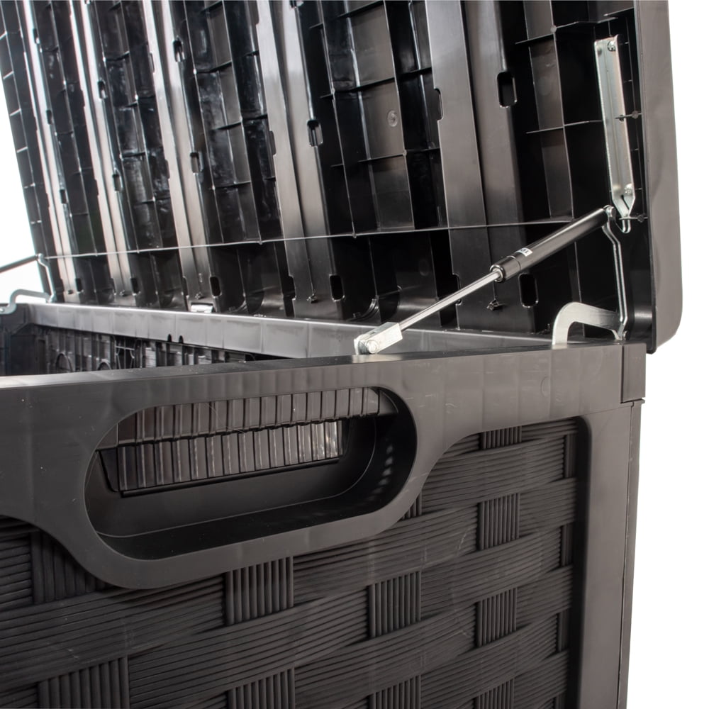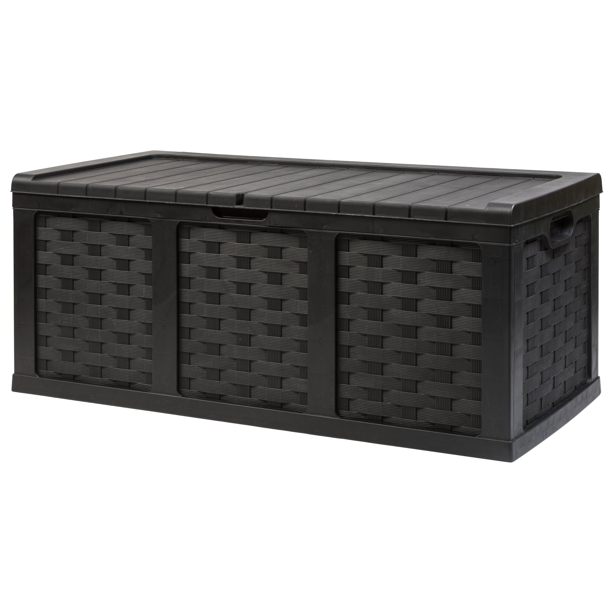 Keep pool toys, towels, tools, gardening equipment, and more inside the Starplast Deck Box. Made of sturdy plastic, it’s waterproof and stands up to the elements, while ventilation allows for airflow and moisture evaporation. A pair of wheels make relocation simple and convenient. With a pneumatic piston, the lid opens and closes smoothly. Add a padlock (available separately) for increased security. This 153-gallon deck box offers generous storage space and is sturdy enough to serve as bench seating. It’s also quick and easy to assemble and has a woven wicker design that coordinates with other outdoor furnishings.