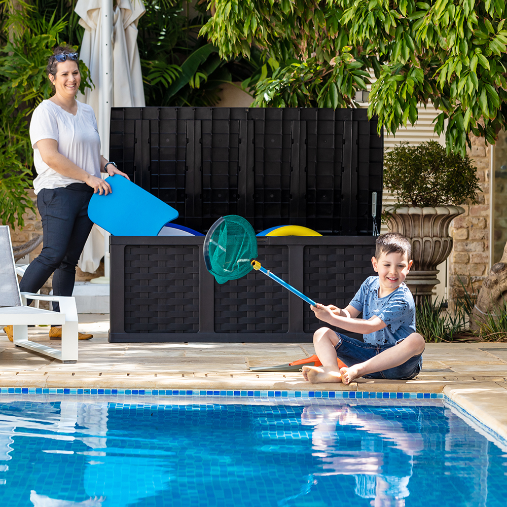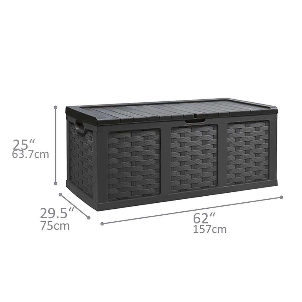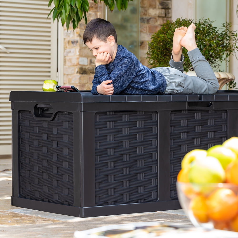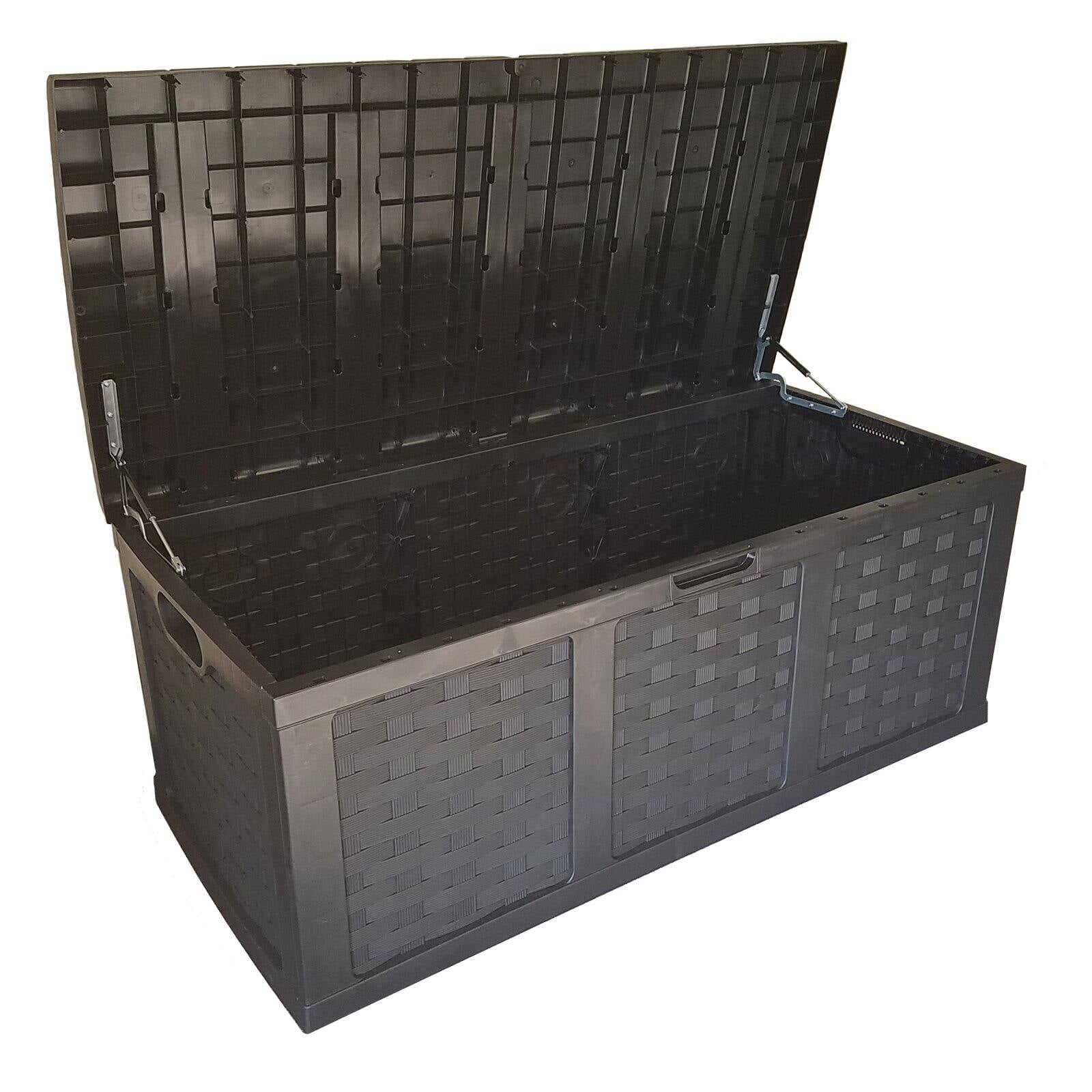 Keep pool toys, towels, tools, gardening equipment, and more inside the Starplast Deck Box. Made of sturdy plastic, it’s waterproof and stands up to the elements, while ventilation allows for airflow and moisture evaporation. A pair of wheels make relocation simple and convenient. With a pneumatic piston, the lid opens and closes smoothly. Add a padlock (available separately) for increased security. This 153-gallon deck box offers generous storage space and is sturdy enough to serve as bench seating. It’s also quick and easy to assemble and has a woven wicker design that coordinates with other outdoor furnishings.