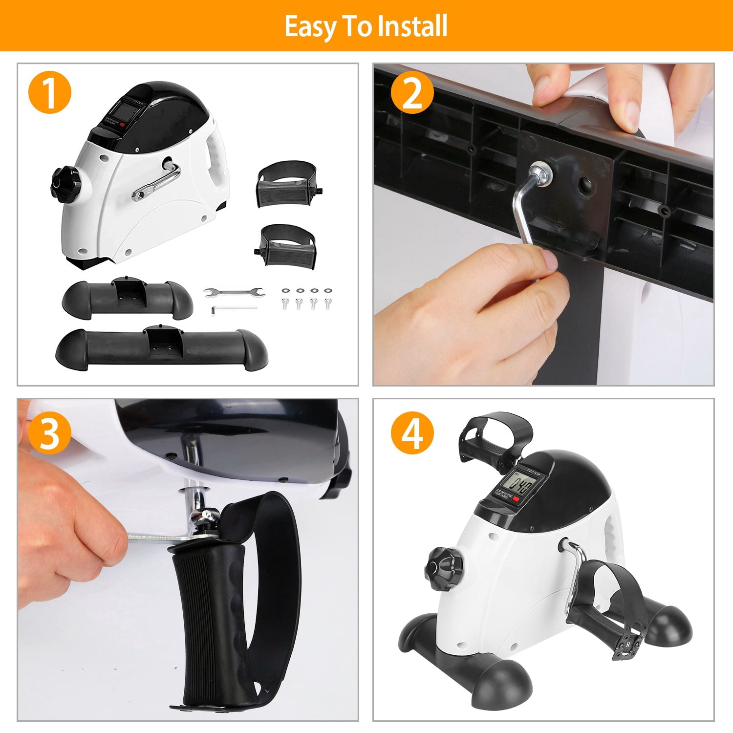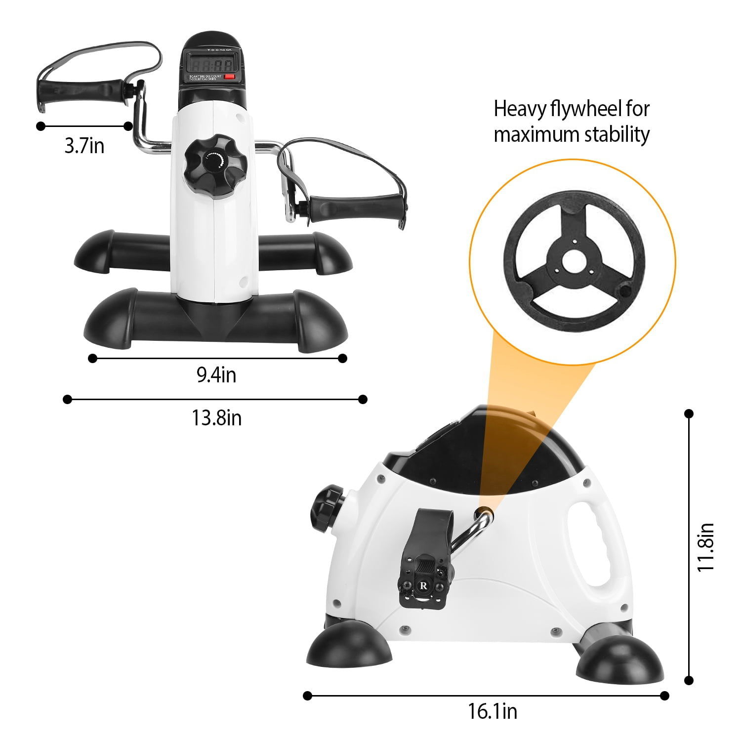 Arm And Leg Exercise: This Mini Trainer Bikes exerciser can be used for arm and leg exercise to target various muscle groups and joints, such as shoulder arms, forearms, hamstrings, calves, hip joints, and so on. Besides, it can also improve cardiovascular health by fastening blood circulation. You can place it on a stable as an arm exerciser or under the table as a leg exercise while sitting. Adjustable Resistance: Freely adjust the intensity level by rotating the tension knob for a customized exercise. You can start with the most comfortable setting for you and increase the resistance as you become fitter and stronger. It’s specially designed for elders and rehabilitation people to perform physical therapy and maintain bodily functions. Safe And Non-slip: Comfortable non-slip foot straps can help fix your feet firmly. They are also flexible to accommodate feet in various sizes via adjusting the screws at the side. The rubberized foot pads help keep the exerciser at place even at the maximum resistance level without scratching floor. Compact And Portable: With a size of 16.1×13.8×11.8in, it can also be easily fitted under the desk to work out as you work, perfect for small space exercising. The portable handle makes it convenient to move and carry for exercising on-the-go. Multifunctional Display: Equipped with a multifunctional LCD display, it keeps track of time, distance, count, calories, and total counts. The easy-to-read screen helps track the progress easily to aid in weight loss. You can reset the data by long pressing the red button. Specification: Product Type: Pedal Exerciser Color: Black+White Material: ABS+Steel Screen: 5.5cm/2.2in Battery: 1×1.5V AAA Battery (included) Pedal Exerciser Size: 41x35x30cm/16.1×13.8×11.8in Pedal Exerciser Weight: 3.45kg/7.61lbs Package Size: 41×32.5x19cm/16.1×12.8×7.48in Package Weight: 3734g/8.23lbs Package Contents: 1 x Pedal Exerciser (disassembled) 1 x User Manual 2 x Wrenches 4 x Screws 1 x User Manual Tags: Under Desk Bike; Pedal Exerciser; Exercise Cycle; Exercise Bike; Arm Exerciser; Leg Exerciser