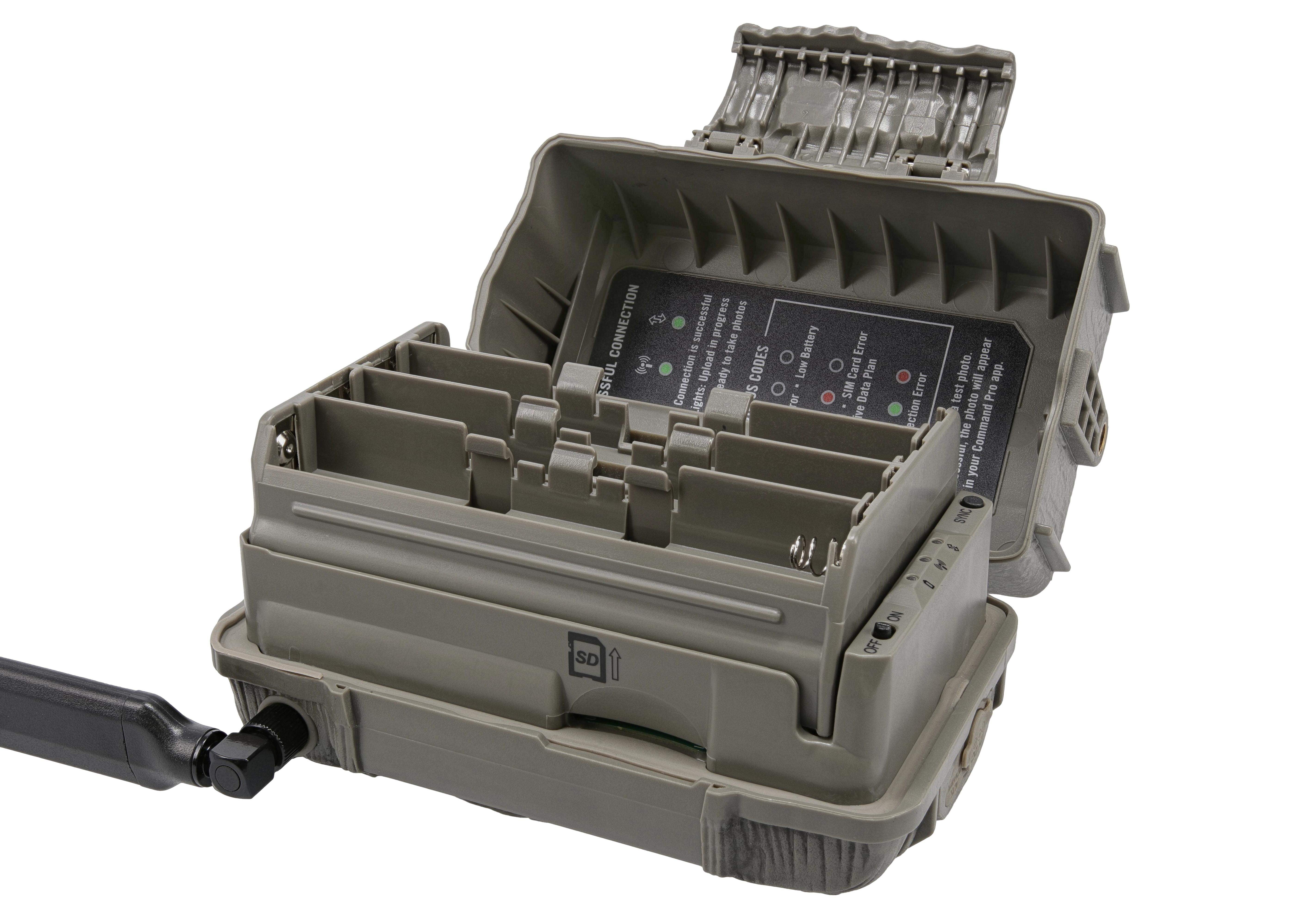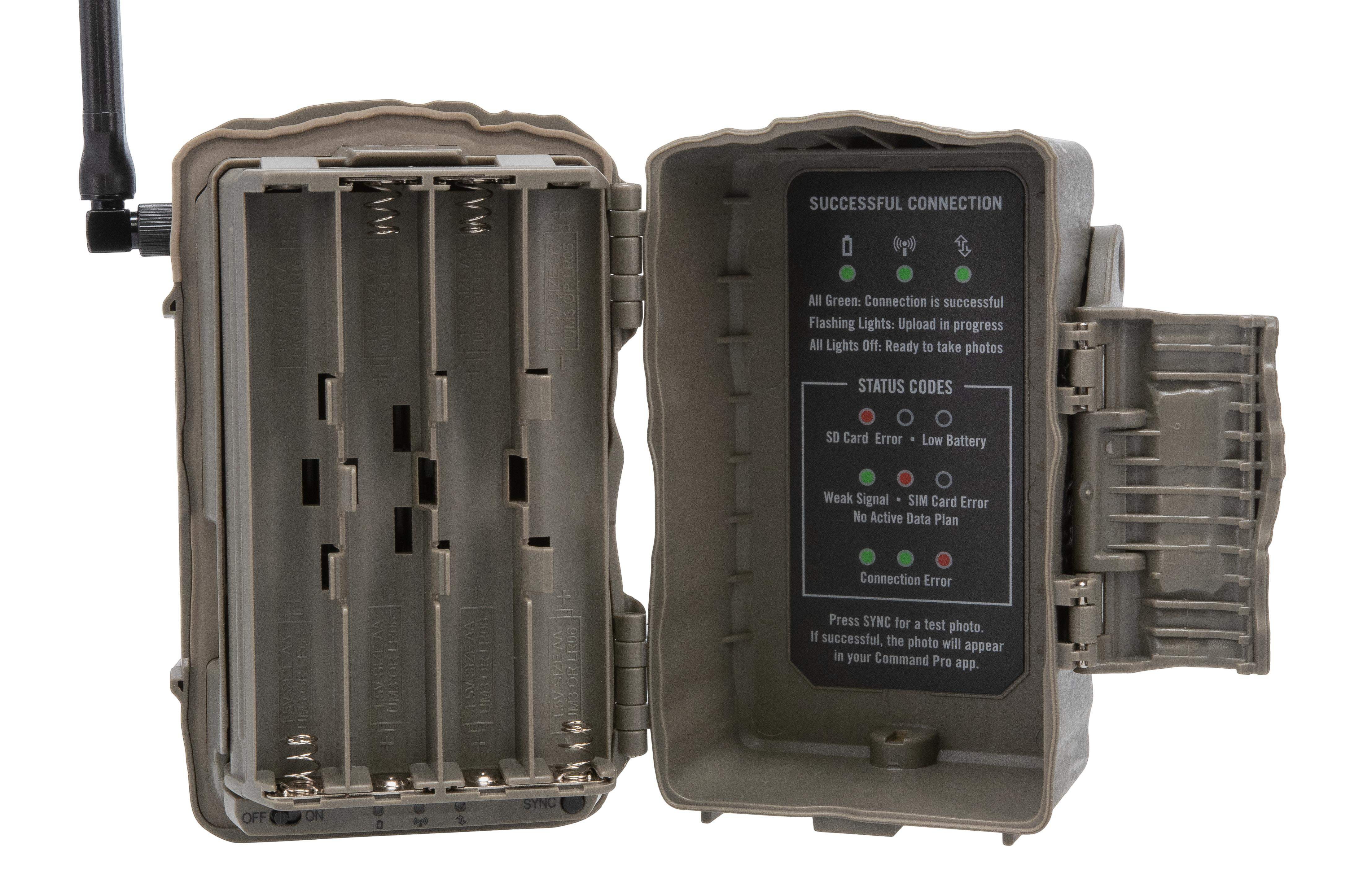 Now with an expanded battery capacity for a total of 16 AA batteries (not included), the Fusion™ MAX Cellular Trail Camera drastically improves your efficiency afield. This camera is compatible with Stealth Cam’s assortment of FieldMAX rechargeable lithium battery cartridges and solar panels that provide an alternative power supply to setups in any location. Features two pre-installed SIM cards and our Automatic Network Coverage feature that continuously monitors both AT&T and Verizon signal strength, ensuring automatic connection to the strongest network for connectivity you can count on via the Command Pro app. On Demand photo and video capture takes and sends crystal-clear photos and videos with audio in real time, while the 80-foot detection and infrared flash range with 0.4-second trigger speed captures one to six images in burst mode. Durable weatherproof housing and integrated lock latch. ¼-inch threaded insert and 12-volt DC auxiliary jack for adding mounting hardware.