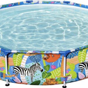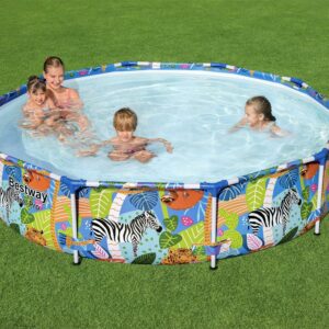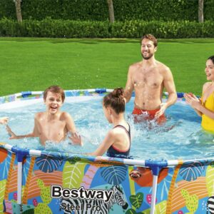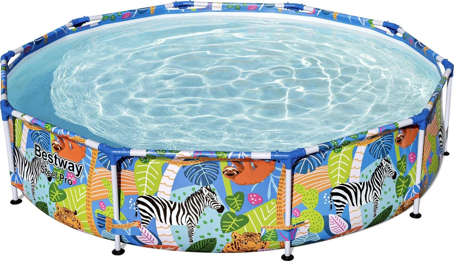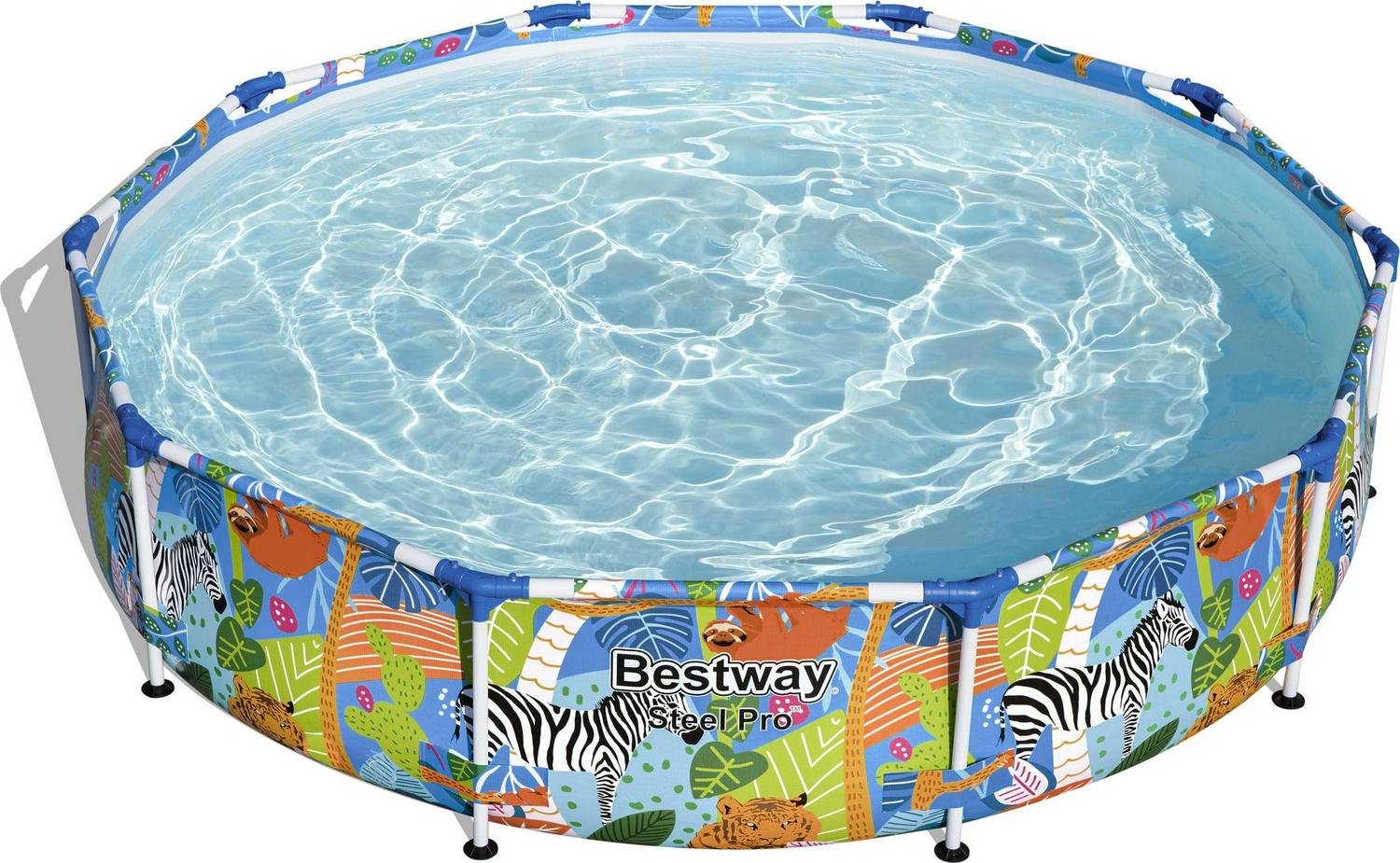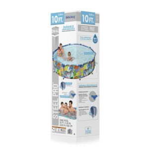 It s about to be one WILD summer! This Bestway Steel Pro Above Ground Pool offers an ultra durable option that will have your family splashing out in the sun in no time. Durable Construction: The durable steel frame is equipped with our FrameLink System for a sturdy and secure pipe connection. The frame connectors also prevent metal-on-metal contact to ensure corrosion and rust resistance. The sturdy DuraPlus liner is made out of an ultra-durable 3-layer material that is reinforced for strength and puncture-resistance. DuraPlus is 15% more tear resistant, 33% more stretch resistant and 83% more puncture resistant than standard PVC, ensuring your pool will last summer after summer. Simple Setup: This attractive pool is very simple to set up and take down for off-season storage. No tools are required, and a hose connects to the built-in flow control valve to quickly and easily drain away pool water. Spend your summer on the water in this Bestway Steel Pro pool!