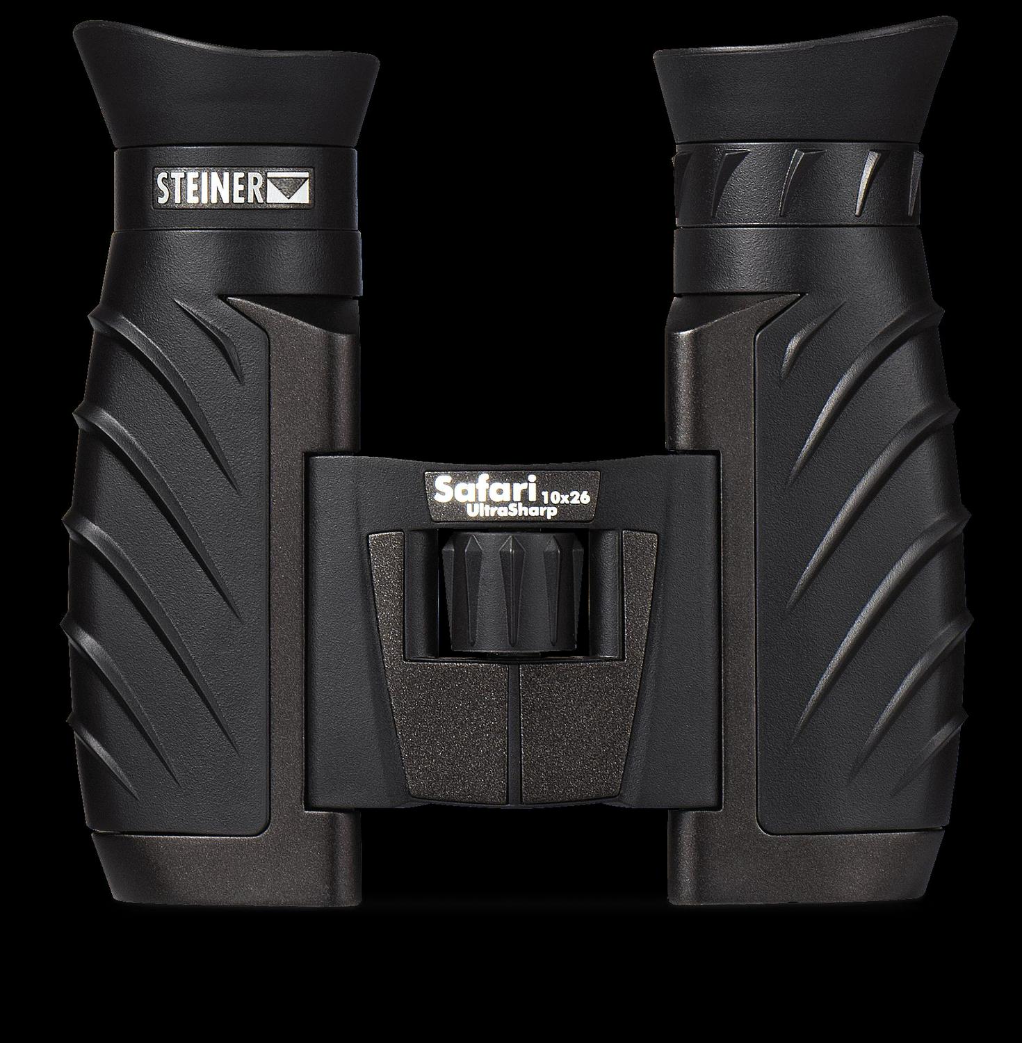 Every traveler, sports enthusiast, and active participant in anything needs a good pair of binoculars to see, understand and enjoy more. The Safari Ultrasharp Series binoculars are the ones you need. Steiner s world-renowned image clarity, accurate color, low-light capability and field-proven toughness ensure maximum performance from your optics and more pleasure from your pursuit of adventure. Versatile combination of high power and wide field of view, a great choice for your daypack, glove box or birding stand. 10x26mm and includes case, cleaning cloth, neck-strap, objective covers, rain guard, and shoulder straps.