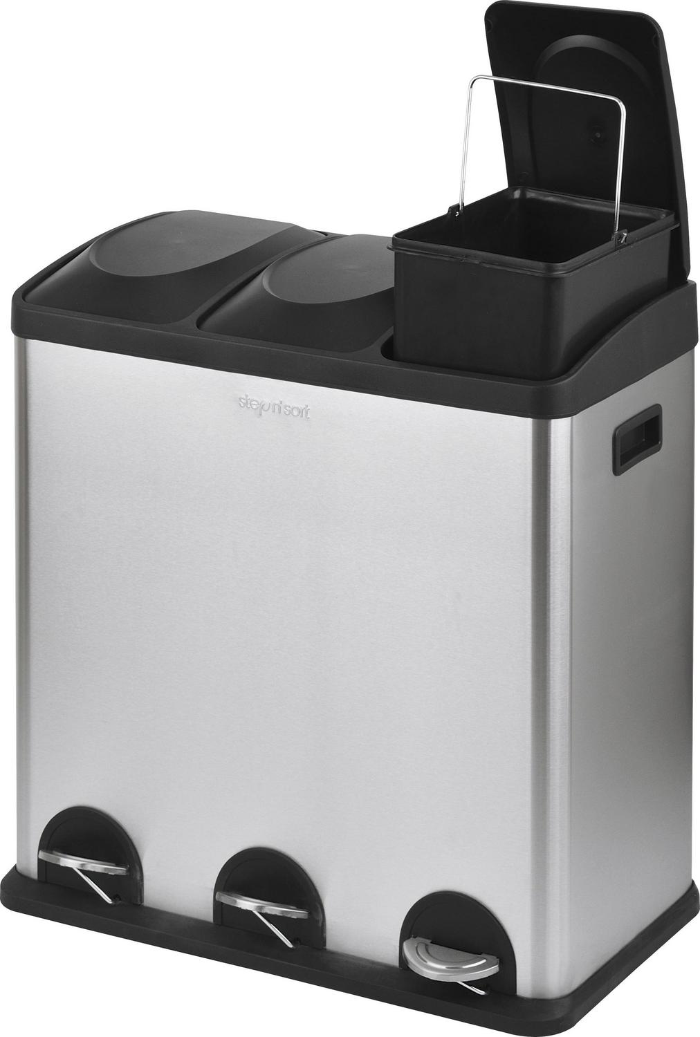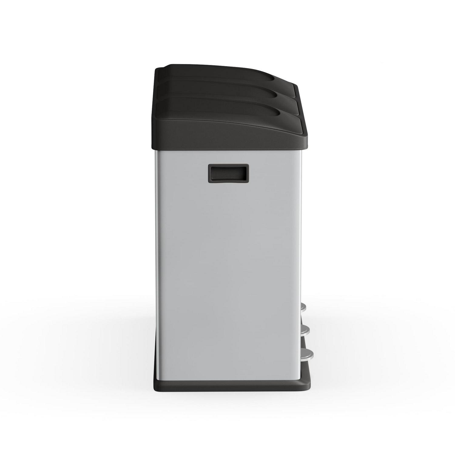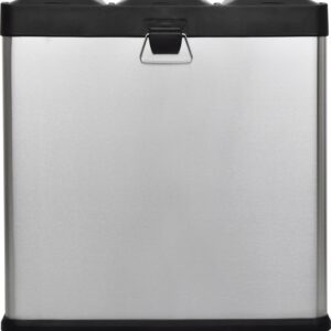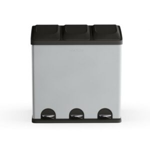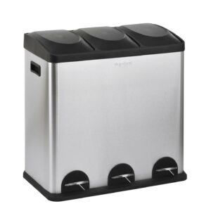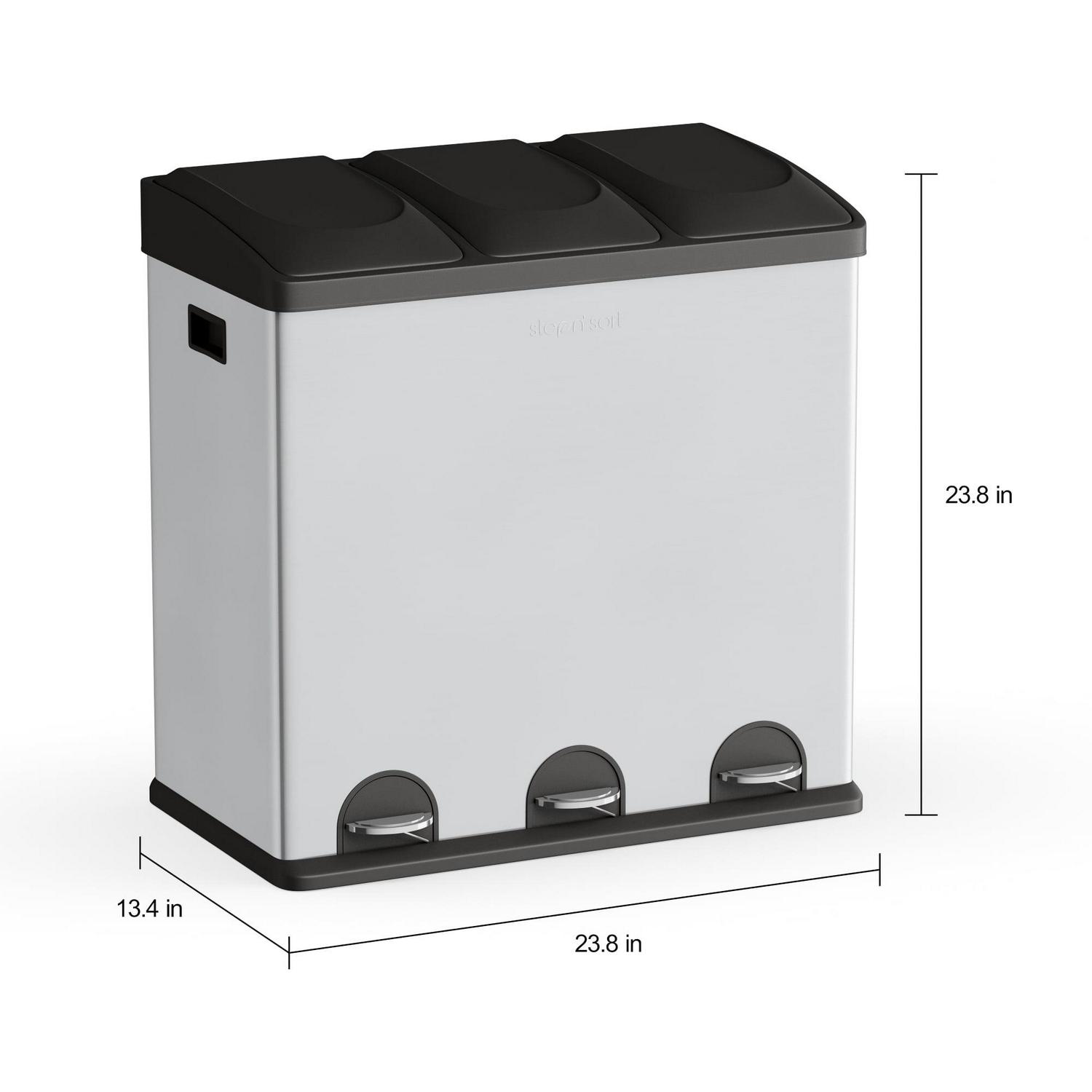 Cut down on the litter with this Step N’ Sort 16-Gal 3-Compartment Stainless Steel Trash and Recycling Bin. It provides a convenient solution for waste, recycling and storage needs. It features three removable containers with attached metal handles. Constructed with a heavy duty frame, this stainless steel bin features individual hands-free step pedals that raise and lower the lids for easy placement and removal of the stored contents. You can also use the recycling bin to sort recyclables, garbage, laundry detergent or dog food. Place either an 8- or 10-gallon trash bag in each of the compartments or use them on their own. This unit has a sleek exterior and a rectangular shape that fits beautifully into many kitchen decors.