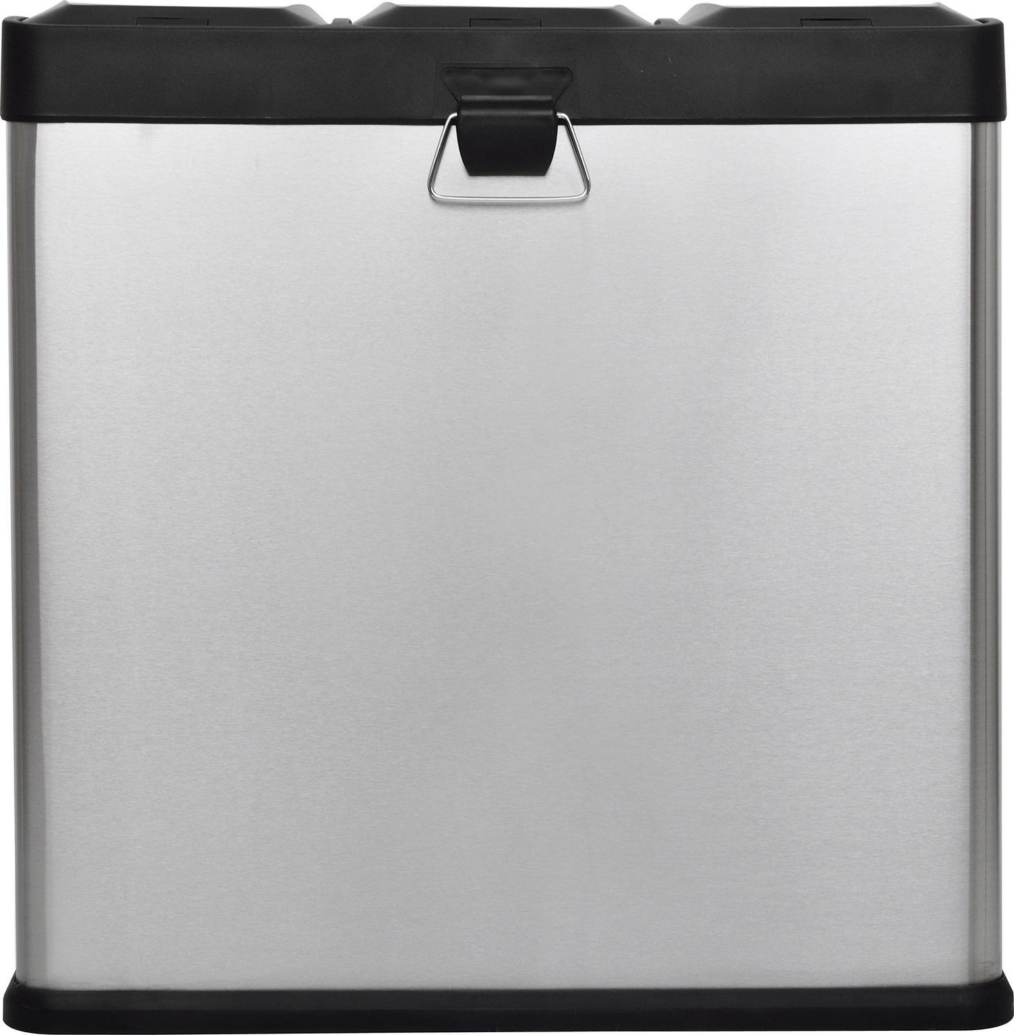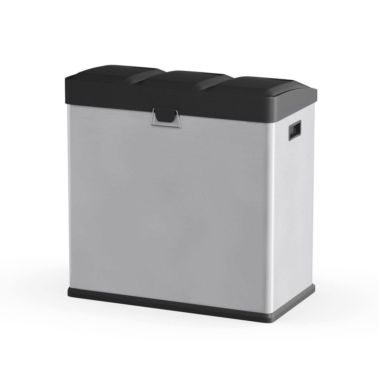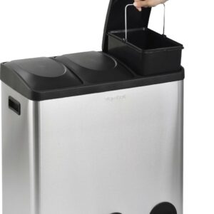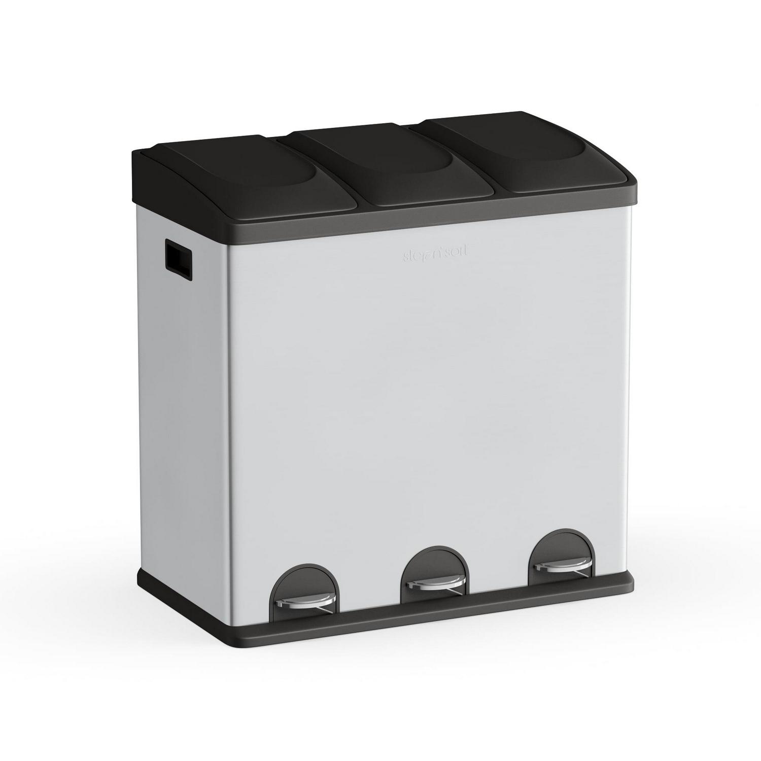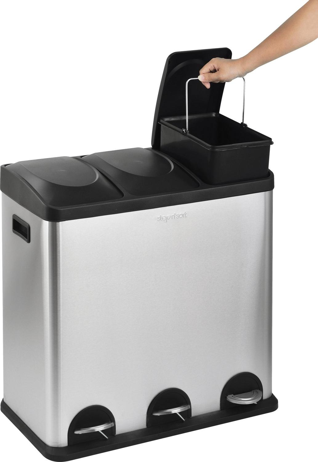 Cut down on the litter with this Step N’ Sort 16-Gal 3-Compartment Stainless Steel Trash and Recycling Bin. It provides a convenient solution for waste, recycling and storage needs. It features three removable containers with attached metal handles. Constructed with a heavy duty frame, this stainless steel bin features individual hands-free step pedals that raise and lower the lids for easy placement and removal of the stored contents. You can also use the recycling bin to sort recyclables, garbage, laundry detergent or dog food. Place either an 8- or 10-gallon trash bag in each of the compartments or use them on their own. This unit has a sleek exterior and a rectangular shape that fits beautifully into many kitchen decors.
