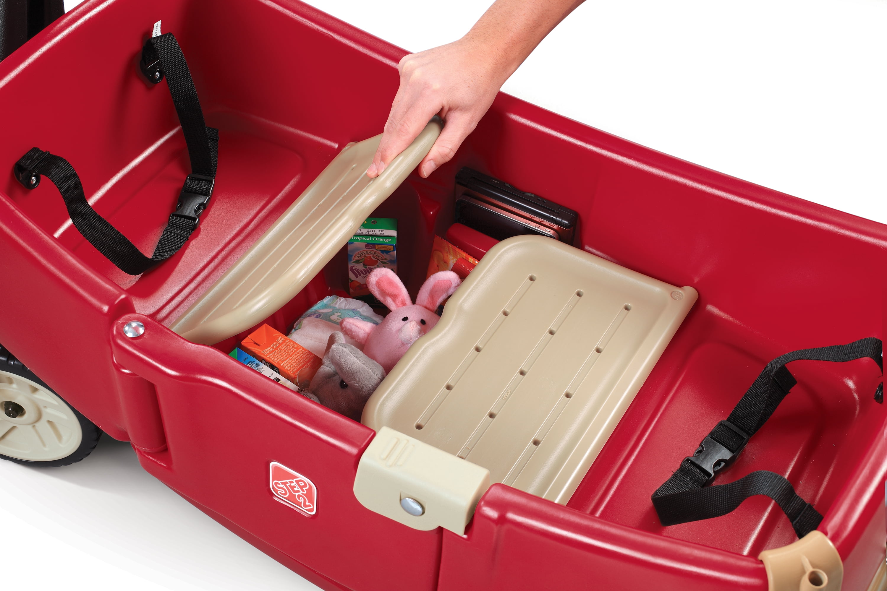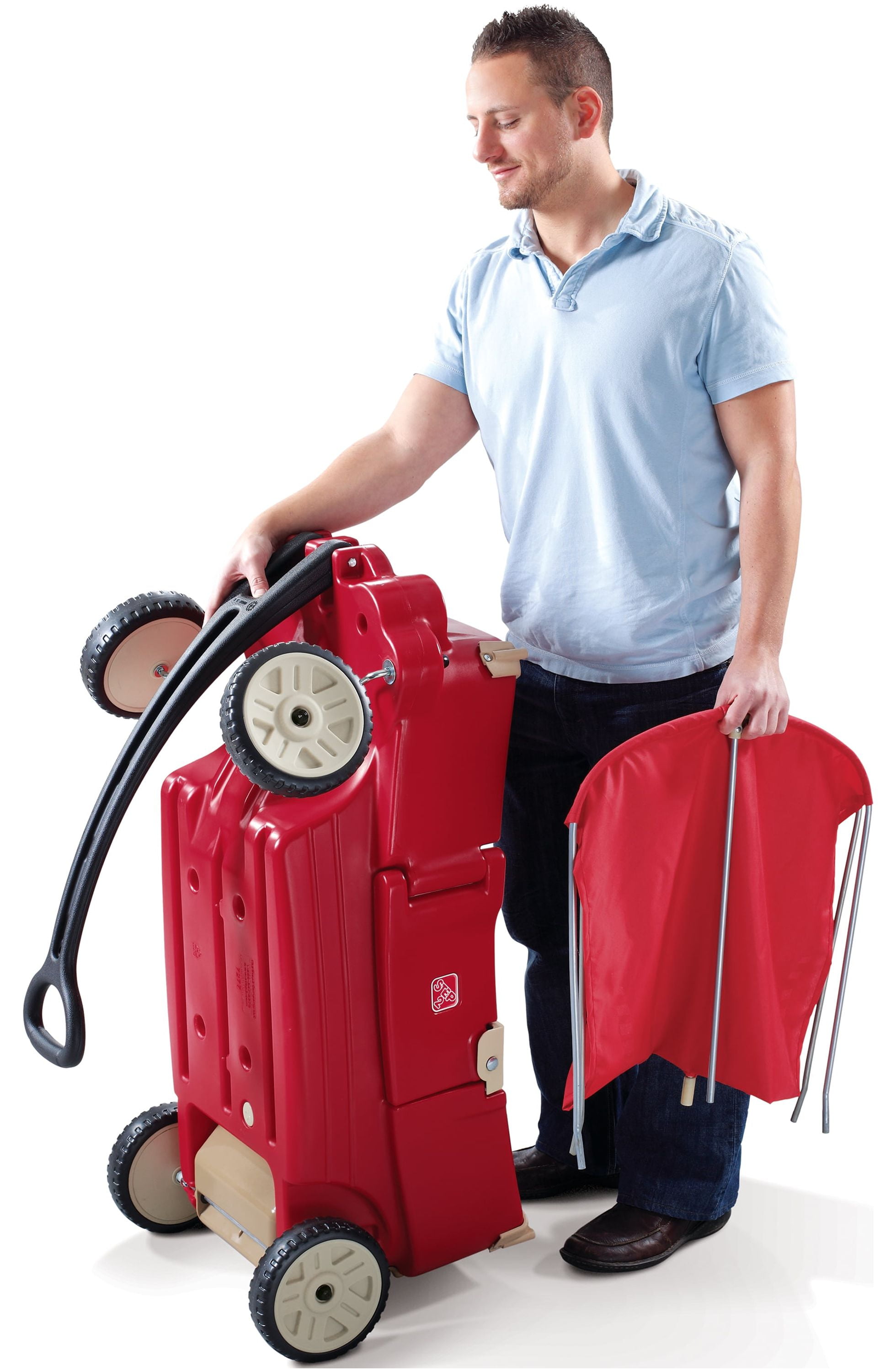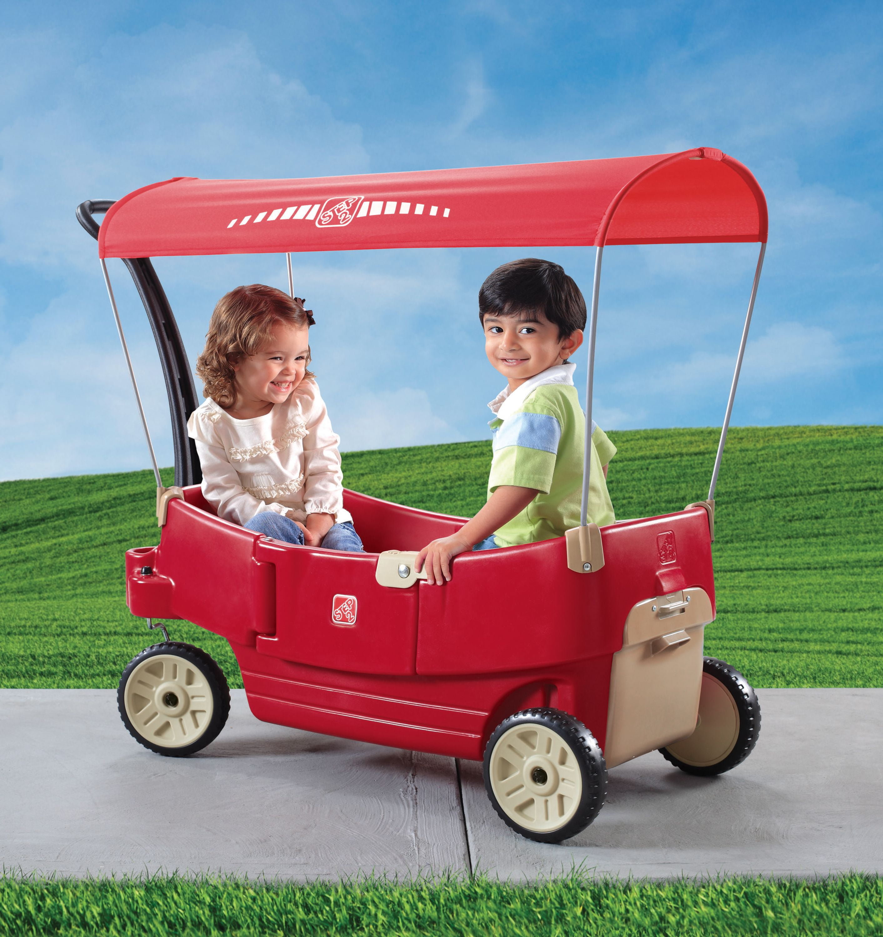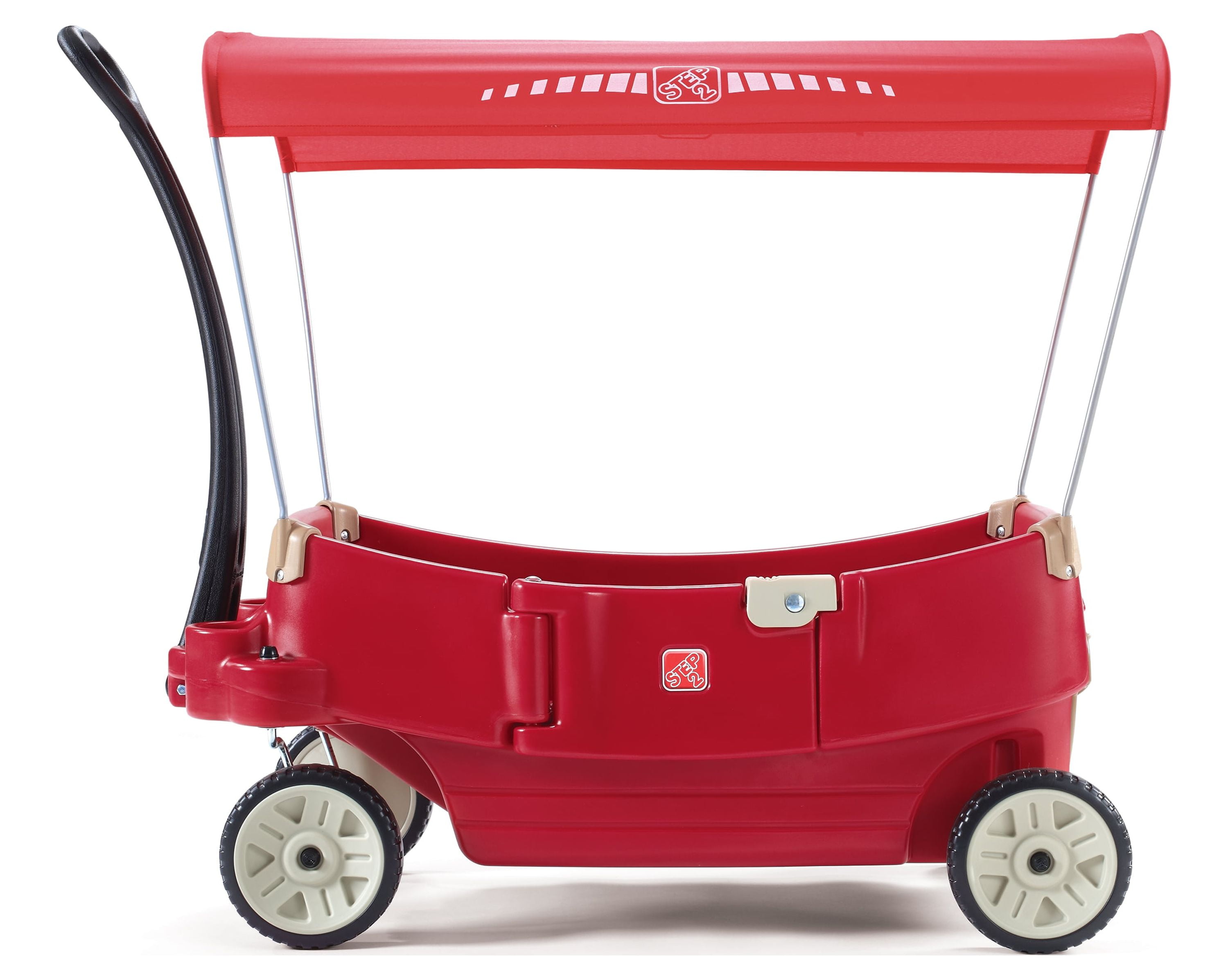 Step2 All Around Canopy Wagon: Removable canopy for shade Seats flip down to create a flat bed or table Extra-long, easy-pull handle Super quiet wheels Easy-access door Features 6 cup holders Extra storage under the back end of the wagon Weight capacity of 75 lbs Assembly required Dimensions: 19.5″L x 41″W x 40.5″H