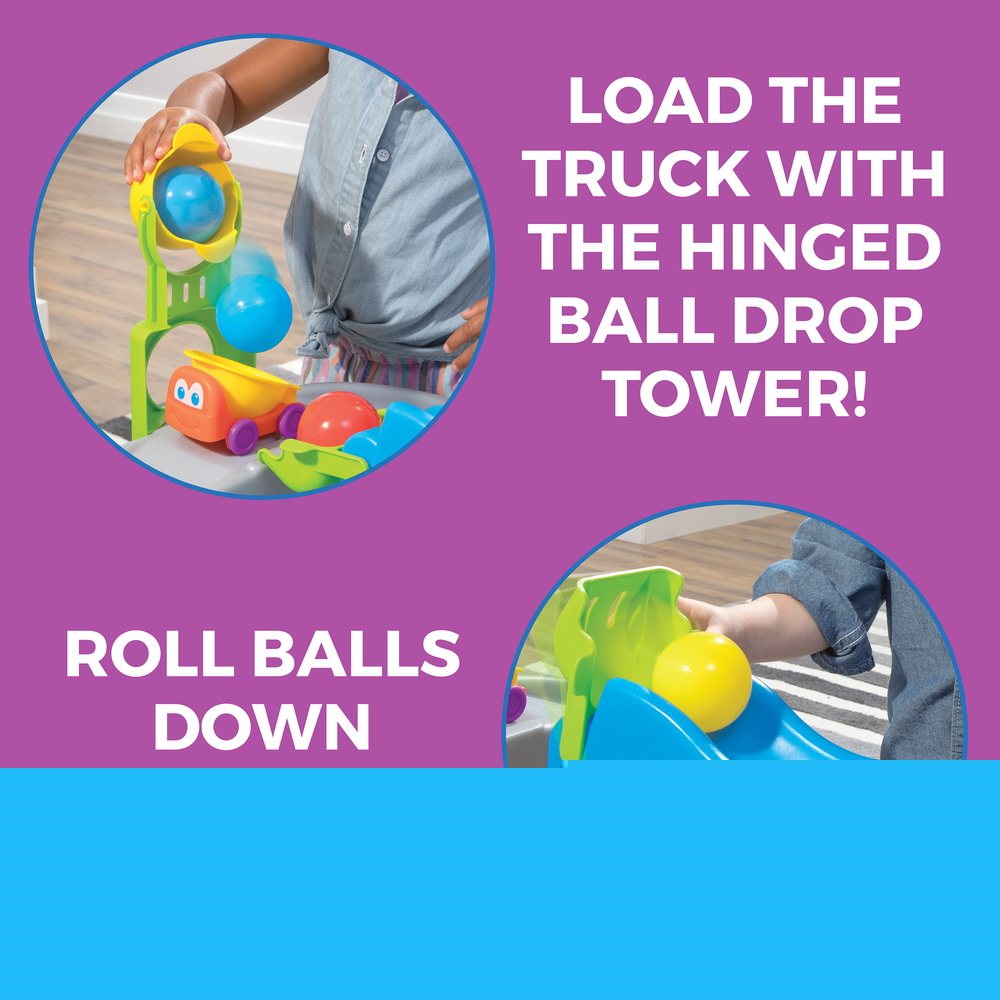 The Step2 Ball Buddies Trucking and Rolling toddler ball play and activity toy is a must have for any toddler s toy room! Up and down, and around the bend! Send the Ball Buddies on their next adventure on this indoor kids activity table full of challenges like curves, tunnels, and hills. Stop the Ball Buddies dump trucks at the top of the activity table s hill to pick up cargo, then send them on a ride around the track! Take a shortcut through the tunnels and sit under the track to use the release levers to let a play ball drop. Features like the clicking gates, ball-picker tongs, and hinged ball drop tower challenge fine motor skills as little ones play. The open design of the ball play table allows for engaging social play and practice in sharing as multiple kids can go truckin and rollin together. Lastly, all Step2 products come with a limited warranty!