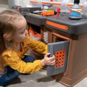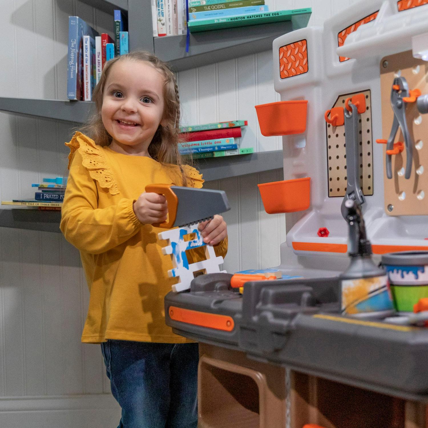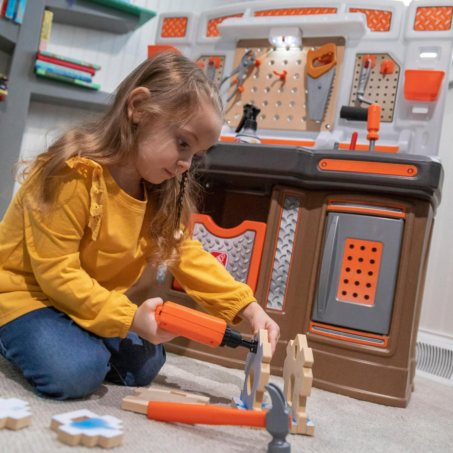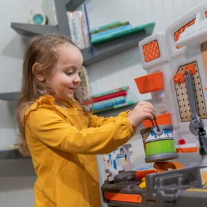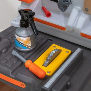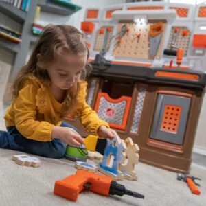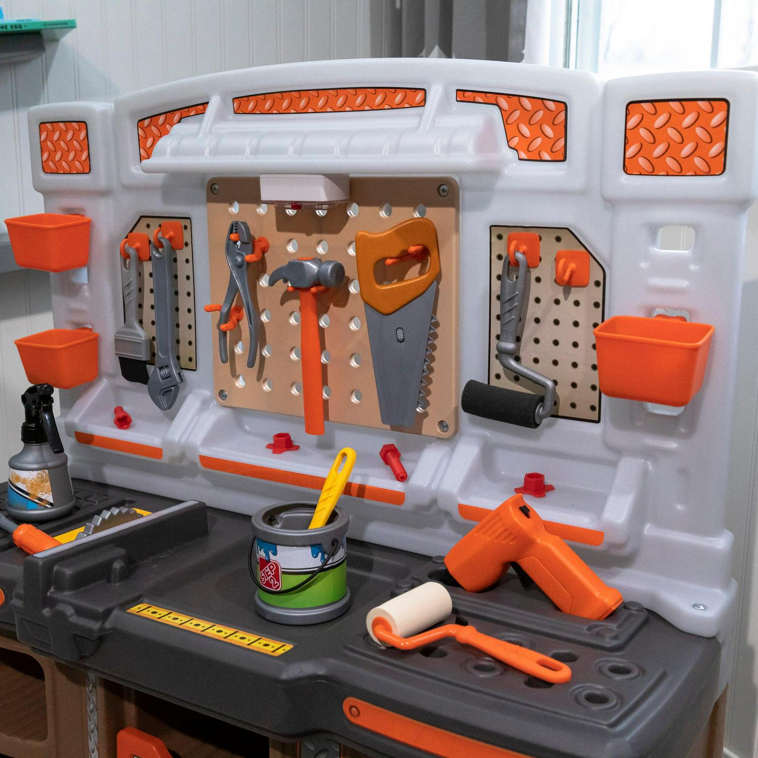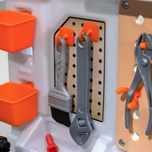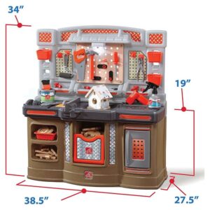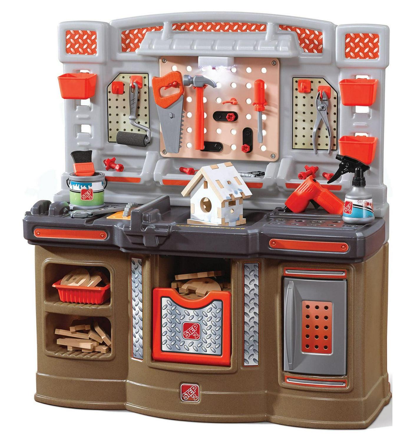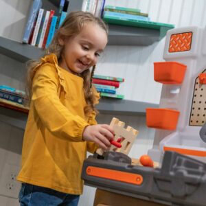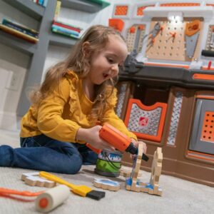 From pretend woodworking to carpentry, little ones have everything they need to build big things with the Big Builders Pro Workshop by Step2. Whatever they imagine, they can build with this kids workbench playset. The variety of pretend equipment in the 45-piece accessory set makes anything possible. Build the included birdhouse and paint it with the included paint brush, roller or spray bottle and watch it change color! This toddler workshop offers realistic accessories such as a handsaw, screw driver, hammer and more! The play enjoyment and realism include storage options, power drill with real sounds, turn on the overhead light and a spring action vise. As your toddler plays with the Big Builder Workbench your little boy or girl will develop fine motor skills using the hammer, saw, and drill. The Step2 workshop was designed for children ages 3 and up. Lastly, this tool bench was built with sturdy plastics and comes with a 2-year limited warranty!