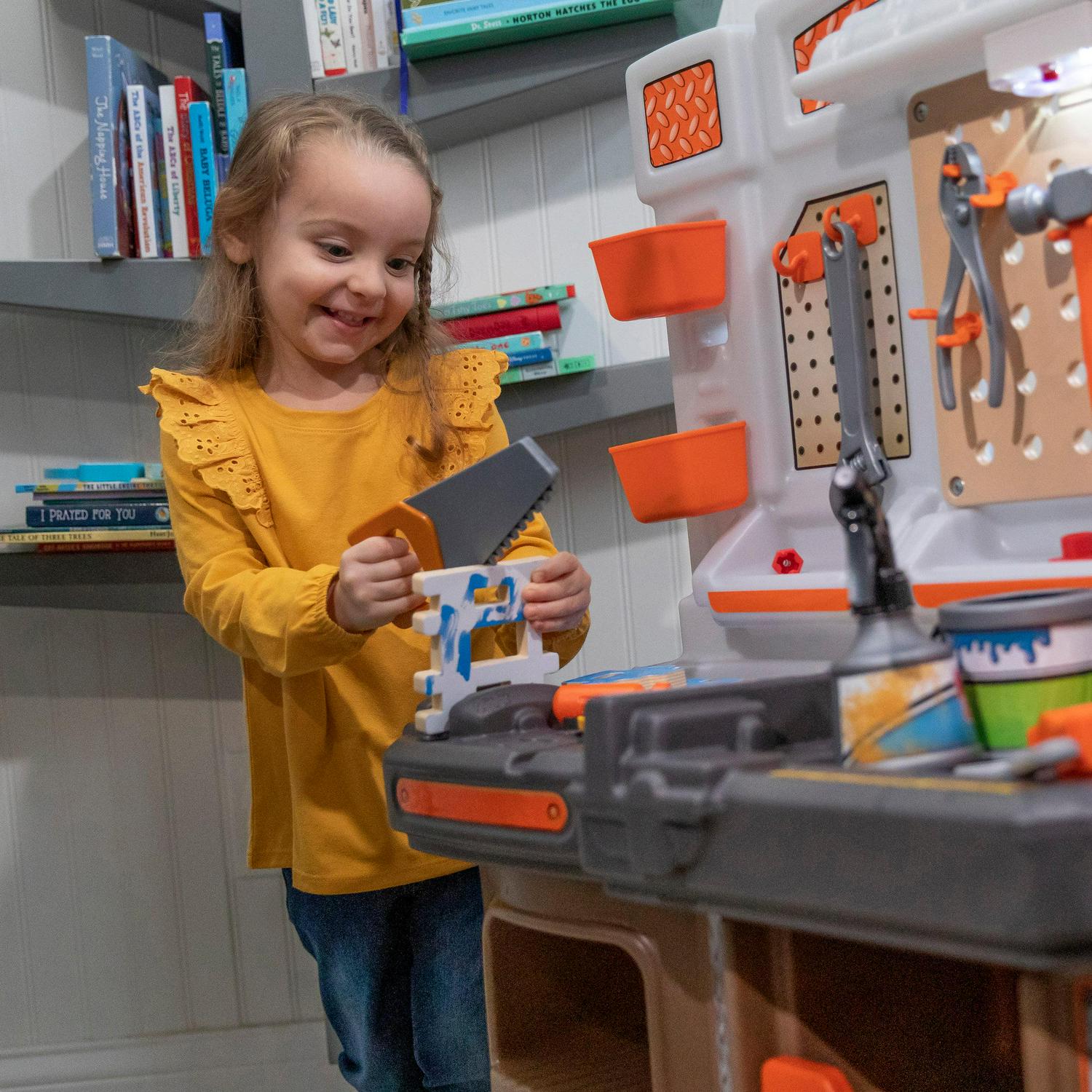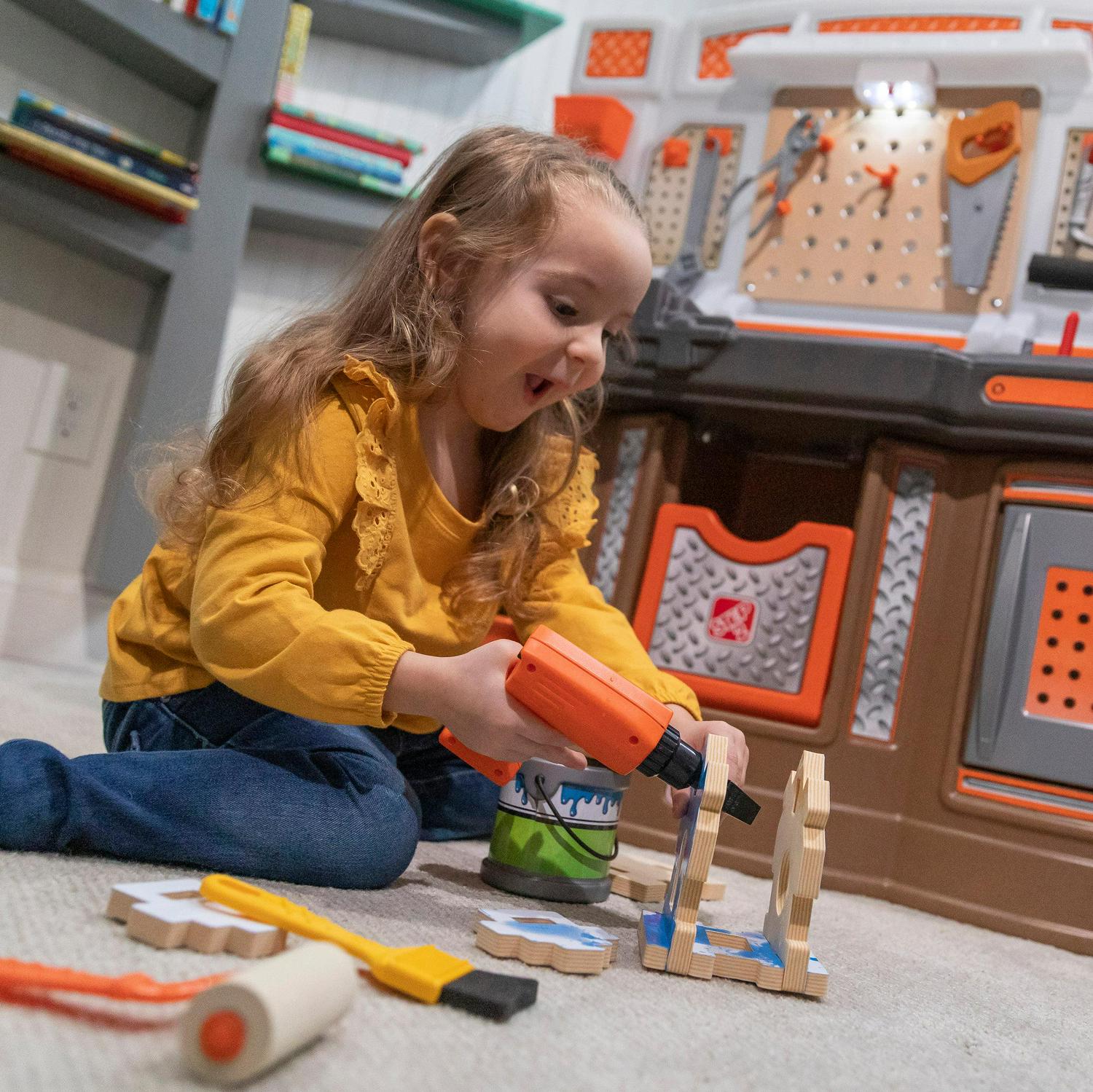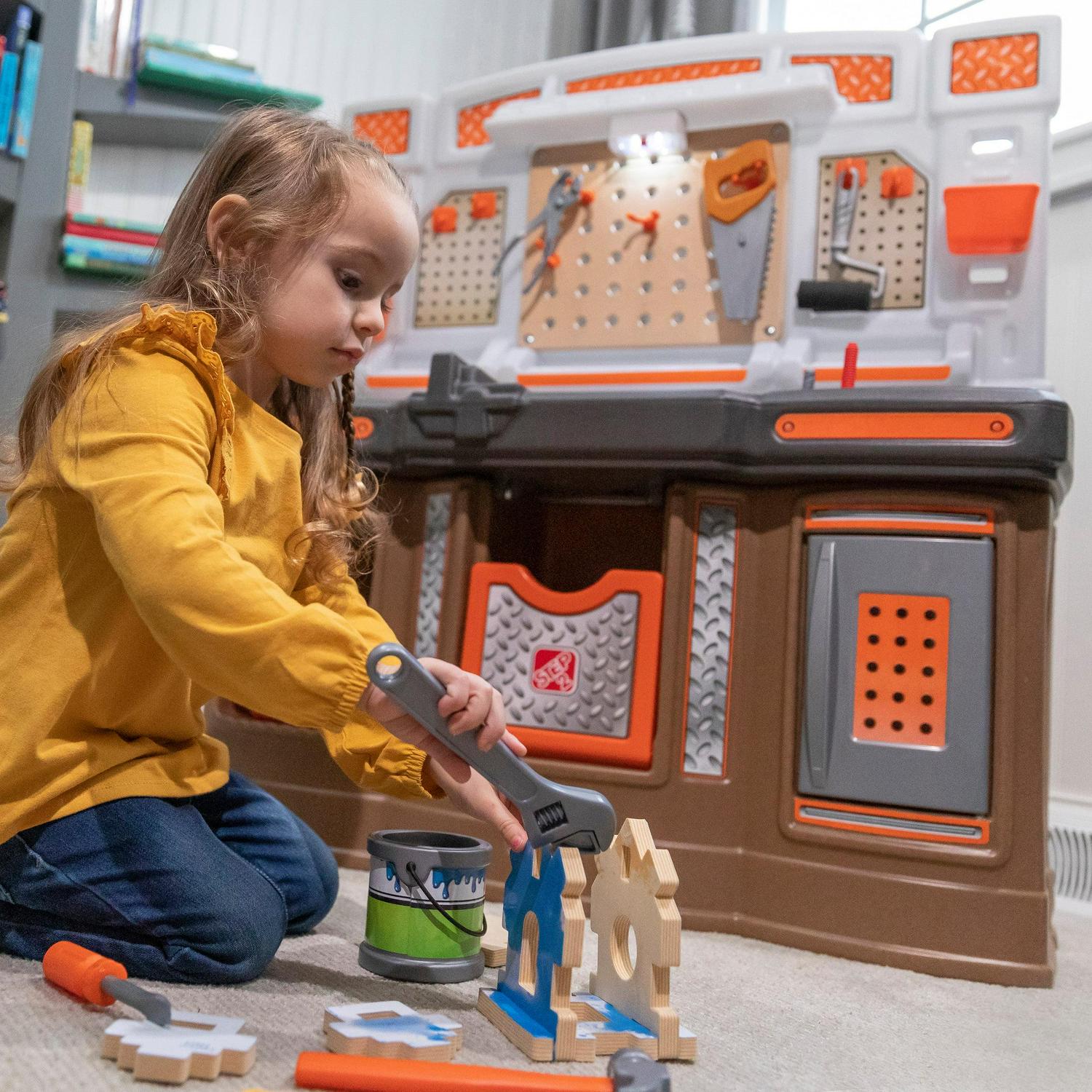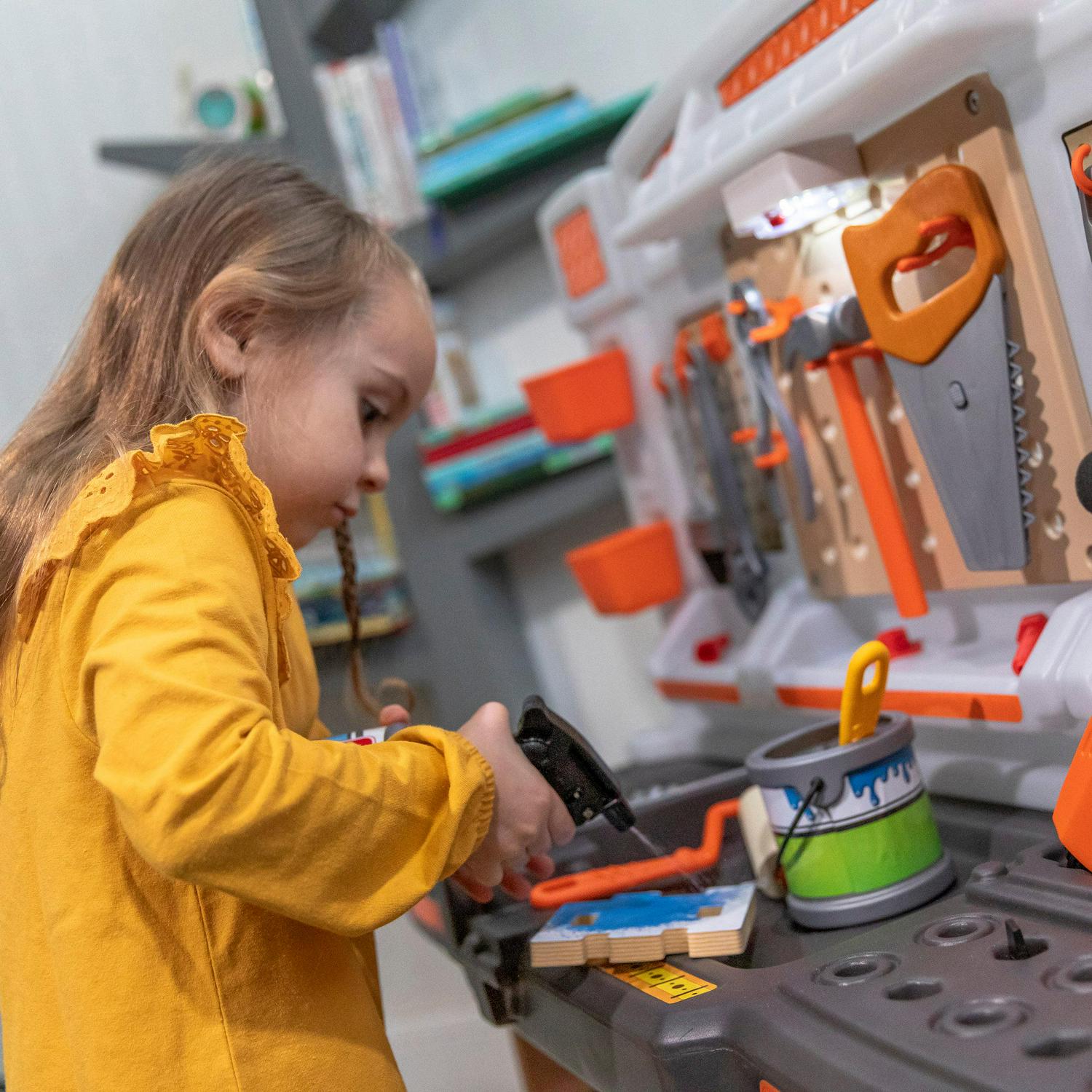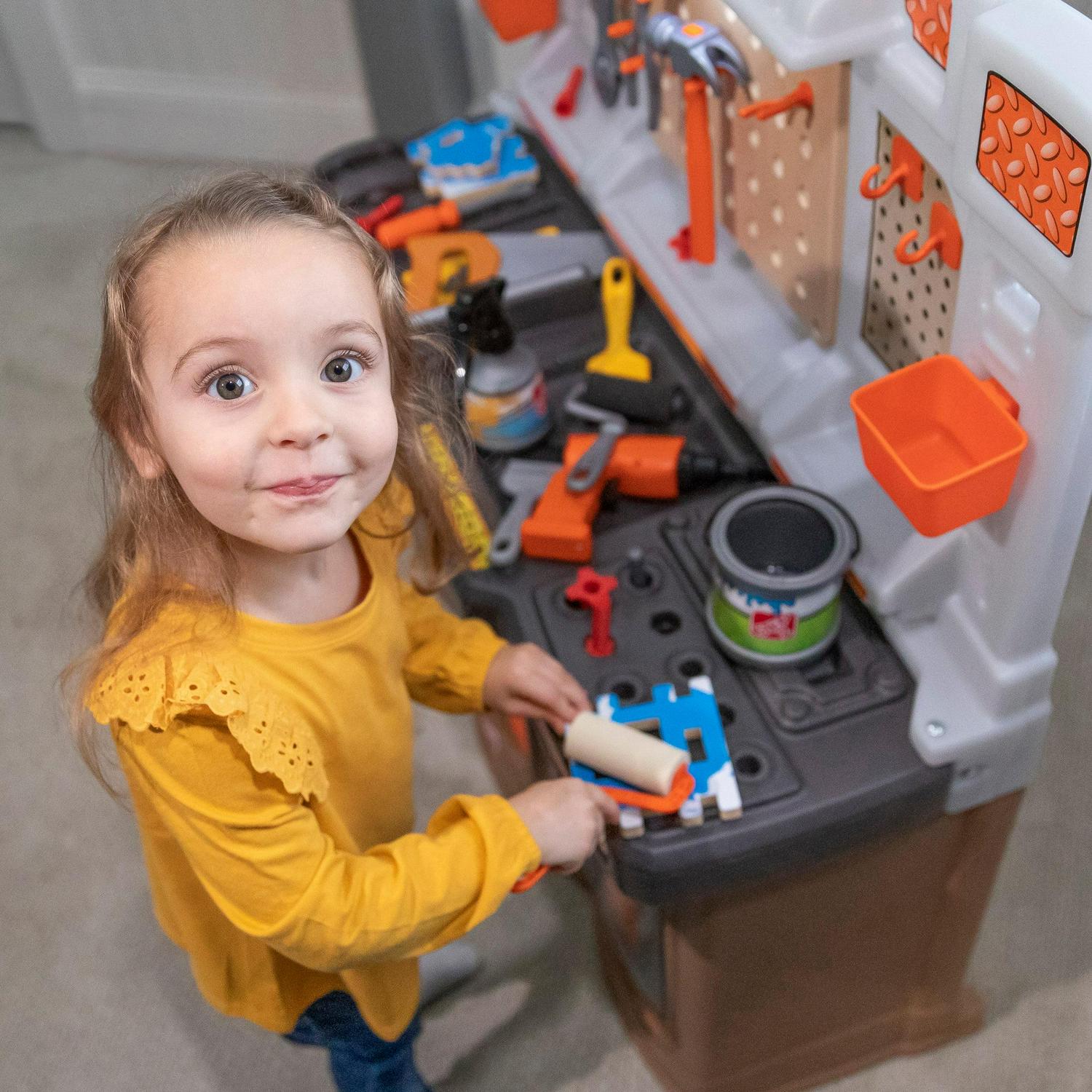 – In the box: Workbench set with working light and 45-piece accessory set including birdhouse building pieces, pretend painting supplies and toolkit, and more!