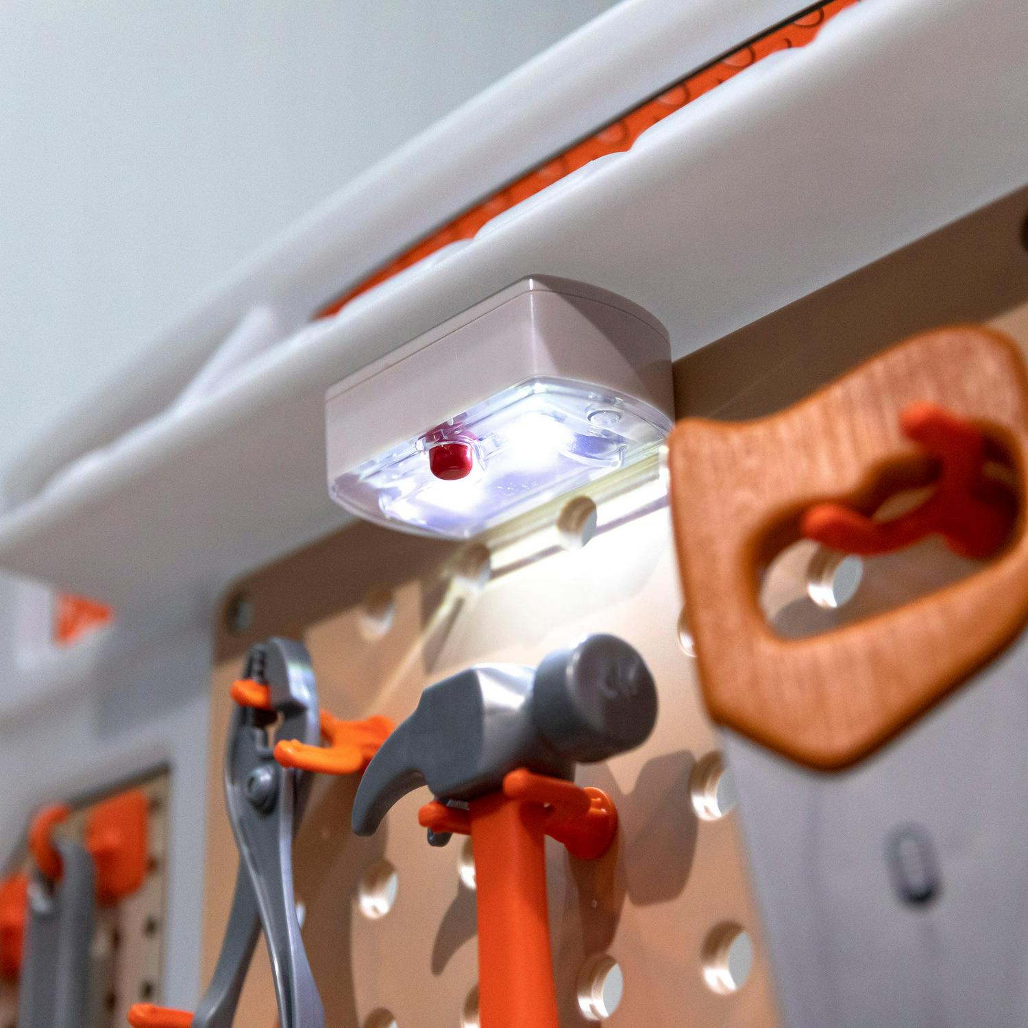 – Electronic drill, overhead work light, and built-in pretend table saw mimic real workbench necessities (electronic features require 4 AA and 3 AAA batteries, not included).